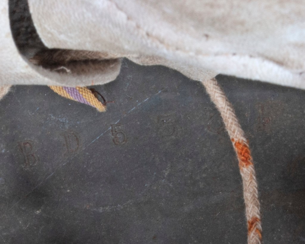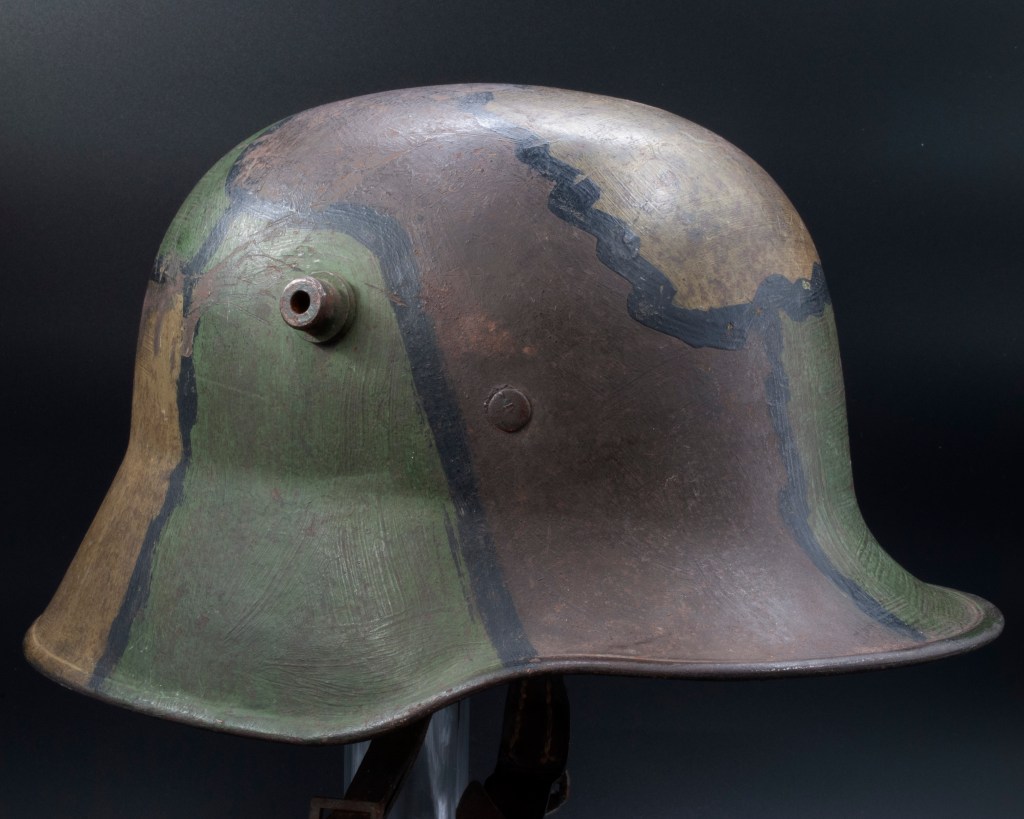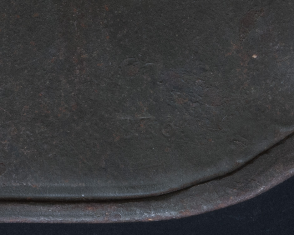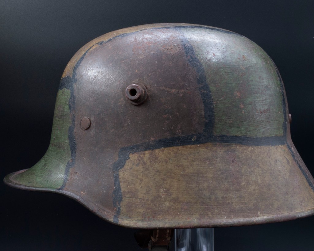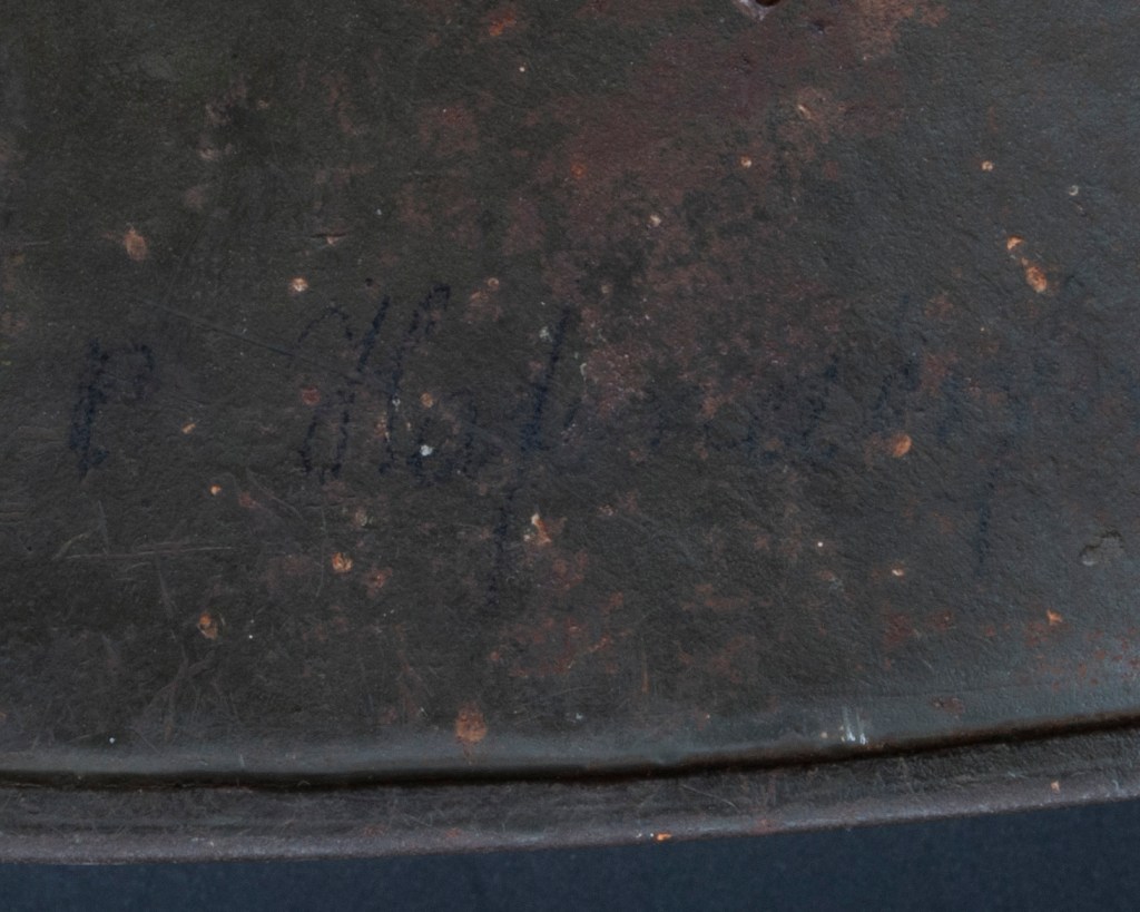 Displayed Example: This helmet came from a woman in the Vancouver area who was in the business of cleaning out homes following estate sales. The helmet was in a shed apart from the house and had been either overlooked or otherwise unclaimed by the surviving kin and the buyers at the estate sale. It is a complete, out-of-the-woodwork piece that had never been in a collection before and had apparently never been modified since being brought back from Europe, likely as a souvenir by a Canadian Commonwealth soldier. This helmet has the classic camouflage pattern incorporating green, rust red, and ochre-colored paints separated by finger width black lines. This type of camouflage scheme was mandated by an order dating July 1918 for all helmets.[2] It is nicely named on the interior skirt in old style cursive writing done in pencil, which is the most typical way German soldiers marked their helmets. The name is not quite legible, but is something like “P. Haffenreffer.” The front liner pad was removed, which was commonly done to accommodate larger head sizes. The white chrome leather pads, which were also used on M17 helmets, often have blue indelible pencil marks that were applied before the hides were cut. The helmet photographed has that feature. The manufacturer and size markings on the wearer’s left side on the skirt is E.T. 64. E.T. was the manufacturer code for Eisenhuttenwerk Thale A.G., which was the largest manufacturer of German steel helmets in both the First and Second World Wars. Sixty-four centimeters was the most common size for German helmets.