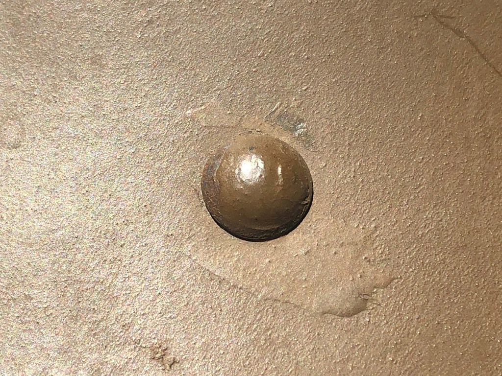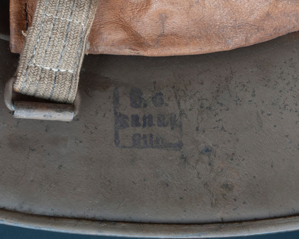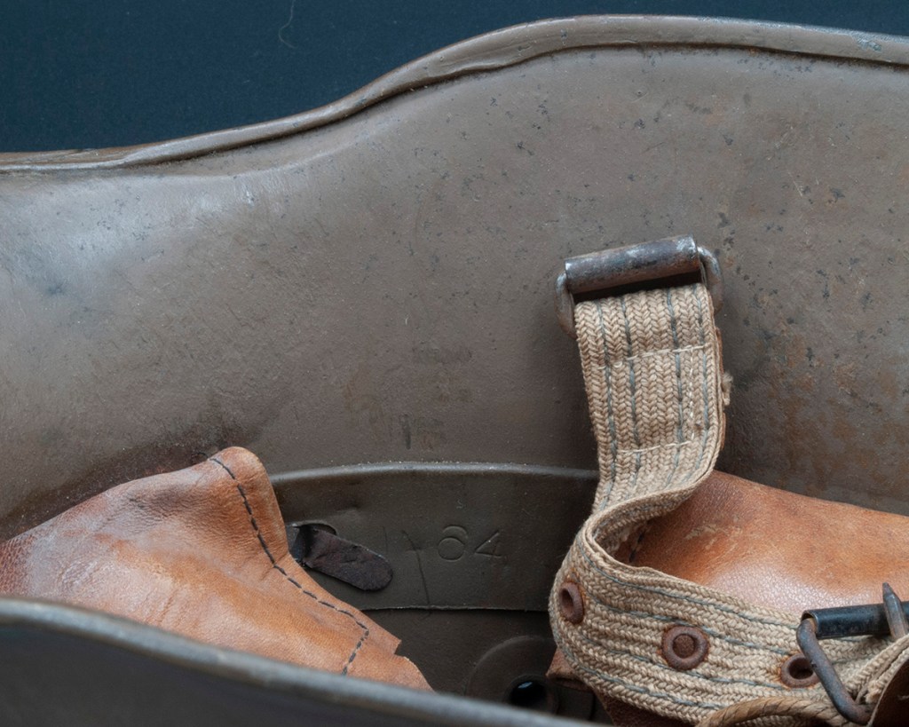Understanding this helmet gets into some arcane territory. The helmet was made by A . Western Cilli which used the code “AW.” Cilli was the name of the city in the Austro-Hungarian empire where the factory was located. Cilli is now part of Slovenia and the name has changed to Celje. On this helmet there is no manufacturer code due to a weak strike and/or being covered by paint. So, how do we know it is an AW helmet? It’s a size 64 shell and there were only two companies that made helmets in this size: AW and Manfred Weiss (MW) located in Csepel, Budapest, Hungary. The split pins on the AW helmets had round edges while those on the MW helmets had flat edges. In addition, the AW helmets had inspection stamps like my helmet, while the MW helmet inspection stamps were different. So, it’s an AW helmet. In addition, it is a factory refurbished helmet. Well, how do we know that? The A. Western Cilli company had the contract to refurbish damaged helmets. These helmets were collected and sent to Cilli for reconditioning. The helmets were repainted entirely or in part with spray paint. If the split pins were removed, however, these were touched up with a brush. One way to detect whether a KuK helmet was reconditioned, therefore, is to notice whether the rivets or split pins show signs of being brush painted like this one (see photo). Standard helmets from the factories generally had chinstraps with six eyelets, while refurbished had chinstraps with twelve eyelets like this one. Late-war helmets also sometimes had twelve eyelets, so this feature is not unique to reconditioned pieces, but it is a characteristic of the type. The reason for the additional eyelets was to more readily accommodate a gas mask.[2]