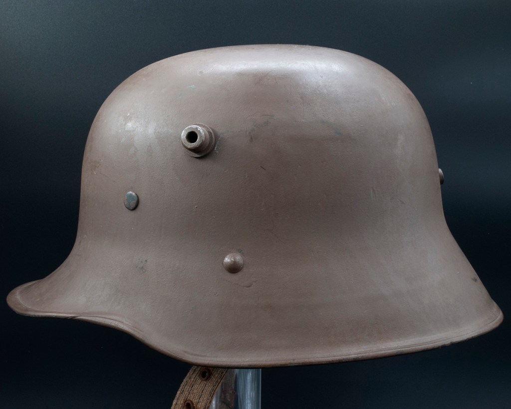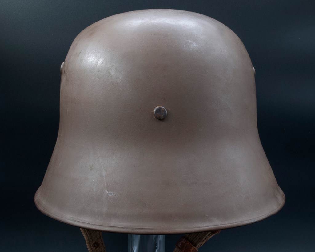 The nomenclature for these helmets is a little slippery. They are sometimes referred to as an “M16” or “M18.” “M17” seems more correct to me as this was the first year of their manufacture.[1] In addition, you will sometimes see Austro-Hungarian military relics identified as “KuK,” or in this case, “KuK M17.” KuK or k.u.k., is shorthand for “kaiserlich und königlich,” which translates as “imperial and royal.” It alludes to the fact that the Habsburg emperor was both the kaiser (emperor) of Austria and the könig (king) of Hungary.