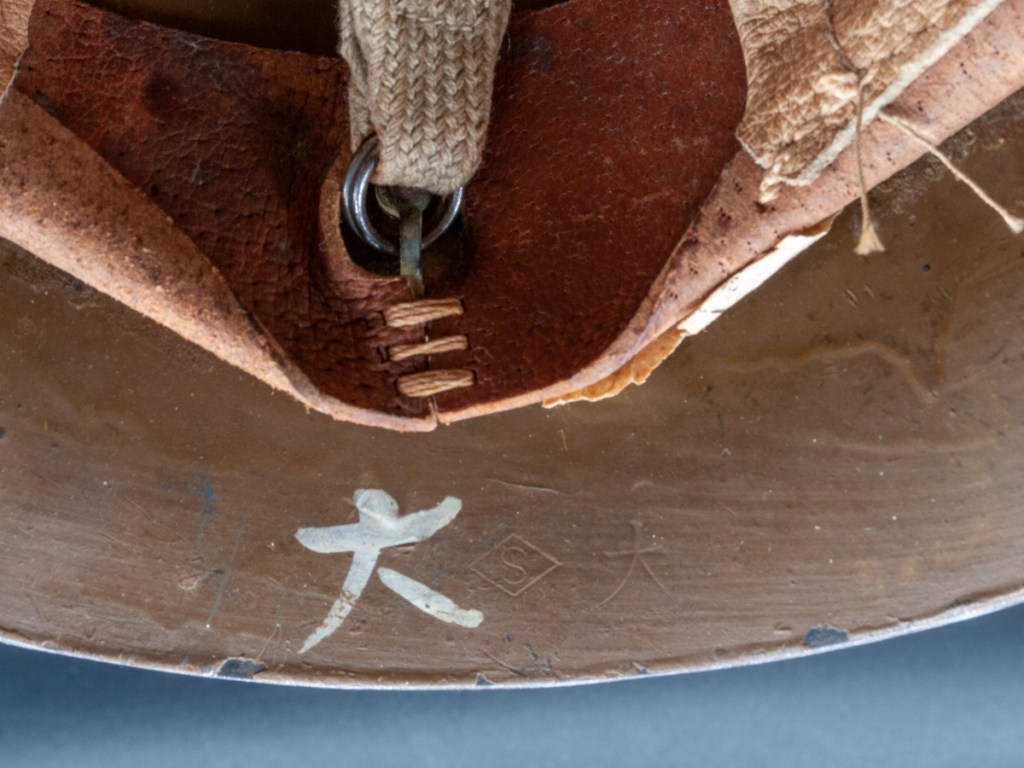 Displayed Example: This helmet was part of a WWII veteran’s collection of military relics. I had the impression that this was not something that the vet himself brough back, but I was never able to get the whole story. At any rate, I was happy to acquire this piece and knew it was going to be a keeper as soon as I pulled it out of the box. Faintly visible on the right side of the helmet is the name of person who brought this back from the Pacific. It is marked with the embossed and painted kanji characters meaning “large.” This is a stick figure with outstretched arms. It also has an “S” within a diamond shape embossed next to the size stamp. This was the symbol for the Kobe Seiko (steel) arsenal. The cloth material behind the liner pad has the Arabic number 17 for Showa year 17 which corresponds to the year 1942 in our Gregorian system. Both of the split pins are original WWII vintage, but one is a replacement.