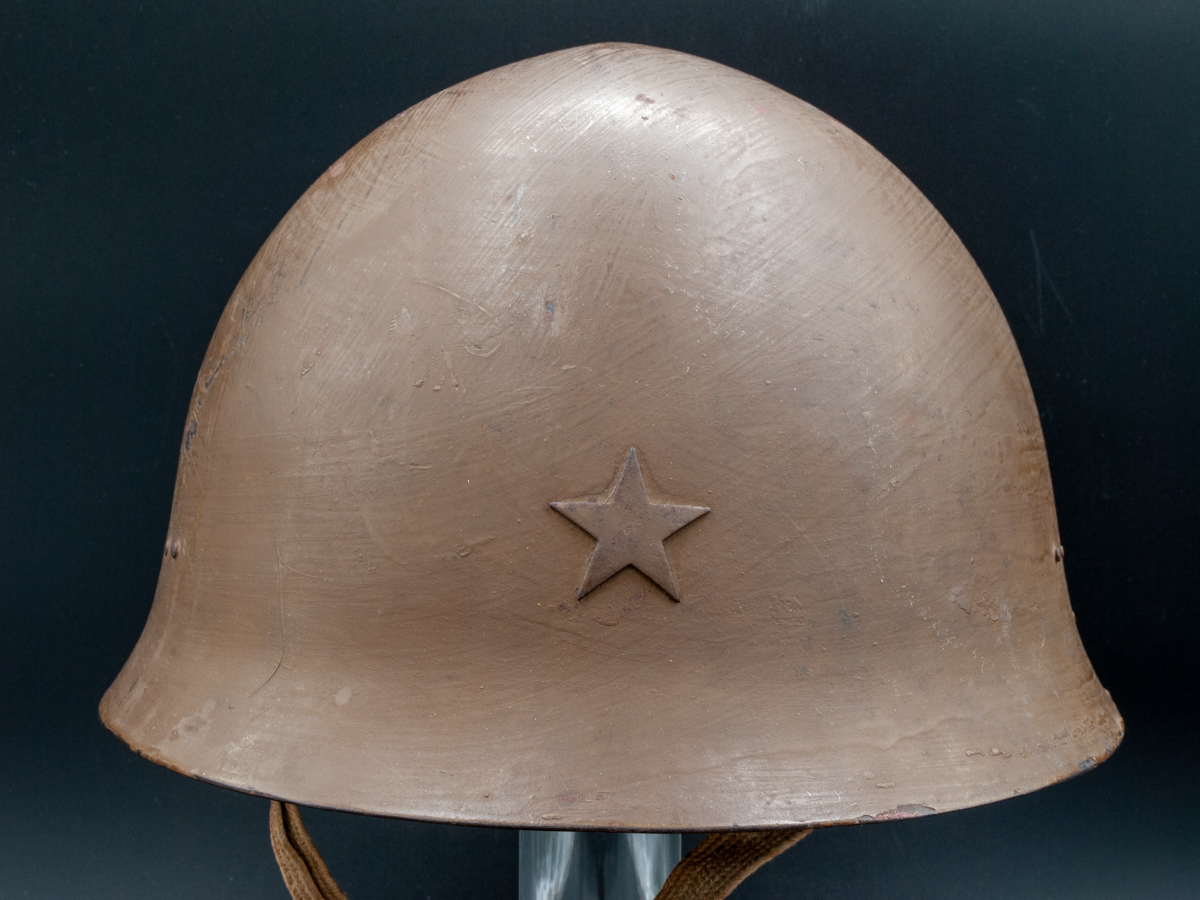Collector Notes: Although the Type 90 was the only main helmet type used by the IJA during WWII, there some variations in configuration which are of interest to collectors. Many of these helmets were used with cloth covers and/or nets. In addition to the IJA Type 90s the Imperial Japanese Navy (IJN) also used the Type 90. Instead of five-point stars, these had metal IJN badges with anchors, or yellow stencils also with anchors. The IJN helmets were either brown, like their army counterparts, or they were grey. Because of the relatively high value of the IJN helmets, IJA helmets are sometimes found with post-war IJN badges and misrepresented as original IJN pieces.