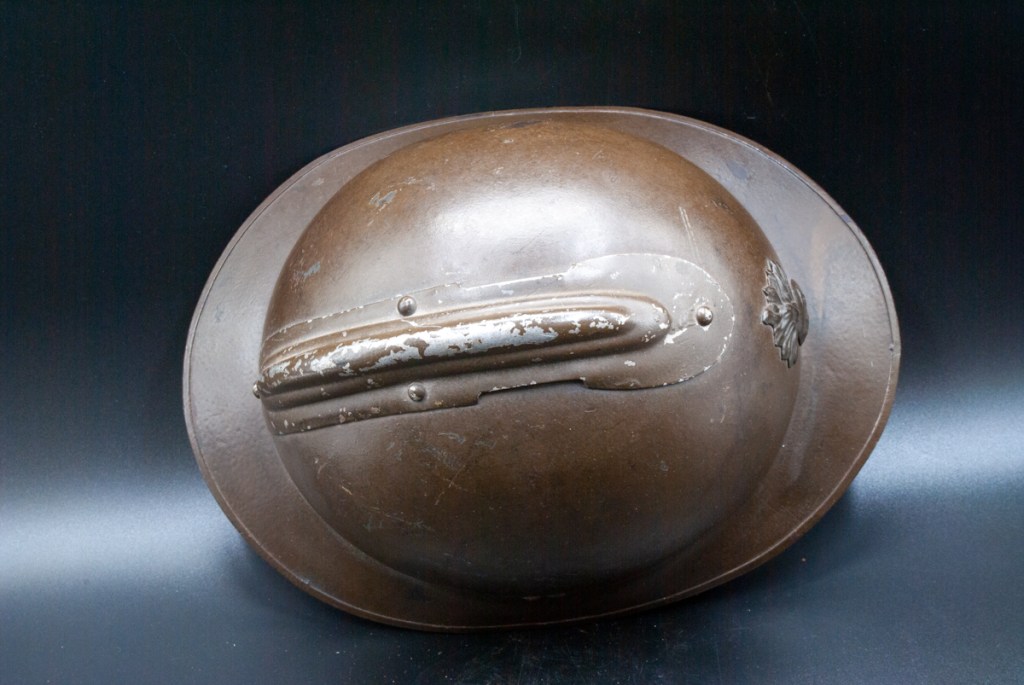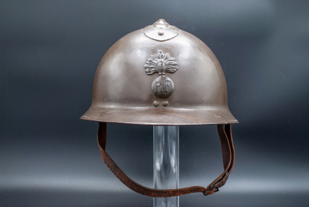 Displayed Example: This helmet is a size C, which corresponds to medium. The liner is stamped 57 which was one of the three sizes of liner that fit into a size C shell. The liner is also stamped with the year of the contract which appears to be 1929. The manufacturer’s name in stamped in large black ink in the dome. The company Industrielle Marseillaise à Marseille manufactured this piece. The helmet bears the traditional flaming bomb symbol designating infantry. The badge is the earlier First World War type.