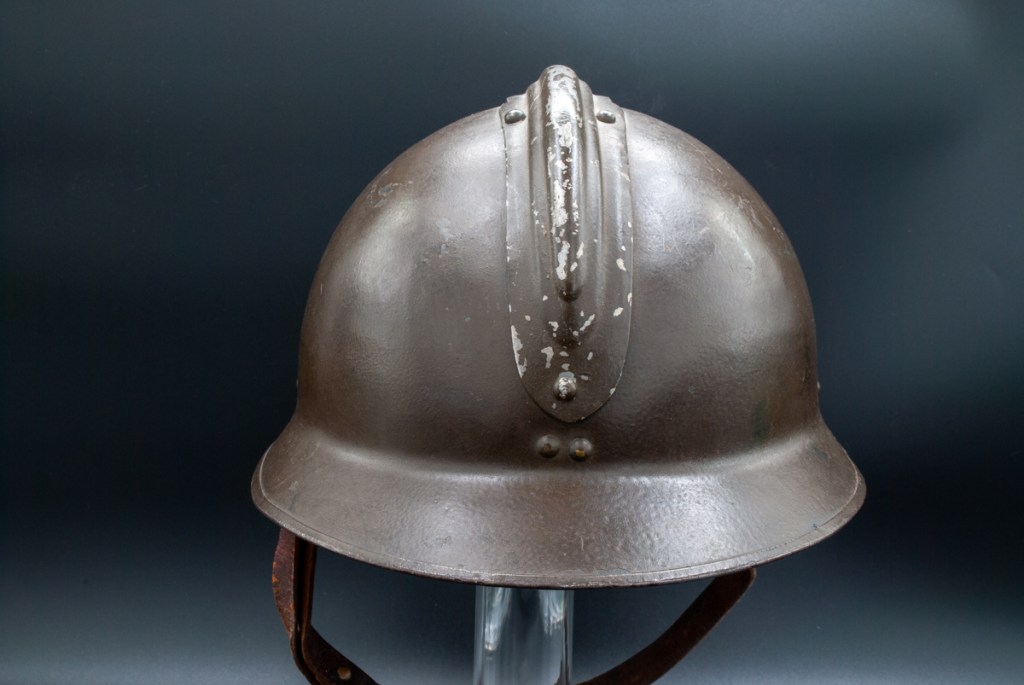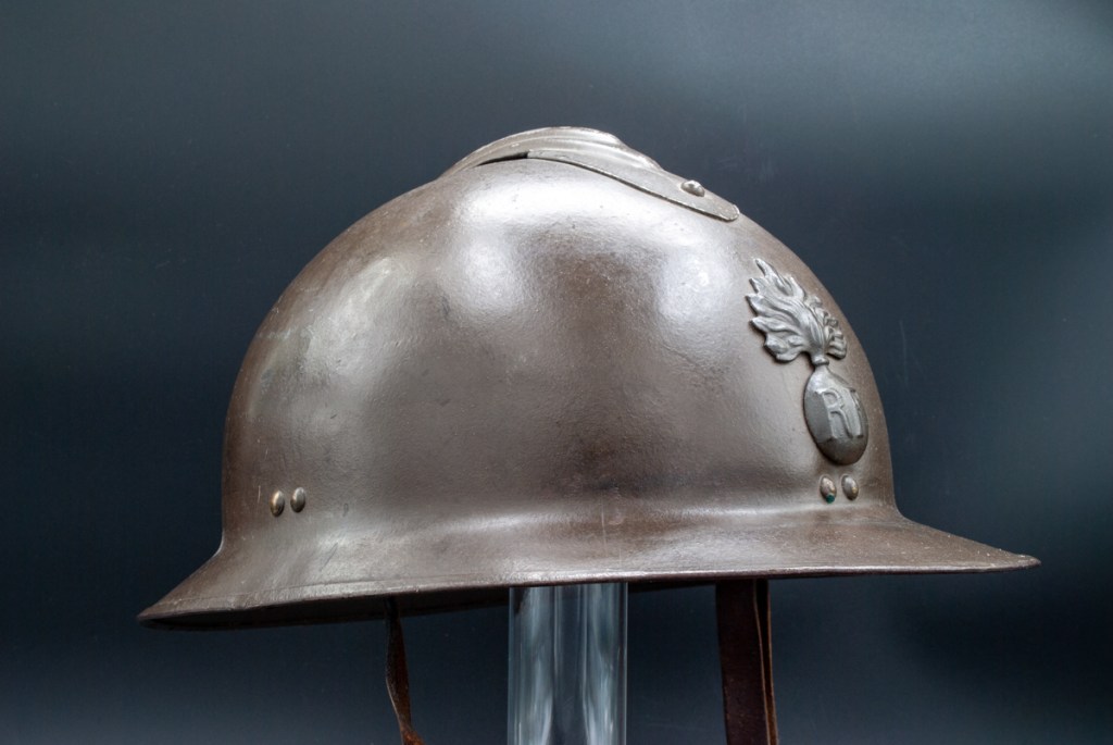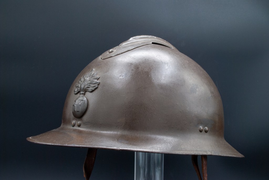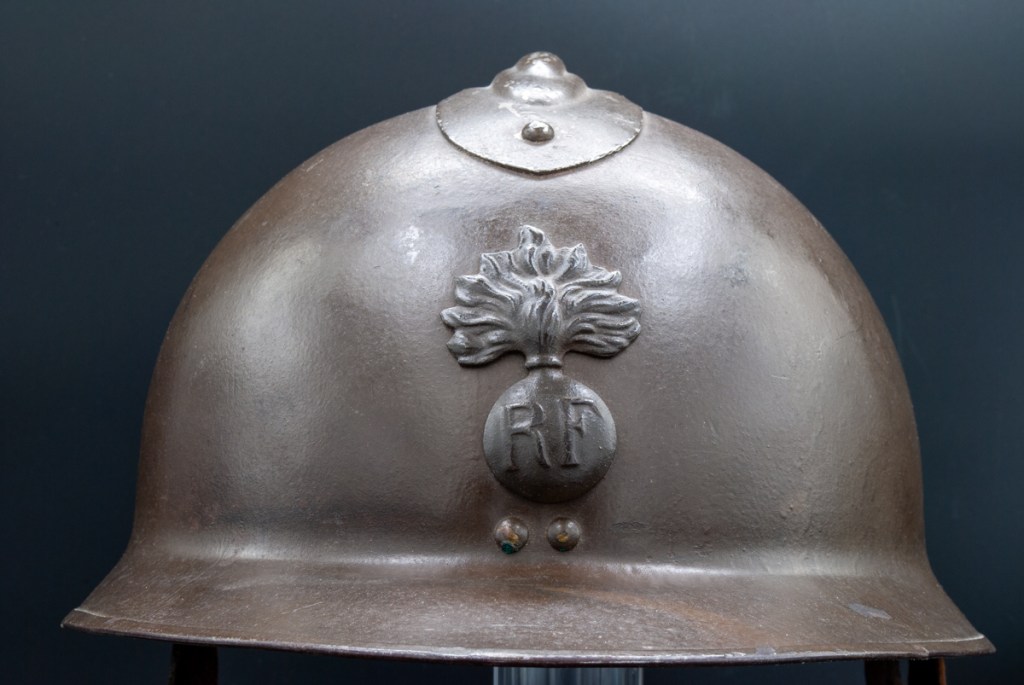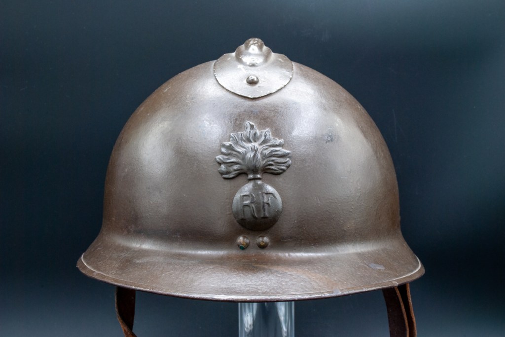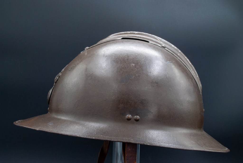 General Information: The French Model 1926 helmet was the main helmet used by French armed forces in the second world war. A large number of reissued Model 1915 helmets were also used. A transitional helmet, the Model 1923, was issued in limited numbers. In addition to the M26, specialty helmets were issued for armored, antiaircraft, and navy units. At the end of the war French soldiers were equipped by the United States and Britain and typically used the American M-1 steel helmet. As with the Model 1915, front badges designated different branches of French armed forces. Early issue M26s used World War One style badges. Later issue helmet were disks stamped with the symbols of the respective armed service branches (infantry, artillery, Zouave-Saphi/North African, chasseurs, engineer, aviation, medical, marine/colonial, armored, and light armored). Badges were generally painted separately from the helmet shells and are often slightly different colors or shades. In the 1940 campaign the great majority of the M26 helmets used by the French army had the earlier style badges.
