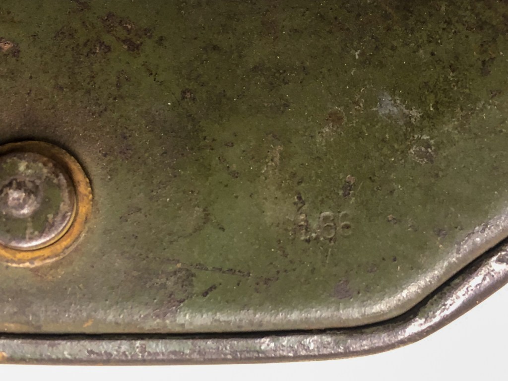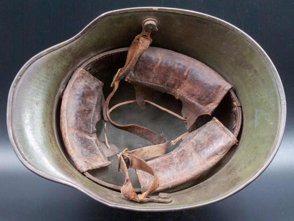 The M16 had a leather liner made of three separate pads each with two tongues that contained perforations for a drawstring. The leather pads were sewn into a leather band that attached to the steel shell by means of three split pins. The chinstraps were the 1891 model which was the same type used on enlisted man’s spiked helmets (“pickelhauben”). Protruding Frankenstein-like side lugs served a dual purpose. They provided ventilation and also supported an armored brow plate, or “stirnpanzer” that was used by soldiers in stationary, hazardous positions like sentries and snipers, to give extra protection. The helmets were produced in sizes ranging from 60cm to 68cm, with the most common size being 64. The helmet sizes along with a manufacturer code, usually one or two letters, were stamped on the interior skirt on the wearer’s left side.