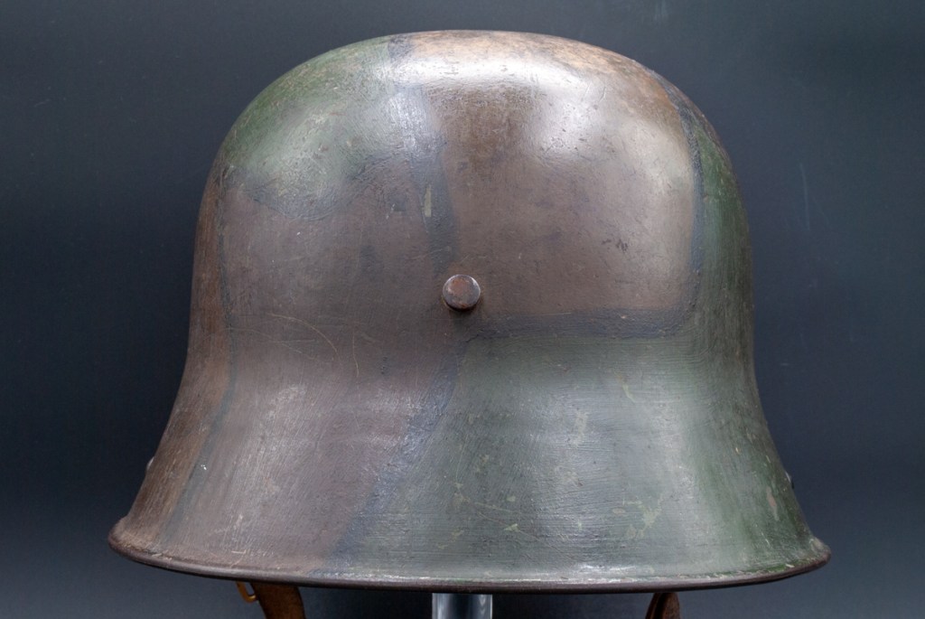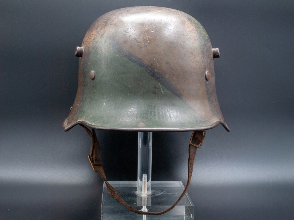 Collector Notes: With 7.5 million of these helmets made, there are still a large number circulating and they are not hard to find. They are not even very expensive depending on how particular you are about condition, completeness and originality. Recently a large cache of Finnish-used German helmets including the WWI type, were discovered and can be purchased for relatively modest prices (see: Finnish German M16 post-WWII). Because of their great popularity and high prices for better quality pieces, there is every variety of fraud and misrepresentation in German First World War helmets. Fake German WWI camo helmets and components have become a cottage industry in Latvia and elsewhere, particularly Eastern Europe. Buy from reputable dealers, do not buy from people who do not offer refunds, join an online forum and purchase some good reference books.