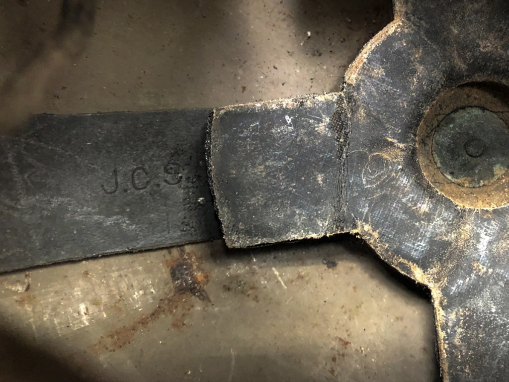 Displayed Example: The somewhat difficult to read date on the rim of this helmet is 1939. It bears the F&L stamp of the Fisher and Ludlow Ltd. company. The liner is dated 1940. The last two digits of the date are hidden behind an arm of the black rubber piece attached to the crown of the helmet. The black liner band is marked a size 7 and the manufacturer initials are J.C.S.