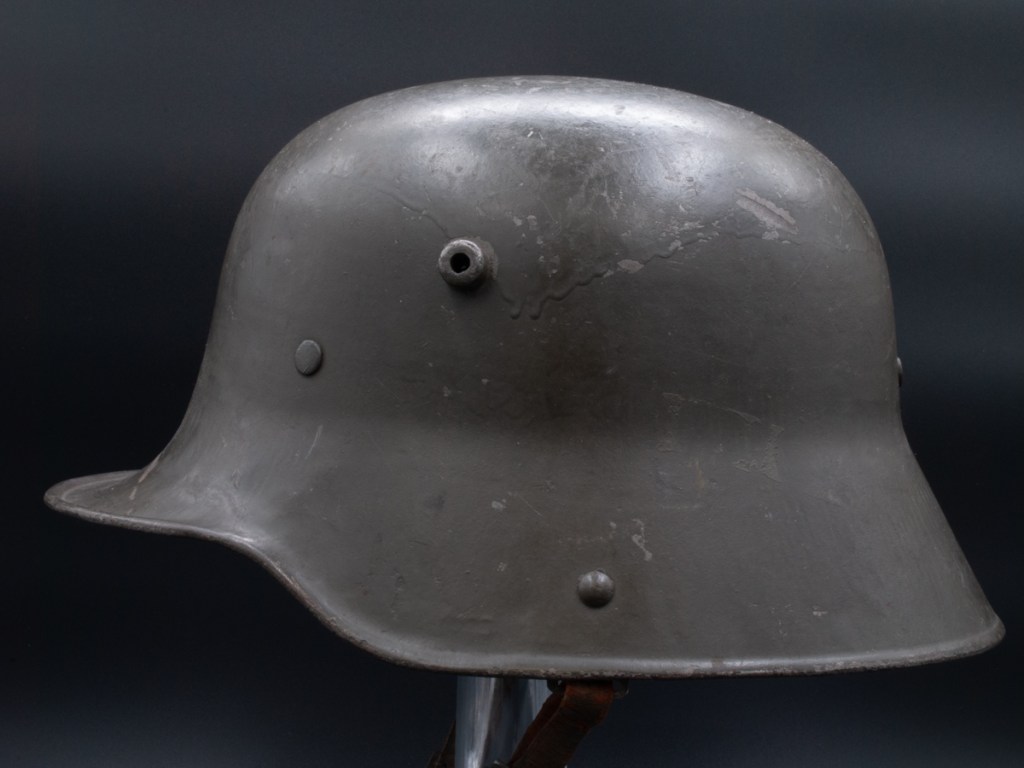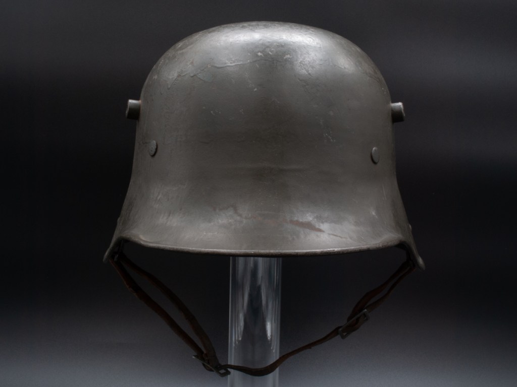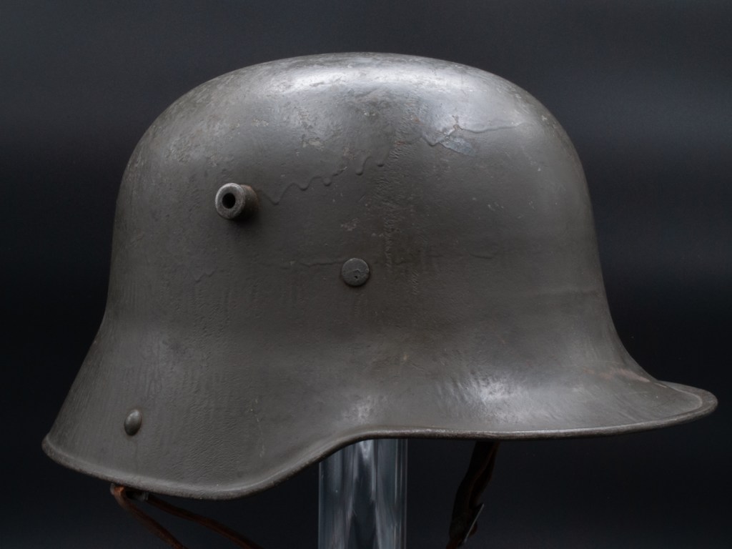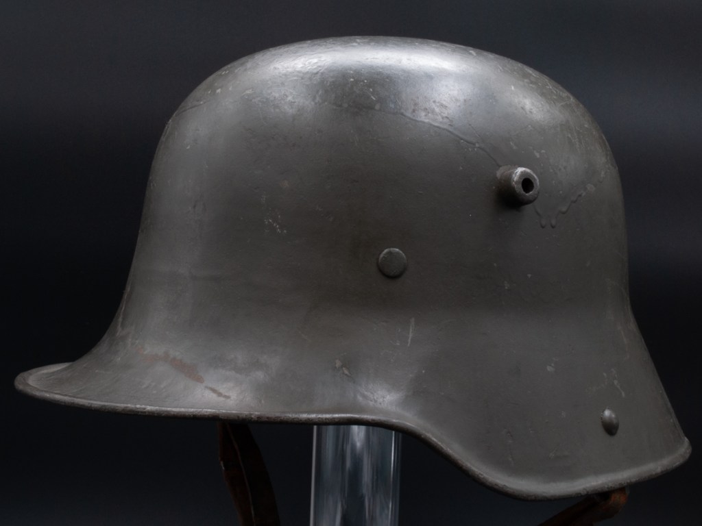 Collector Notes: Along with the M16s, there were millions of these helmets made during the First World War and there are still a great number floating around in the market. They were extremely popular doughboy souvenirs and they are still surfacing from time to time from people’s attics. If you are not too particular about condition and completeness, they can be purchased for a relatively modest price. The liners and chinstraps on these helmets were fragile and few have survived fully intact. Complete helmets, therefore, fetch premium prices. As with anything in collector markets, the ones in top condition can be expensive. Camouflaged pieces have grabbed collector’s attention and these have become very expensive. There is a huge amount of fakery in German WWI helmets. Commonly modern replacement liners and chinstraps are aged and presented as original. Fake camouflage pieces are also abundant and some of these are good enough to fool advanced collectors. Be careful! There are also reproduction shells, but these are not very convincing and seem to be made for the reenactor or theatrical markets rather than to fool collectors.