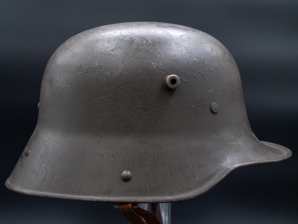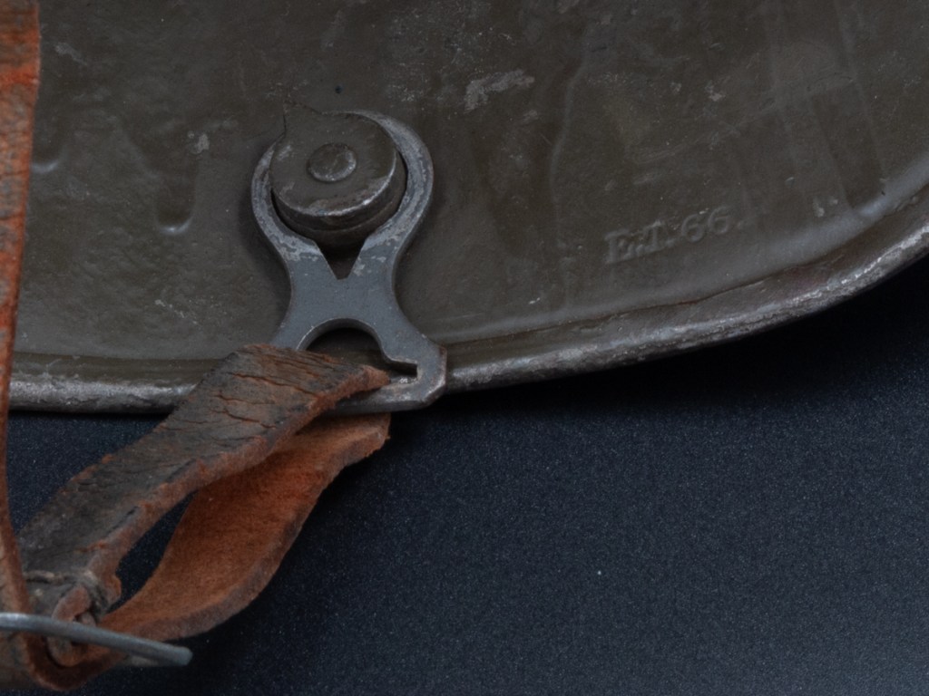 Displayed Example: This was an out-of-the-woodwork item that I bought from woman who said it had been in her family but could not remember the rest of the history. It was made by the Eisenhuttenwerke firm in Thale and bears the manufacturer’s code “ET” alongside the size “66” embossed on the interior skirt section on the wearer’s left. As with all size 66 and 68 German First World War helmets, the side lugs have no step as found on the smaller sizes. The helmet has a black stenciled or stamped size marking “66” and a now faint “AK” also in black ink. On these stamps the two letters are joined, with the right leg of the “A” also forming the left side of the “K.” “AK” stands for “Abnahmekommando” or “Acceptance Command” which was the military authority responsible for inspecting procurements. The AK and size stamp on the rear skirt of the helmet are original markings applied at the manufacturer’s factory when the finished helmet passed inspection. These markings are often very feint or were never applied or have faded or worn off and are usually only seen on helmets in very good condition.[2]