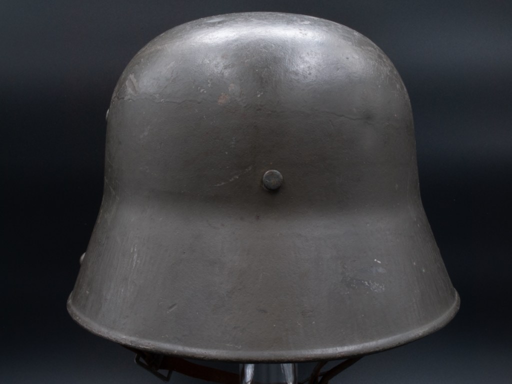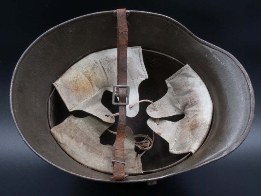 General Information: The German Model 1917 is identical to the Model 1916 but for one thing; the liner band is metal rather than leather. These were authorized in May of 1917.[1] The chinstrap is the same M91 type used on the M16s and on pickelhaubes, but the chinstrap hardware is more frequently steel or zinc-like metal rather than the brass fittings that are more typical of the M16s. Like the M16s, the M17s had brown leather liner pads, but unlike the earlier helmets the later ones were also produced with white chrome tanned leather. Note that “Model 1917” is a collector term. During the World War One period it was not formally recognized as a model separate from the M16.