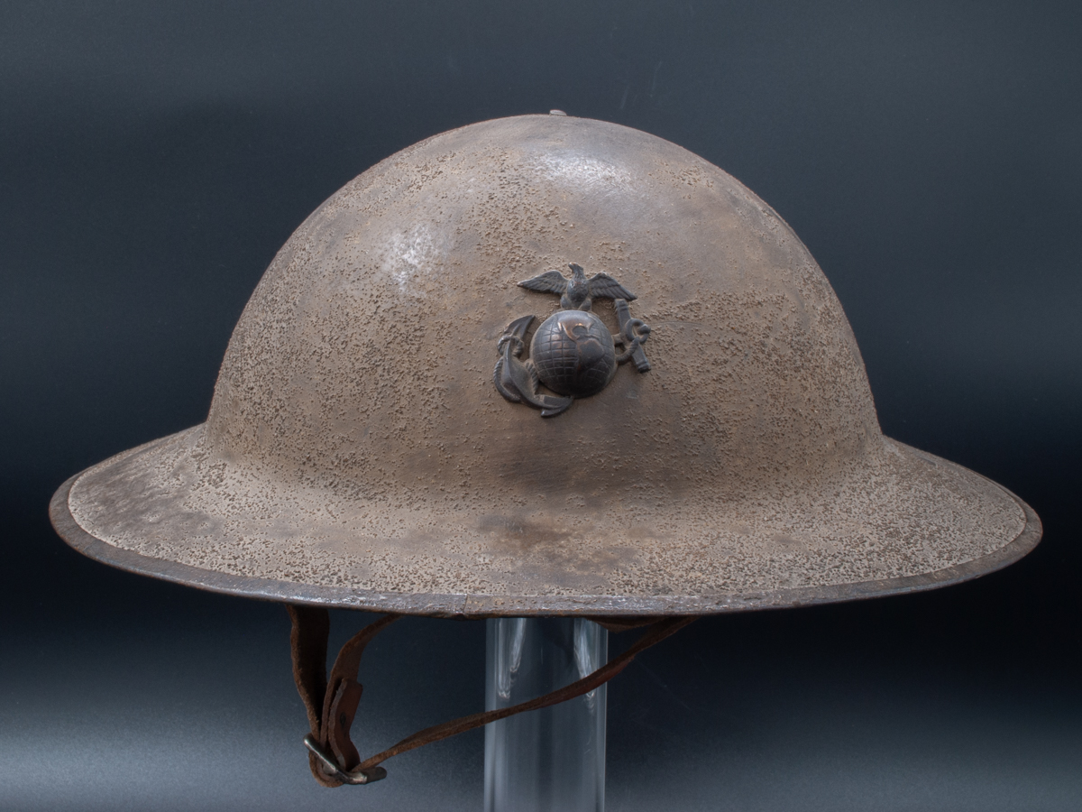 Displayed Example: I bought this helmet in 2015 at the Show of Shows in Louisville, Kentucky. It came from an old collection that the table holder was liquidating on behalf of a friend. The helmet is a British Mark I, the type issued to early-arriving members of the American Expeditionary Force (AEF). The EGA is the version used during the First World War. The hole for the badge was punched rather than drilled. At that time, soldiers and marines generally did not have access to power drills, and it would have been difficult to perforate the helmet with a hand drill; therefore, the holes were punched with a hammer and nail, or something similar. It is impossible to say whether the helmet was in its current configuration prior to the Armistice, but it has the right characteristics of the type (WWI vintage EGA/punched hole). The fact that it is an earlier-issued British MKI type helmet makes it more likely that the EGA was on the helmet during the war since virtually all the MKIs used by Americans were issued to early-arriving AEF troops. US Model 1917s would have been somewhat less likely to have an EGA attached during the war because many of these helmets were issued after the Armistice, or remained unissued.