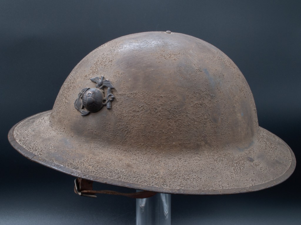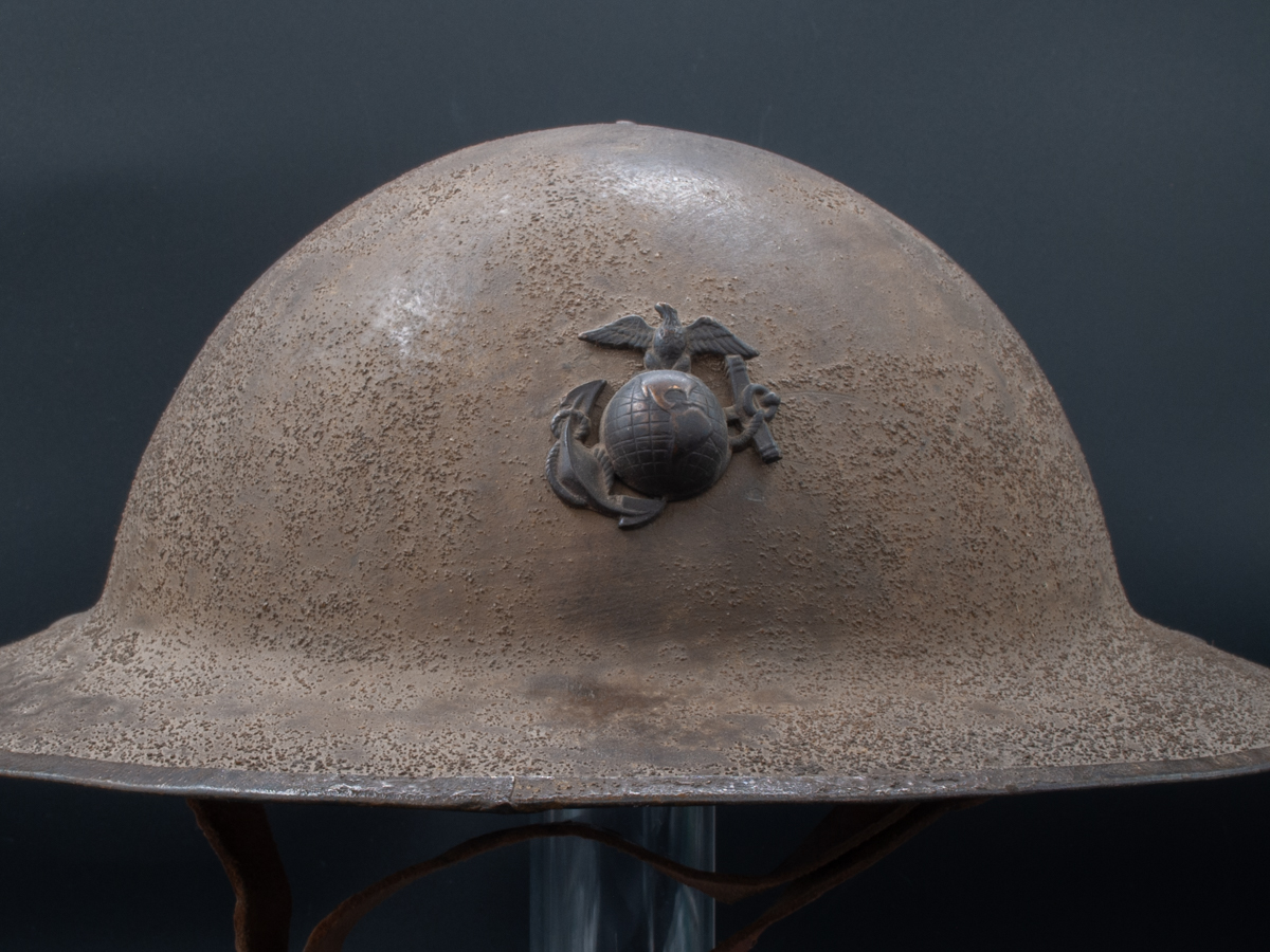 Collector Notes: Helmets with collector-installed EGAs abound and this can be a tricky thing to detect. Look for First World War type EGAs and punched versus drilled holes. Helmets with drilled holes may be original, but they are likely to be later, post-war vintage. Of course, there are perfectly original M17s and M17A1s with later vintage EGAs that were used by US Marines during the 1920s and 1930s, and these are interesting historical objects as well.
