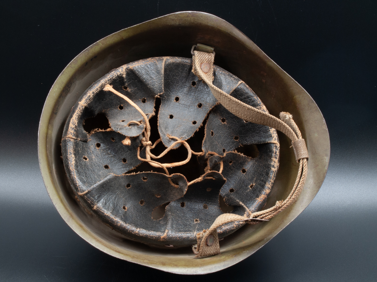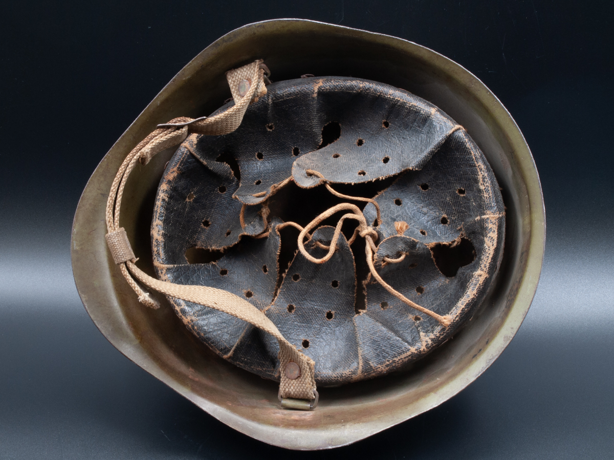 The helmet is “Poct2” which corresponds to a size two, or medium size. It has the rare, early oil cloth liner.