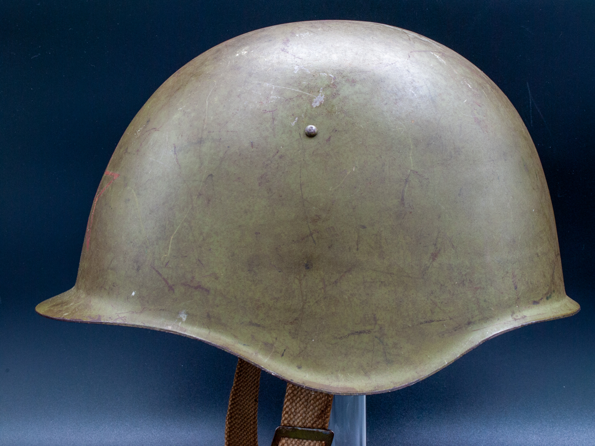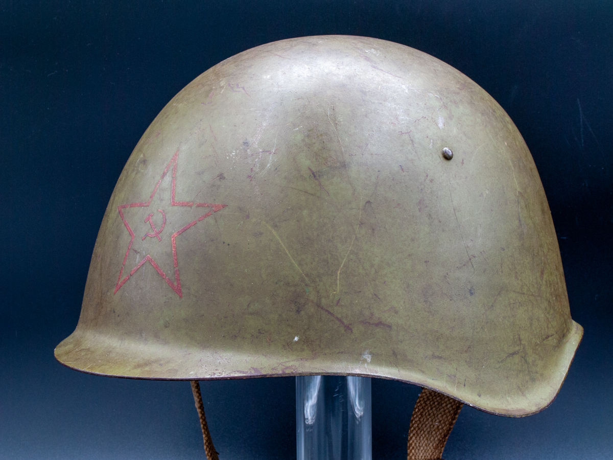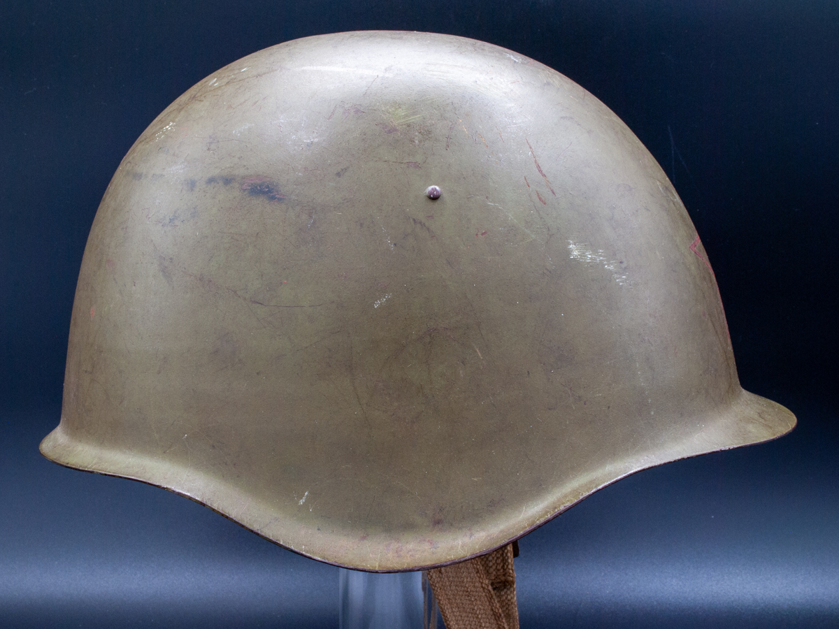 Collector Notes: Soviet helmets have been surprisingly hard to find given that there were millions manufactured. Following the fall of the Soviet Union a lot of SSh-39s and SSh-40s hit the market, but those sources dried up. The Czechoslovakian vz53 (Model 1953) is a near exact copy of the SSh-39 in its external features and is often misidentified or misrepresented as a SSh-39. The innards of the two helmets are quite different, however. The liner of the vz53 is leather and similar in construction to German WWII helmets. The Czechoslovakian chinstraps are usually leather as well.