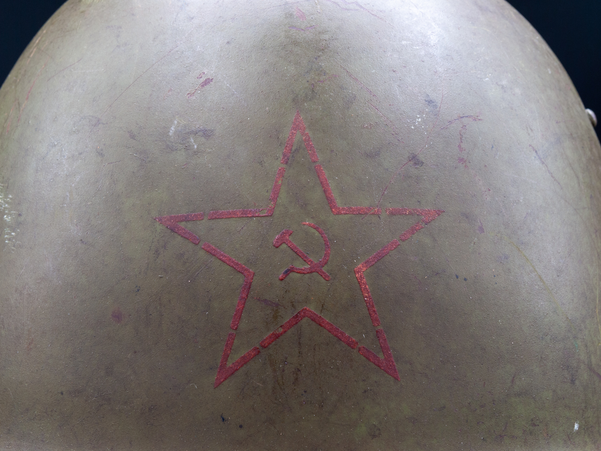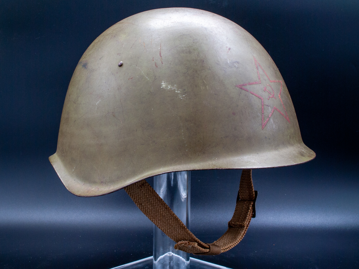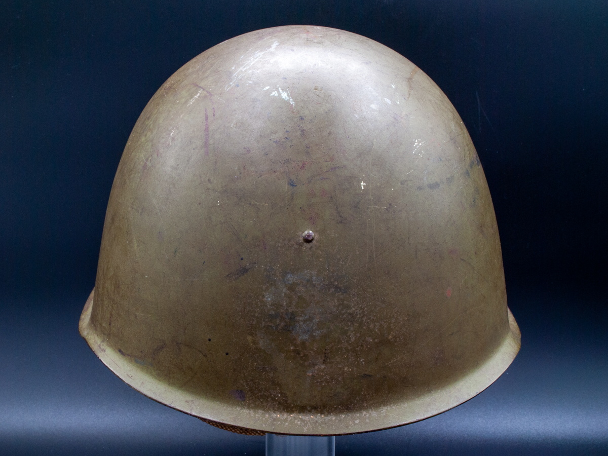 Collector Notes: Soviet helmets have been surprisingly hard to find given that there were millions manufactured. Following the fall of the Soviet Union a lot of SSh-39s and SSh-40s hit the market, but those sources dried up. The Czechoslovakian vz53 (Model 1953) is a near exact copy of the SSh-39 in its external features and is often misidentified or misrepresented as a SSh-39. The innards of the two helmets are quite different, however. The liner of the vz53 is leather and similar in construction to German WWII helmets. The Czechoslovakian chinstraps are usually leather as well.
