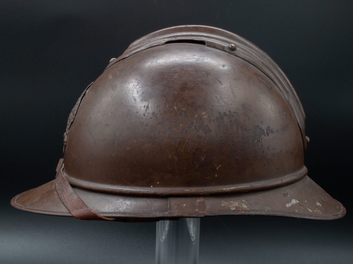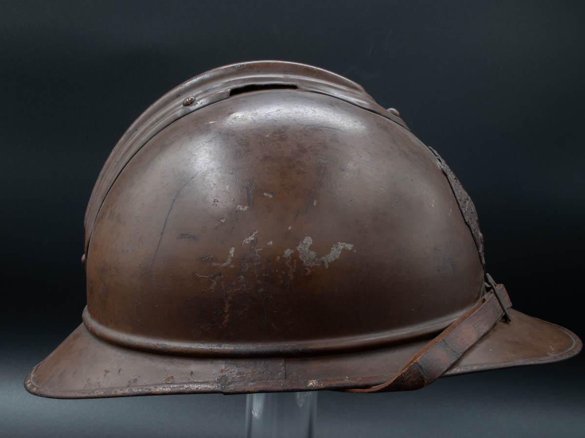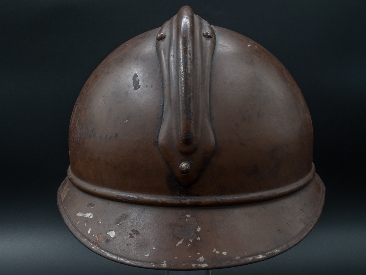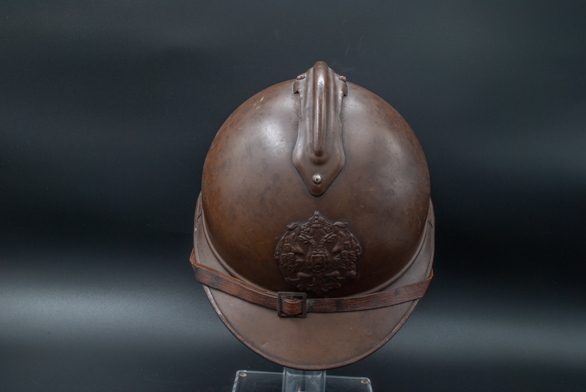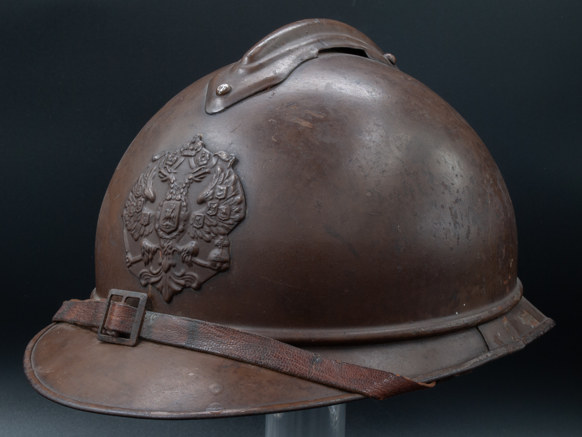 General Information: The French shipped 1,977,000 Model 1915 helmets to Russians for use in the First World War.[1] The helmets were painted khaki brown and had an Imperial Russian badge affixed to the front. This headgear was subsequently used extensively by both sides during the Russian Civil War. The Red Army used modified, reissued versions of the M15s up until the start of the Second World War. The modification involved replacing the Imperial badge with large red star and repainting the helmets green. These are called “big star” helmets by collectors. The Poles, Finns and Baltic states all used Russian M15s left over from the war. When in service in these foreign armies, the badges were removed.