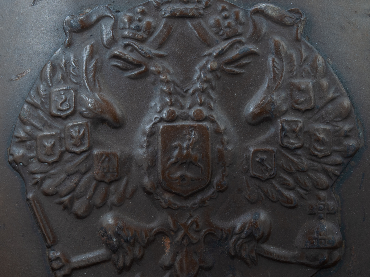 The badge is the old imperial coat of arms of the Russian empire. The symbolism of the double-headed eagle is explained in this excerpt from Wikipedia: “Ivan [III] adopted the golden Byzantine double-headed eagle in his seal, first documented in 1472, marking his direct claim to the Roman imperial heritage and posing as a sovereign equal and rival to the Holy Roman Empire.”[2] In its center is Saint George the dragon slayer, the patron saint of both Russia and England. The Imperial Russian coat of arms was revived in 2000 by Vladimir Putin, who would have been keenly aware of its symbolism and the national ambition it implies.