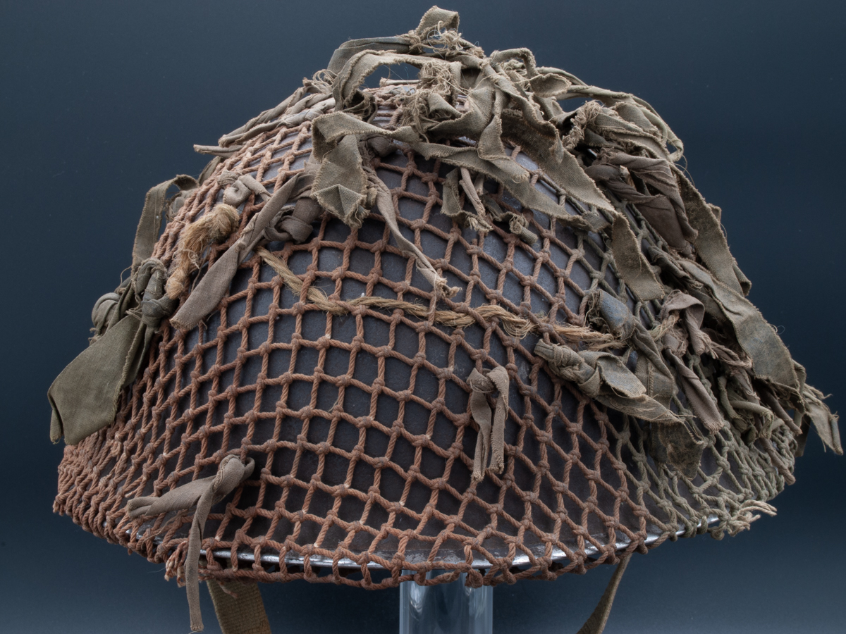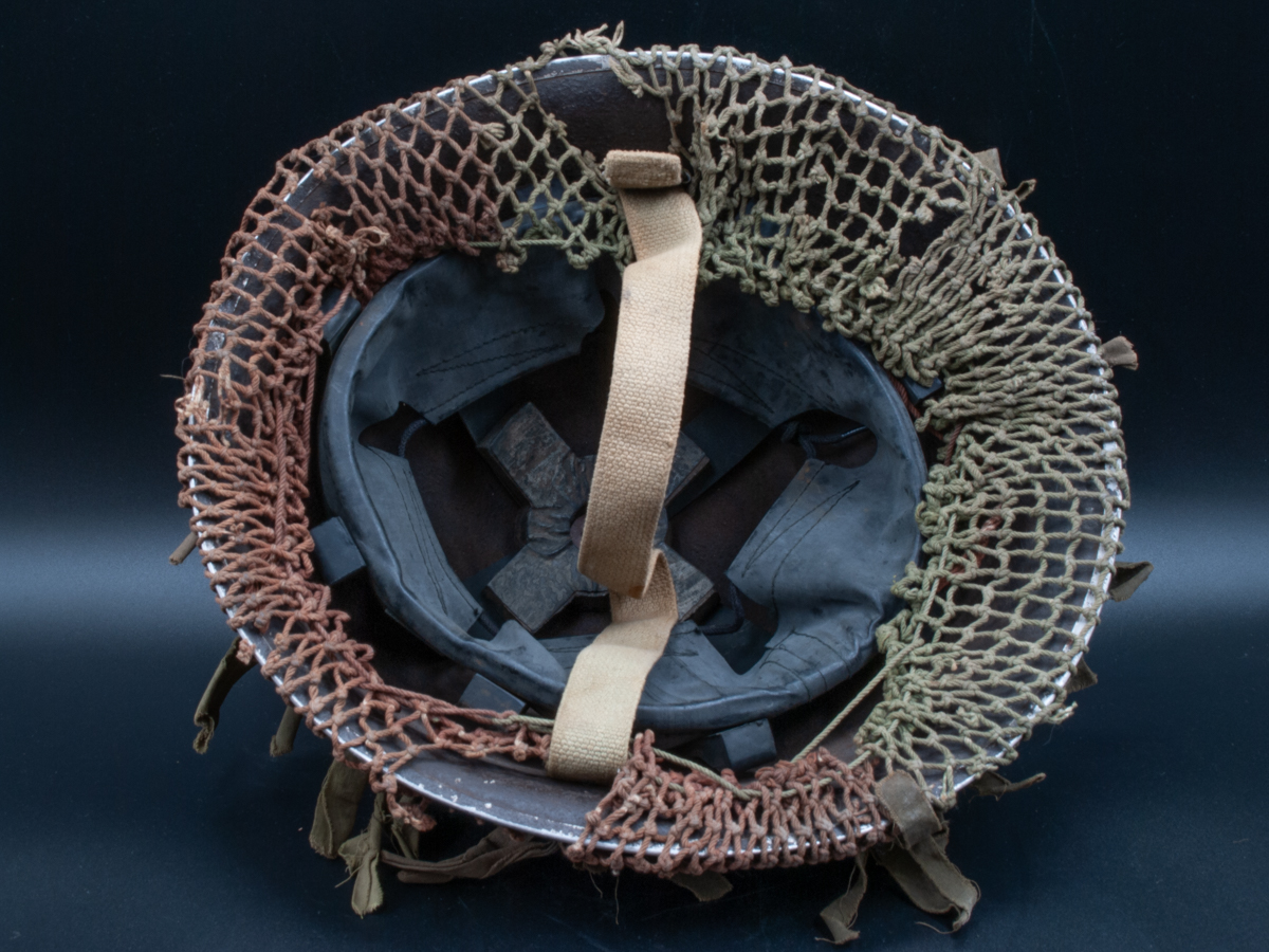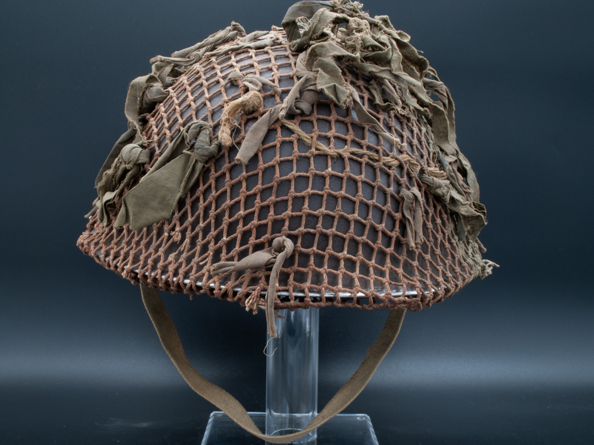 Displayed Example: I bought this helmet from a Canadian collector buddy. He sold me the net separately. He purchased the net with scrim at an army surplus store in Ottawa. It is a two-tone type: brown on one side and olive drab on the other. These nets were made in Canada. The net and scrim are World War Two vintage and would have been removed from helmets during the period, stored in Canadian military facilities, and eventually released as surplus. This particular configuration, MKIII helmet with Canadian two-tone net and scrim, was commonly used by Canadian solders from the Juno landing throughout the Normandy campaign and beyond. The liner is dated 1942. The “V.M.C” on the black liner harness stands for the Viceroy Manufacturing Company of Toronto, Canada. Viceroy Manufacturing had the initial contract to produce liners for the Canadian produced versions of the British MKII. This liner, therefore, would have been removed from a Canadian manufactured MKII helmet and installed in a liner-less, British-made MKIII helmet shell as part of the earliest issues of the new helmet type.