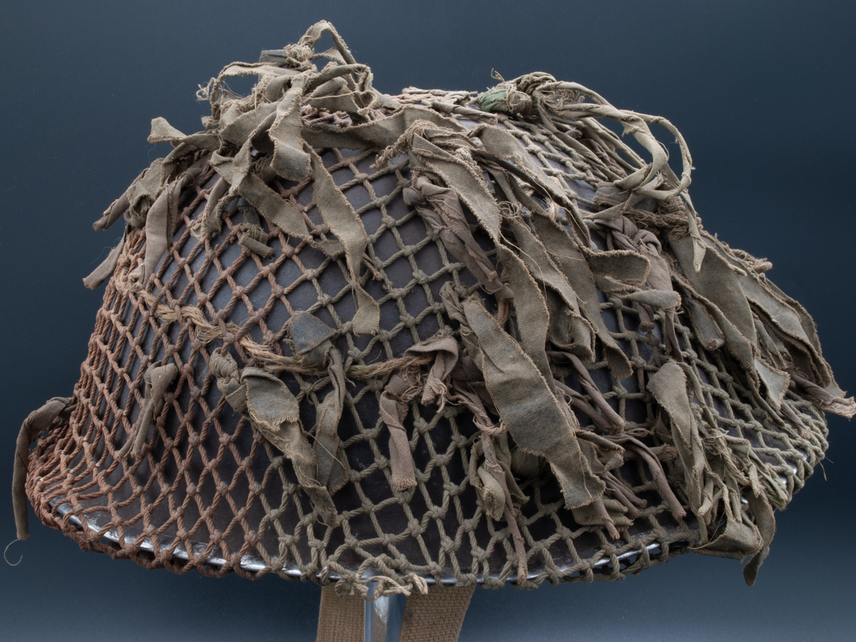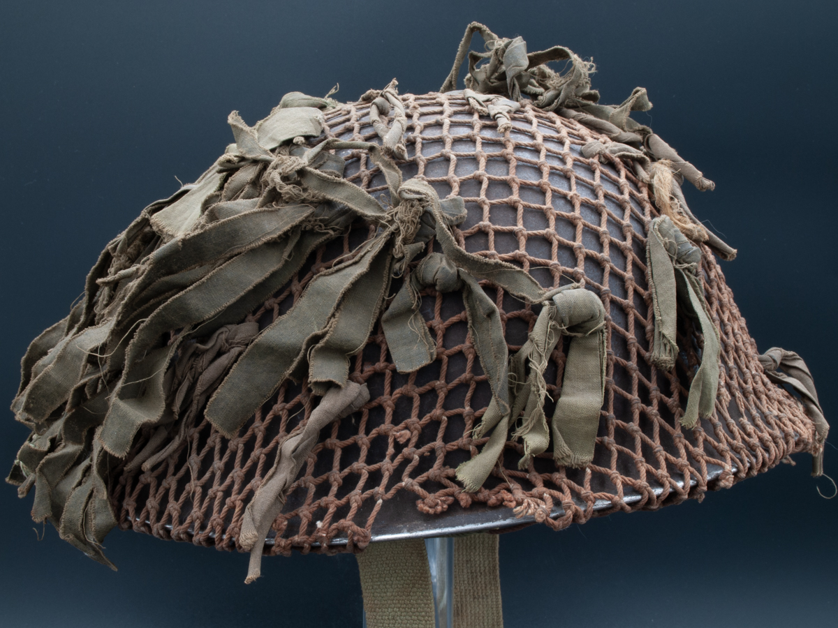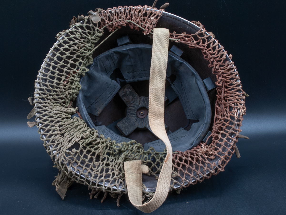 Displayed Example: I bought this helmet from a Canadian collector buddy. He sold me the net separately. He purchased the net with scrim at an army surplus store in Ottawa. It is a two-tone type: brown on one side and olive drab on the other. These nets were made in Canada. The net and scrim are World War Two vintage and would have been removed from helmets during the period, stored in Canadian military facilities, and eventually released as surplus. This particular configuration, MKIII helmet with Canadian two-tone net and scrim, was commonly used by Canadian solders from the Juno landing throughout the Normandy campaign and beyond. The liner is dated 1942. The “V.M.C” on the black liner harness stands for the Viceroy Manufacturing Company of Toronto, Canada. Viceroy Manufacturing had the initial contract to produce liners for the Canadian produced versions of the British MKII. This liner, therefore, would have been removed from a Canadian manufactured MKII helmet and installed in a liner-less, British-made MKIII helmet shell as part of the earliest issues of the new helmet type.