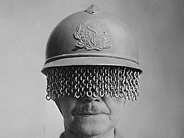 * “Chain screens on steel helmet to protect soldiers’ eyes from fragments of shell, rock, etc.; manufactured by E. J. Codd Company, Baltimore, Maryland. E. J. Codd Company.” War Department. American Unofficial Collection of World War I Photographs, 1917 – 1918. Local Identifier: 165-WW-192B(3). National Archives Identifier: 533656. Ca. 1918. National Archives.
