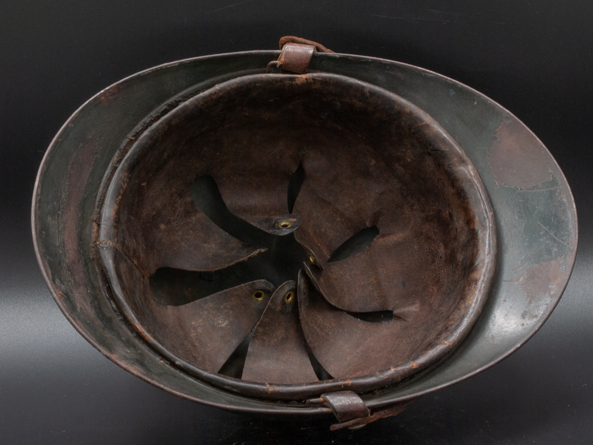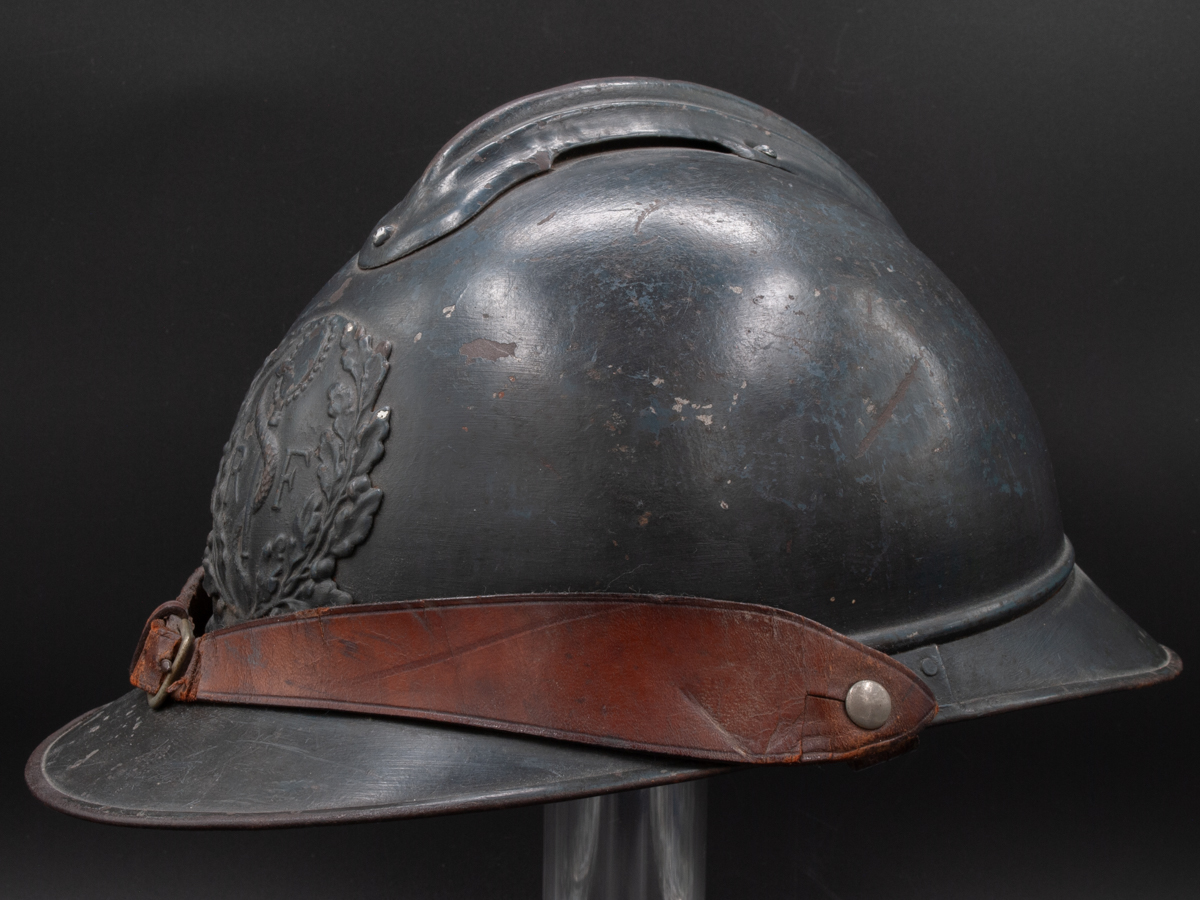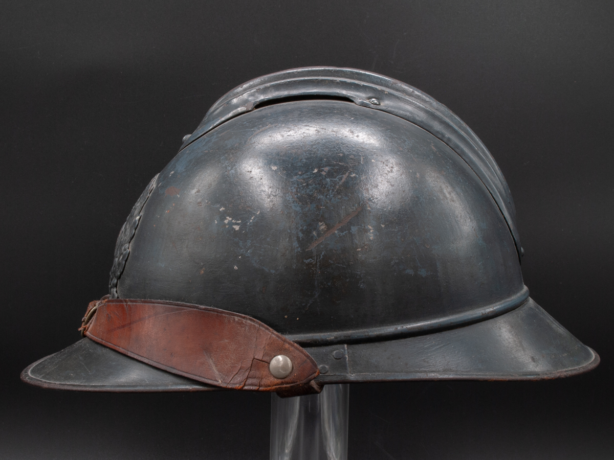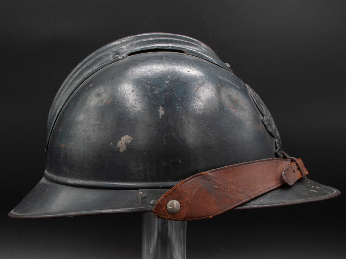 Displayed Example: This is one of my last remaining steel helmets that came from my father’s collection. It is a French medical services helmet with an officer’s private purchase chinstrap. It is a size B, or medium size.