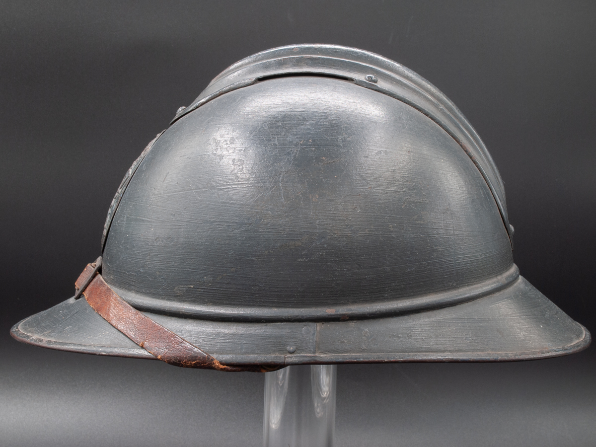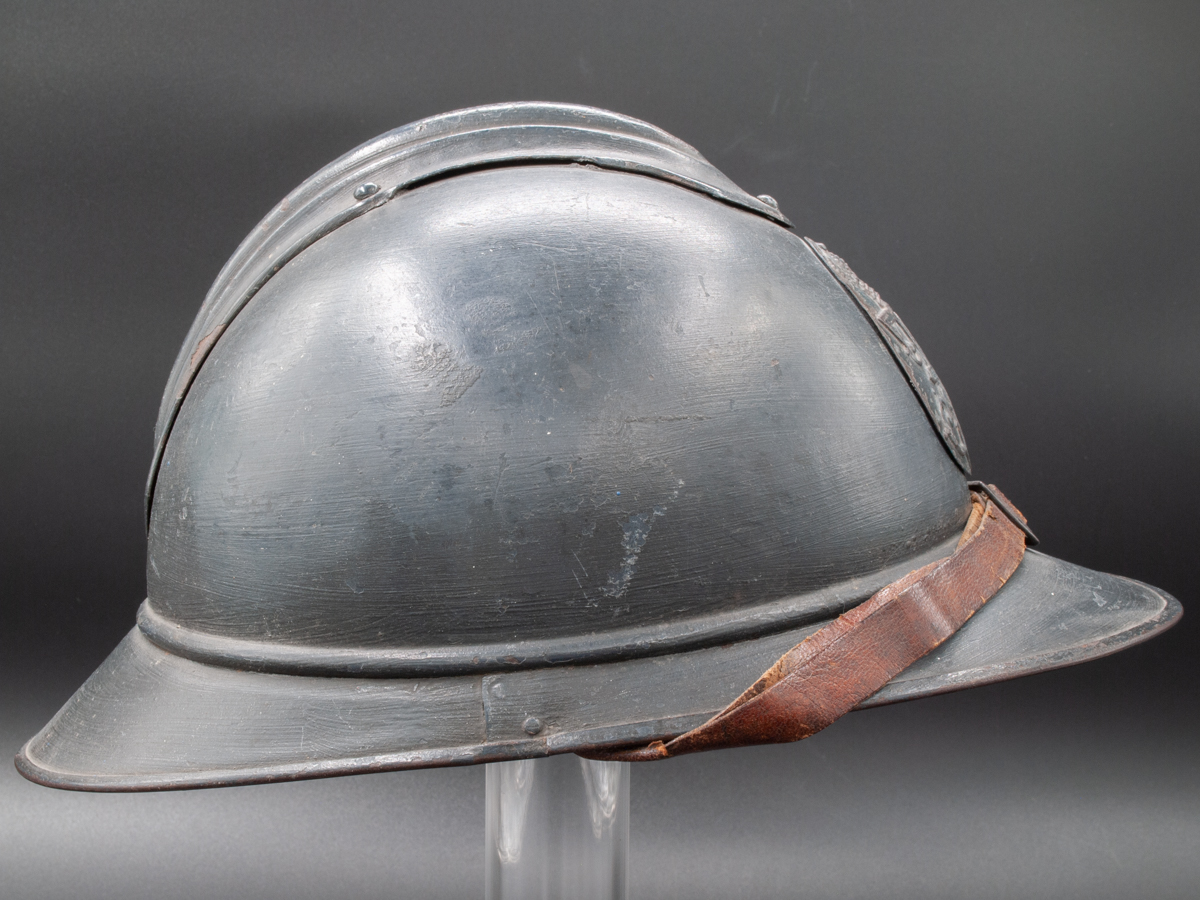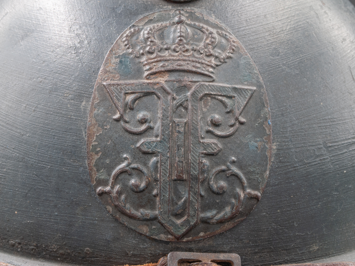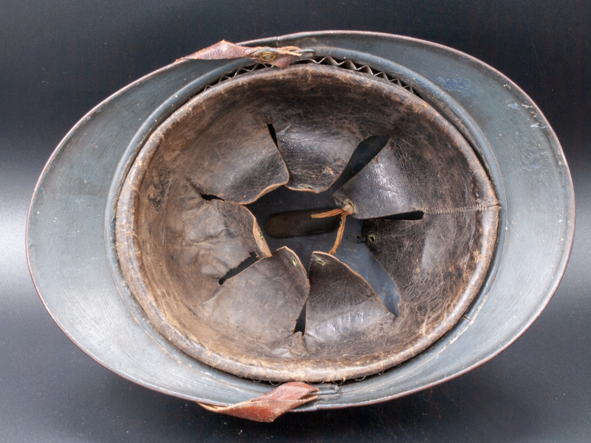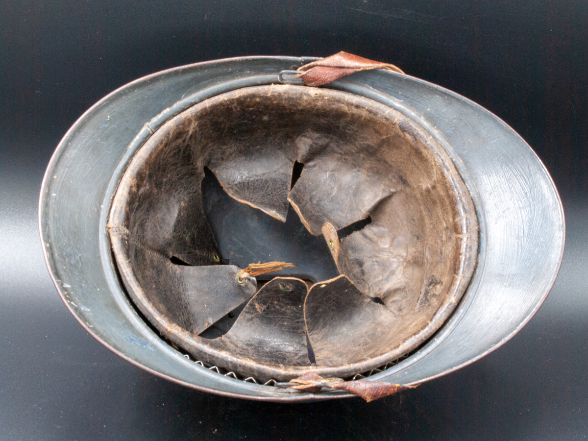 Collector Notes: This is a scarce helmet. There are a number of fakes circulating in the collector market and some of these are convincing. Look for mismatches between the color of the badge and the rest of the helmet. Check also for signs of tampering around the edges of the badge. If it looks suspect, examine the prongs that attach the badge to the helmet in the interior. These should match the color and patina of the rest of the helmet dome and should not have scratches or evidence of repeated bending. Do this very carefully, however, so as not to damage the liner.