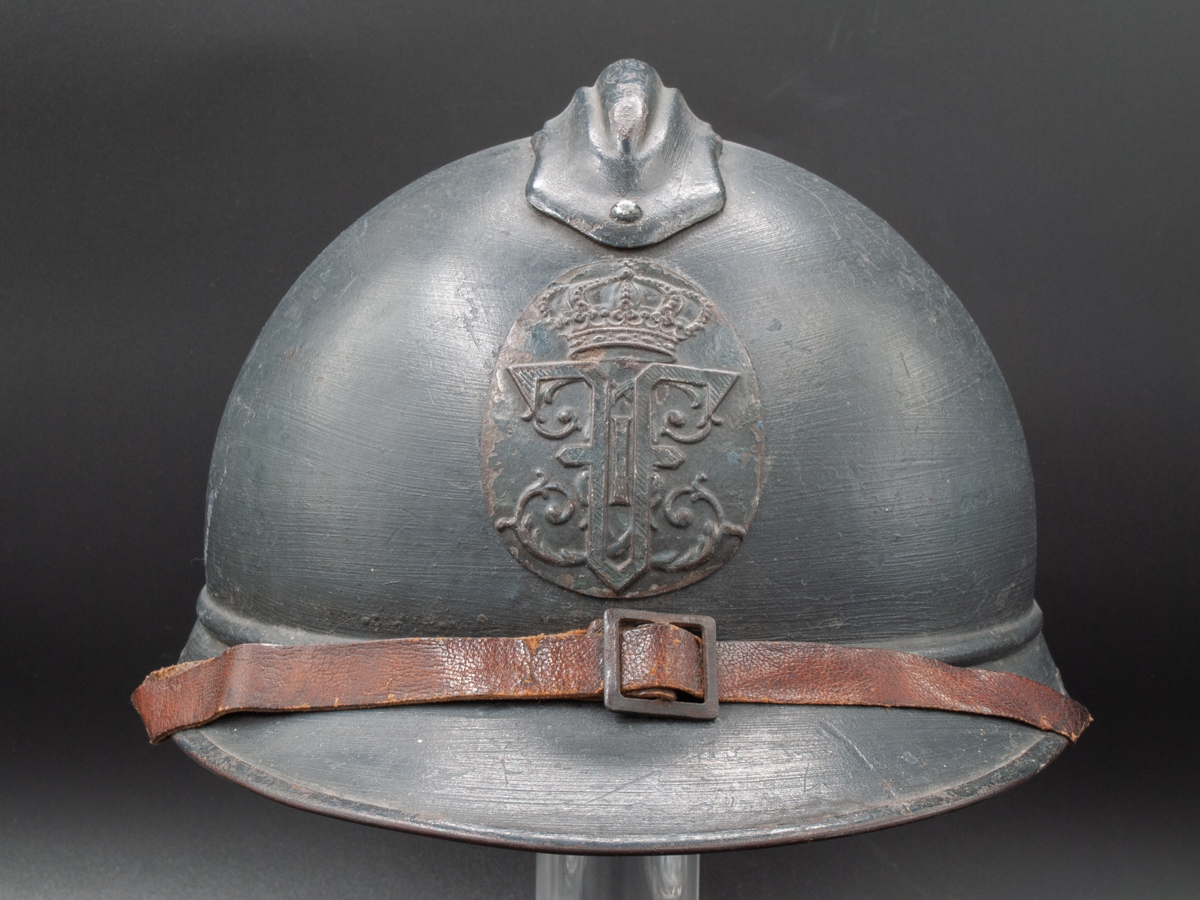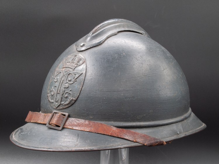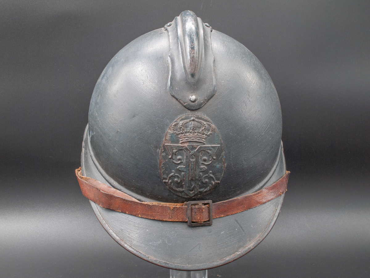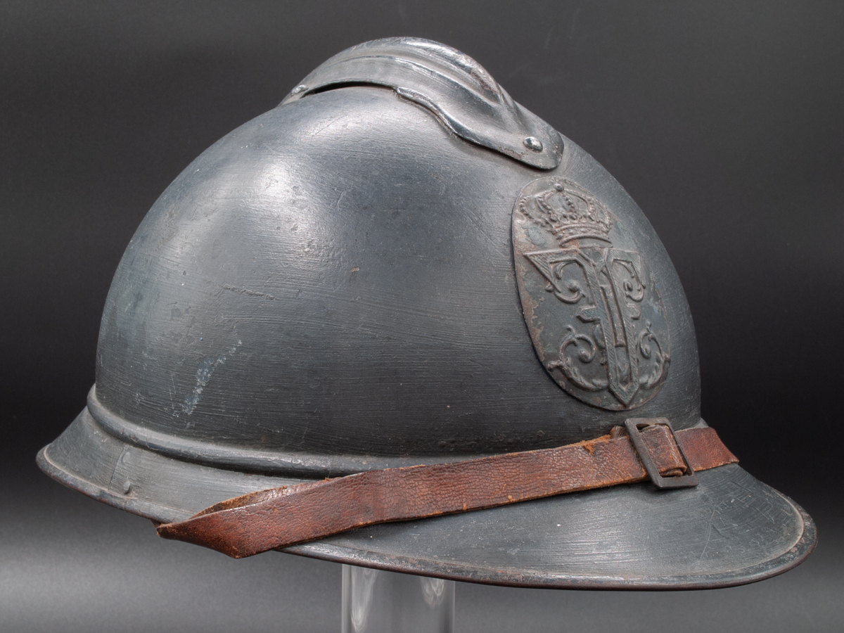 General Information: In late 1916 the Romanians ordered 200,000 Model 1915 helmets from the French, but only 90,000 were delivered. The helmets were painted blue and had the cipher of King Ferdinand I. The cipher consisted of a crown on top of two “Fs” placed back-to-back with a Roman numeral “I” in the middle. In 1923 the Romanian army adopted khaki as the color of their uniform and the helmets were painted the same color. In 1930 King Carol II became king and a new cipher consisting of two back-to-back “Cs” was applied to M15 helmets.[1]
