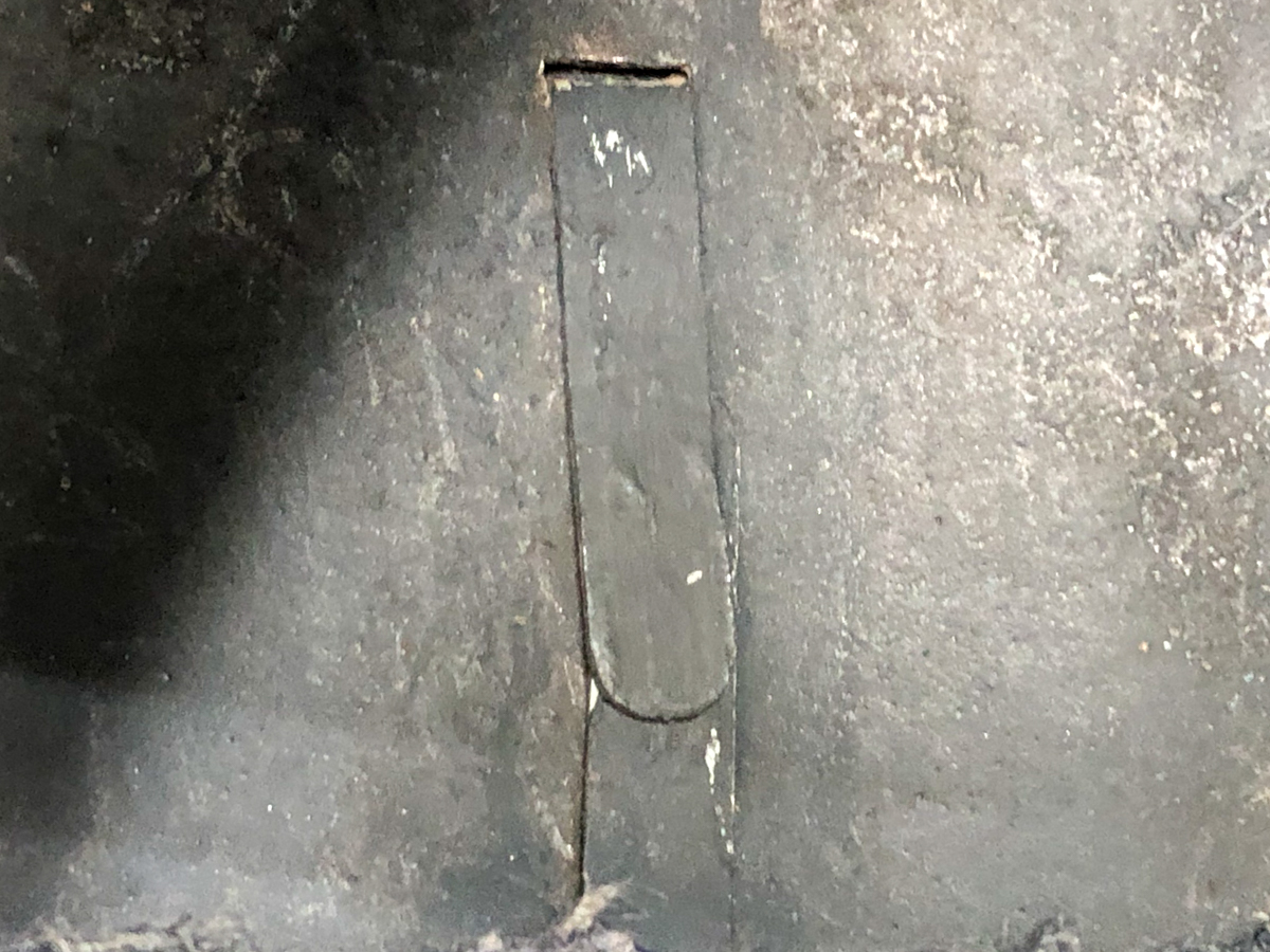Displayed Example: I bought this helmet from Regimentals in the UK. It is complete and appears to have never been tampered with post-war. The original owner’s name is partly visible in the dome: “Dale[?].” It is a size B, or medium size.