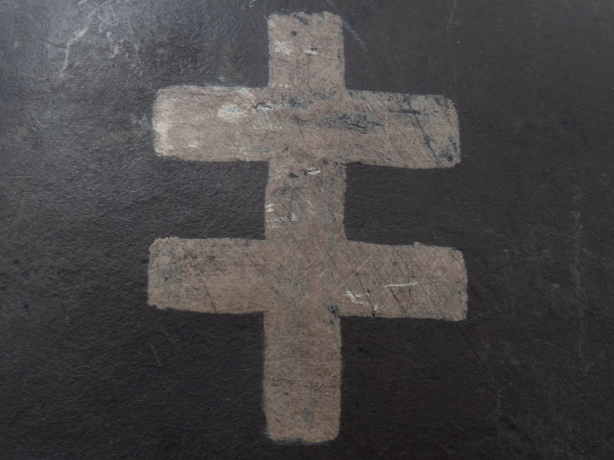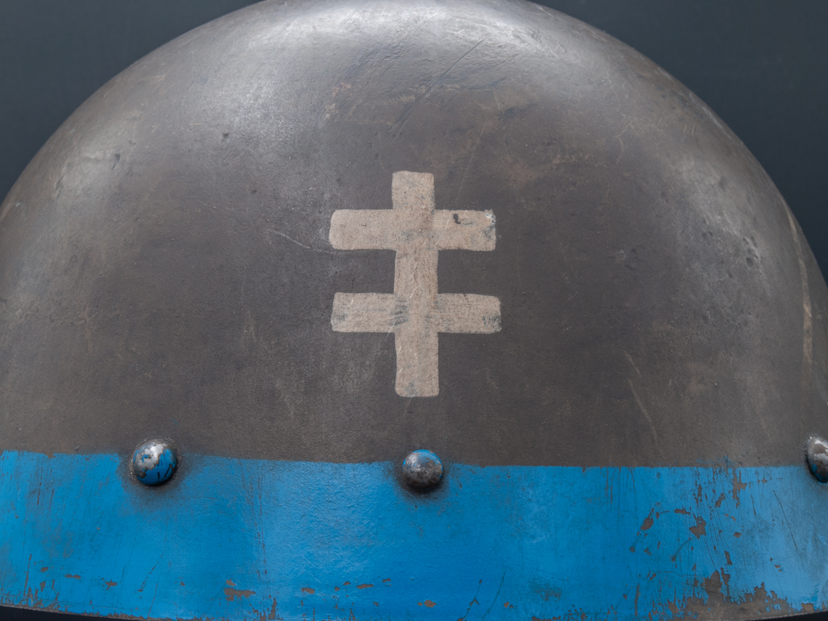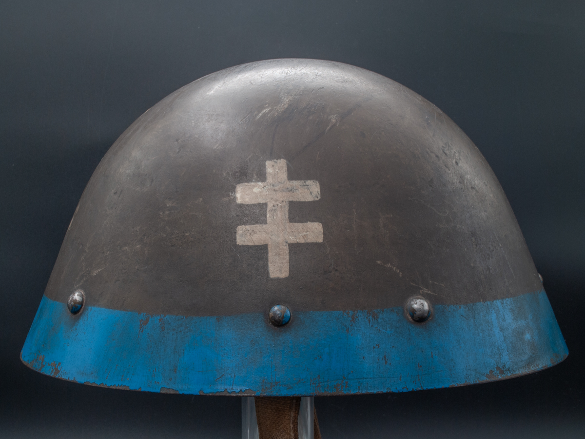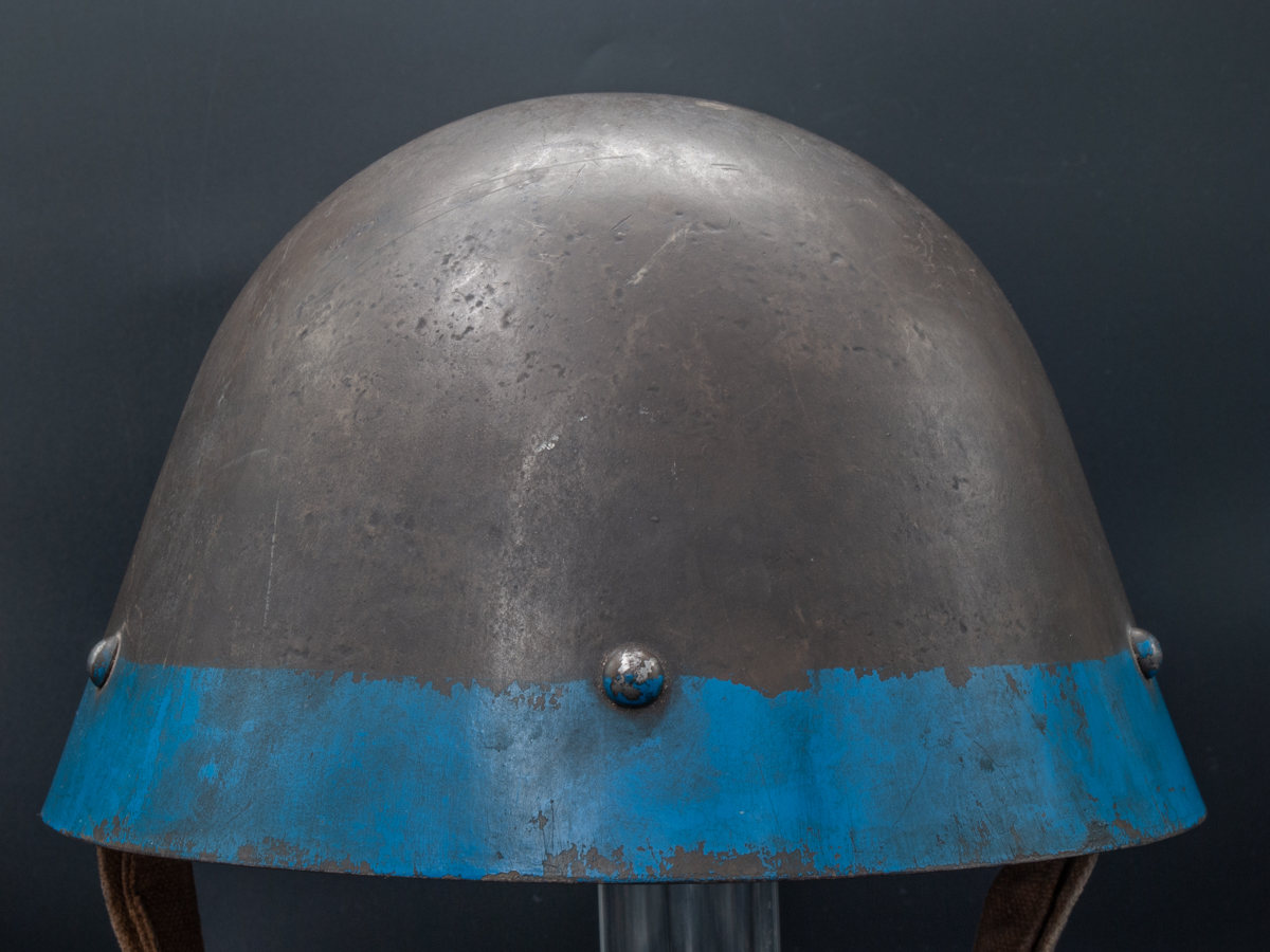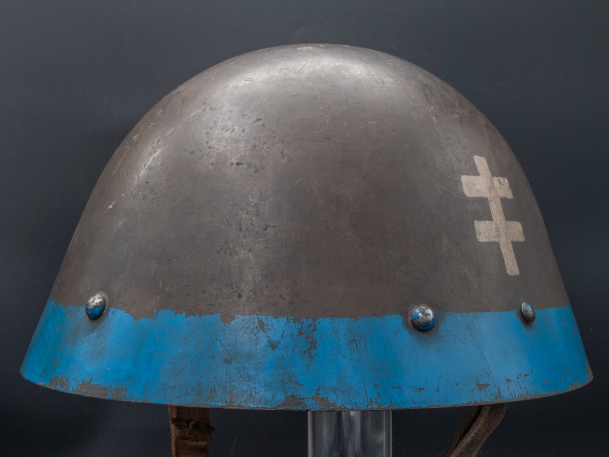 General Information: The Nazi puppet state of Slovakia was the first ally of Germany in the Second World War. It participated in the invasion of Poland and absorbed Polish territories into Slovakia’s newly formed state. The Slovakian army was equipped with vz.32 helmets from the former Czechoslovakian republic. The Slovakian helmets were the same as those used by disbanded Czechoslovakian army, but were often painted with blue bands and white double crosses, which were a symbol of Slovakia. It is thought that the purpose of this distinctive marking was to differentiate the Slovakian helmets from the somewhat similar looking Soviet helmets and therefore minimize friendly fire incidents involving Slovakian soldiers.