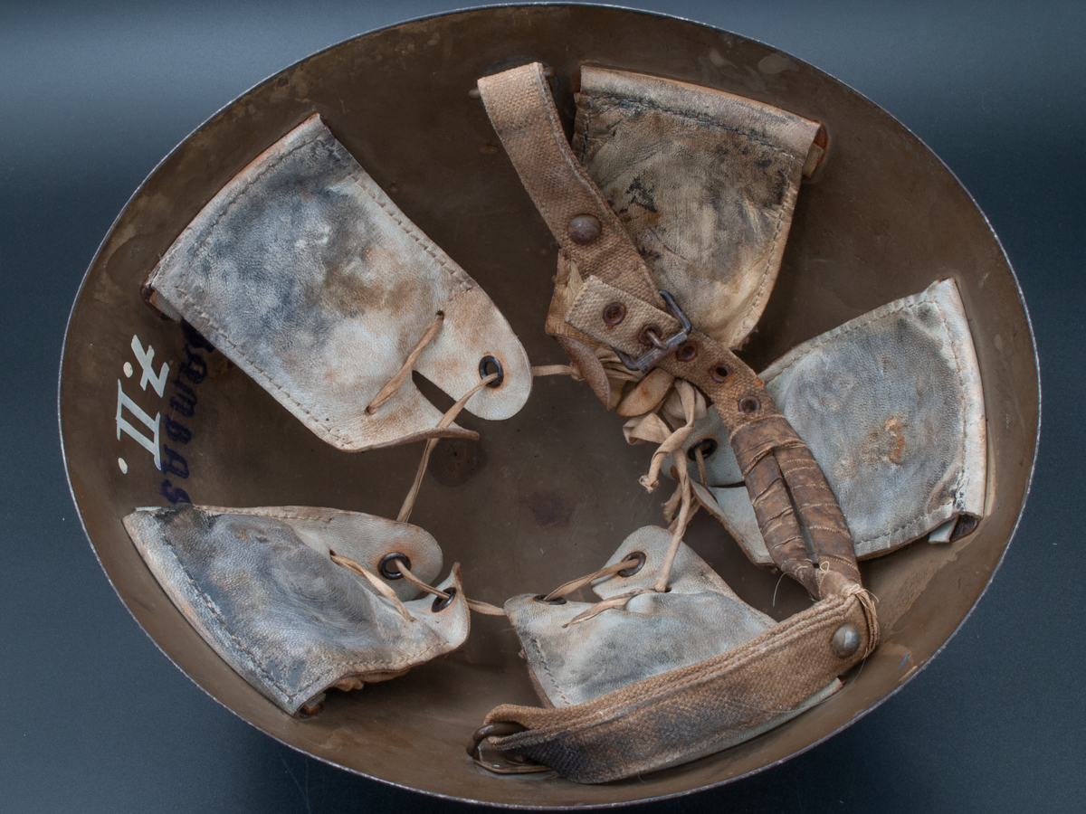 Displayed Example: This helmet has a typical blue band and white double crosses hand painted on both sides. The original owner’s name, “BAMBAS.J” is written in ink on the helmet interior along with a unit number, “7.II.” hand painted with white paint. It appears that some of the ink spilled on the liner pads when J. Bombas was writing his name. The Czechoslovakians produced a version of the vz.32 that was intended for civic use. These can be most readily identified by their web chinstraps. The ones produced for the Czechoslovakian army had leather chinstraps. The civic version of the vz.32 was, however, used in limited amounts by the Czechoslovakian armed forces. Apparently, some of the vz.32s with web chinstraps may have been issued to Slovakian armed forces as well. The displayed example could be one of these. Interestingly, the owner split the middle of the chinstrap and secured the sections with white adhesive tape. This follows the style of the leather chinstraps used on the vz.32s. These had a split in the middle to enable the wearer to fasten the strap to the chin.