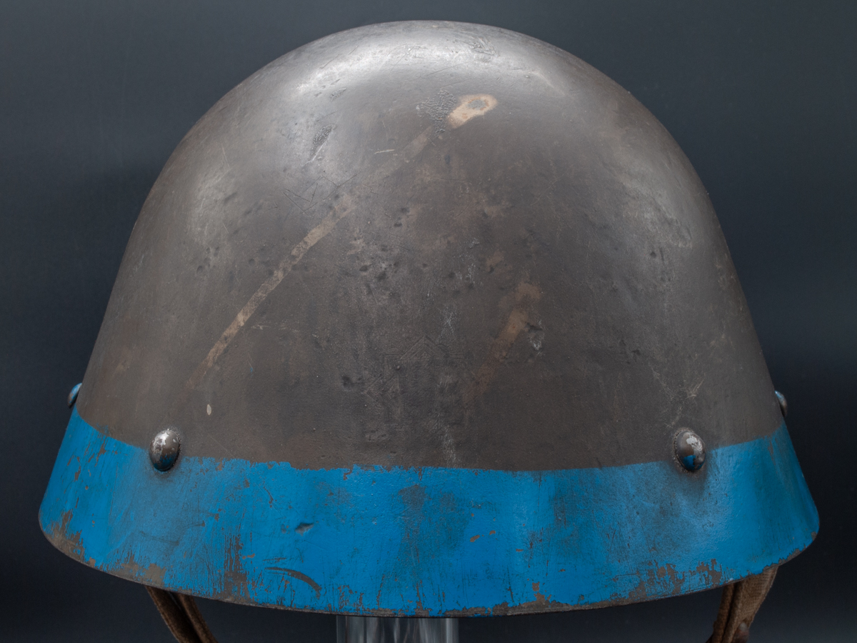 Collector Notes: The Slovakian army was small; it fielded just three divisions. There were relatively few Slovakian vz.32s used in the Second World War. Many Slovakian troops used helmets with just a blue band and no crosses, or sometimes unaltered helmets from old Czechoslovakian army stocks. These helmets are rare and are extensively faked. There are probably more fake ones circulating than authentic ones, so beware. One thing to look for is blue paint over older nicks, scratches and rust spots. If this is an extensive feature of the helmet being examined, then it may be an indicator that the paint was applied post-period. One prominent dealer who has sold several Slovakian vz.32s said that all the authentic ones of this type that he had examined had cloth chinstraps. It seems doubtful that all Slovakian helmets would be this type, but possibly some were. One reliable source has told me that no Slovakian WWII-used vz.32s had cloth chinstraps.1