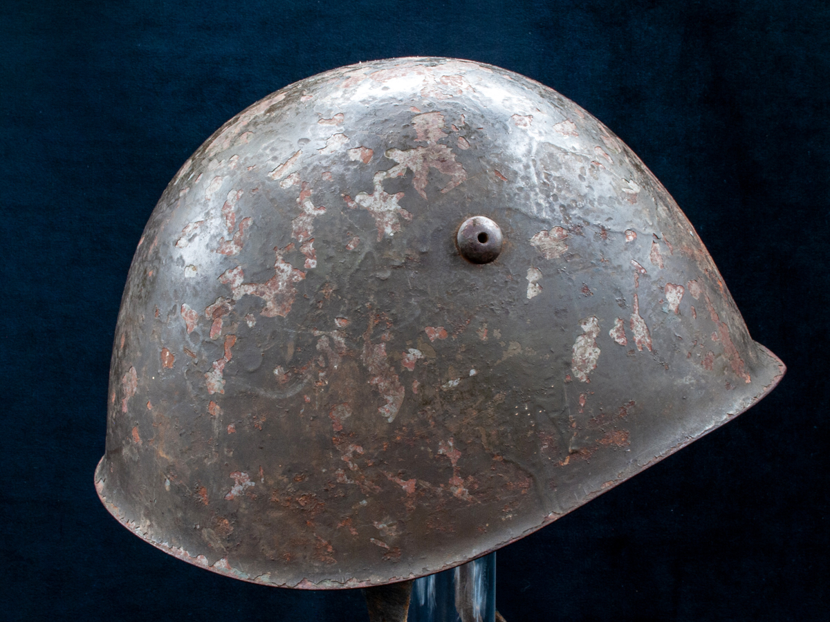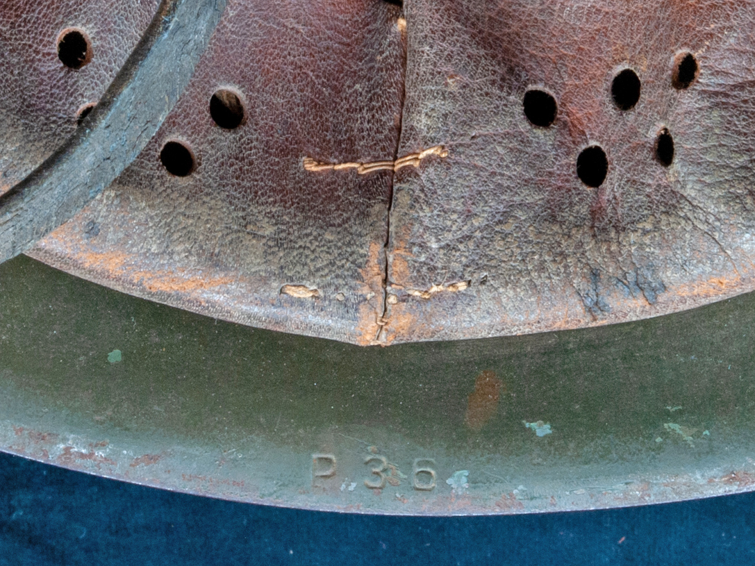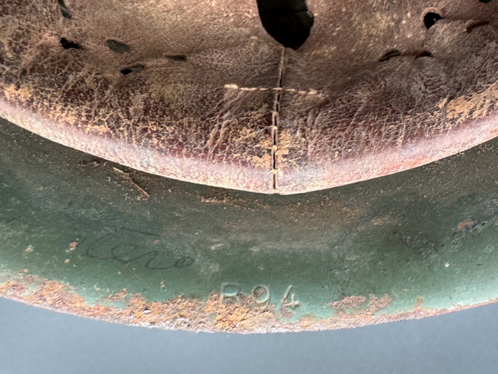 The helmet in the second set of gallery photos below is an item that I bought at the Show of Shows in Louisville, Kentucky in 2019. It shows evidence of once having had a bracket for a Spanish badge. Eventually the badge brackets became standardized, but on some helmets, presumably early modified ones, there were distinct types of brackets affixed in different ways. In some instances, the badges were welded directly to the helmets. Often these brackets were not well attached and tended to break off, as is the case with the example displayed.