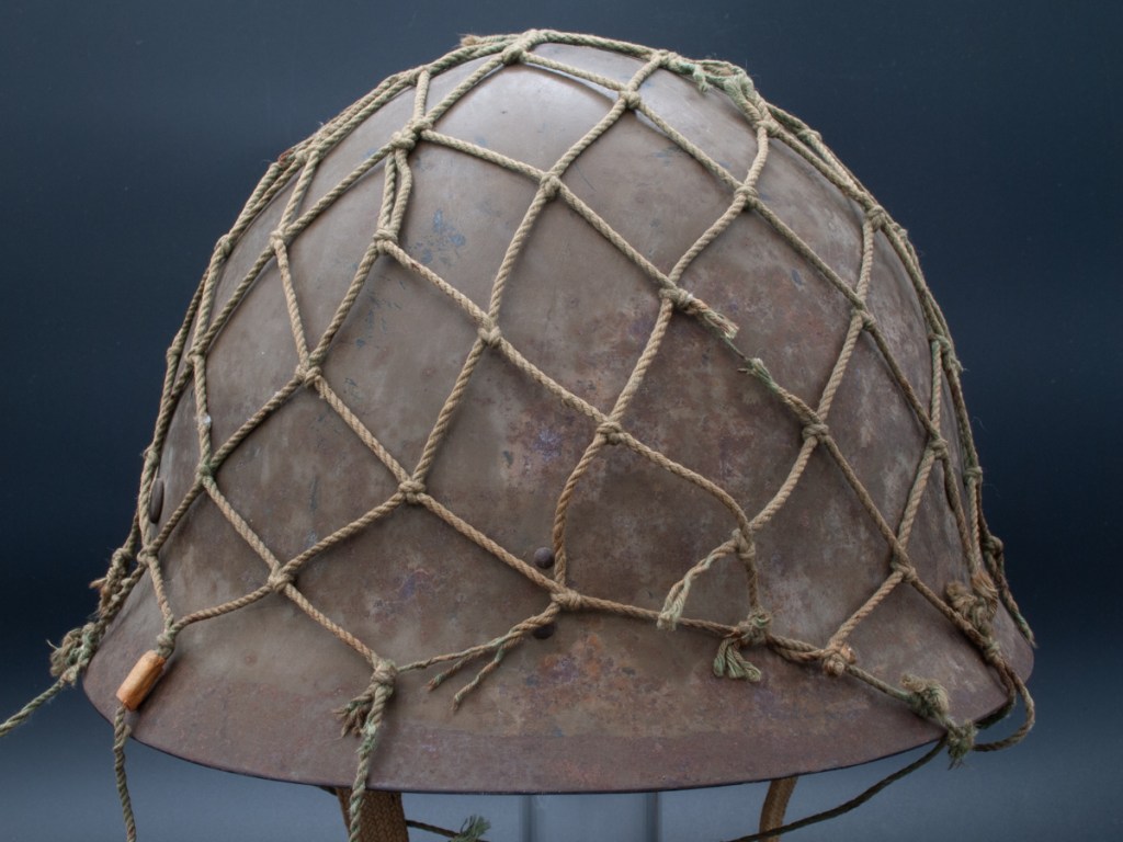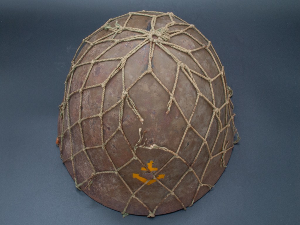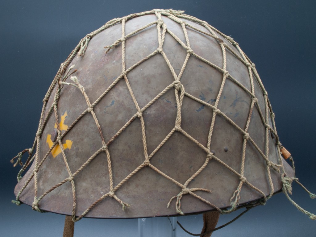 Displayed Example: I purchased this helmet from German Helmets, Inc. in 2006. It seems to be completely original, including the net, which by all appearances is original to the helmet. It has a stenciled yellow anchor rather than a metal badge. The helmet could have been worn by a member of the regular navy or the Special Naval Landing Forces. The fact that it has a net indicates that it was used on land where camouflage was needed. This increases the possibility that it was issued to a member of the SNLF. Regular naval troops also fought on land, however, particularly towards the end of the war when many sailors were left without ship duty after their ships were sunk by Allied forces. There were other kinds of land-based naval troops such as those belonging to aviation and guard units. It should be pointed out, therefore, that helmets like the one displayed here are often presented as SNLF helmets, this type was used by a variety of naval troops. Unless the piece is unit marked, it is not possible to say with any certainty whether or not an IJN helmet was used by SNLF personnel.