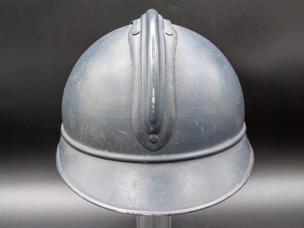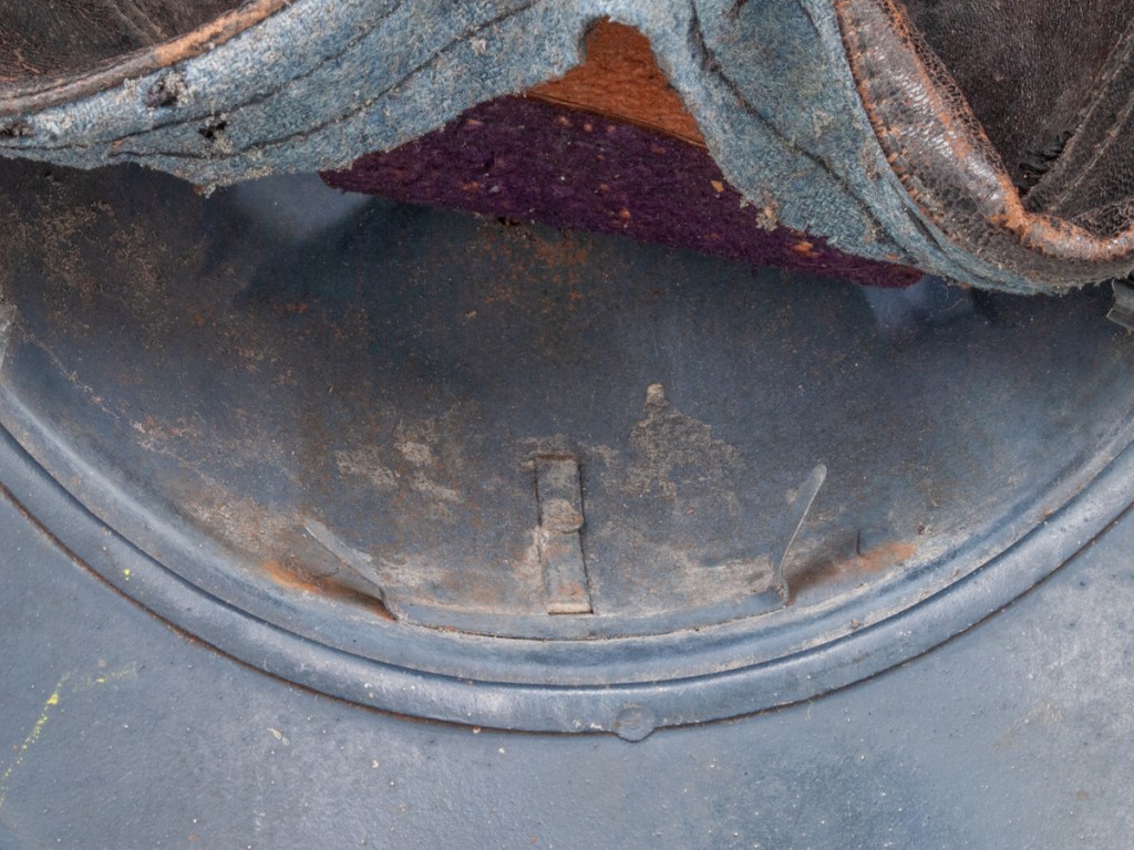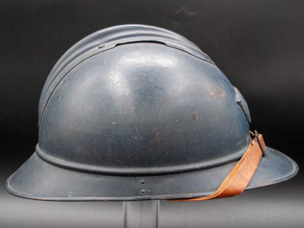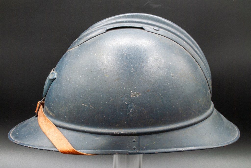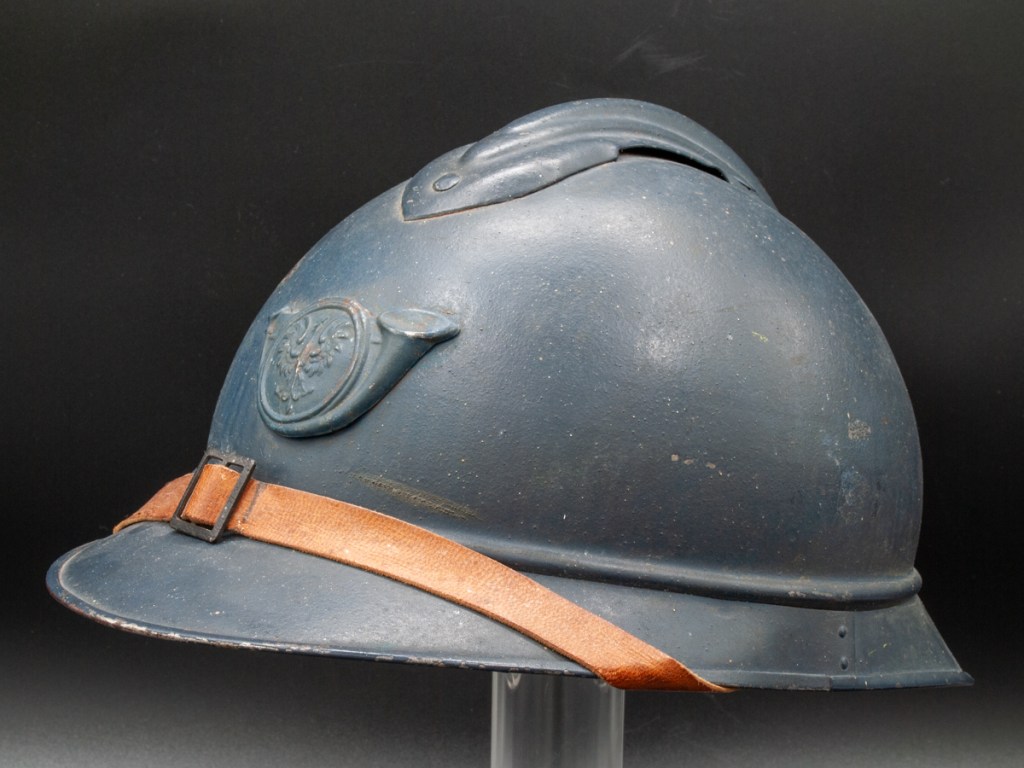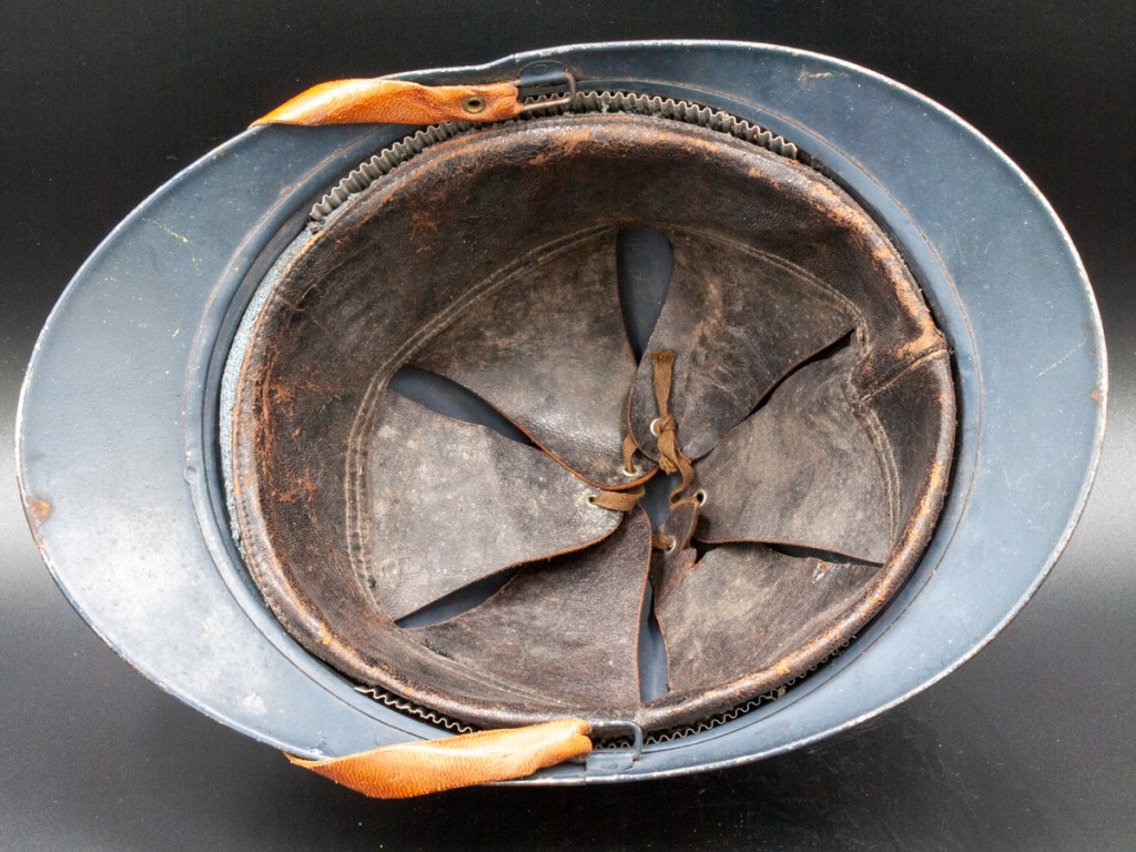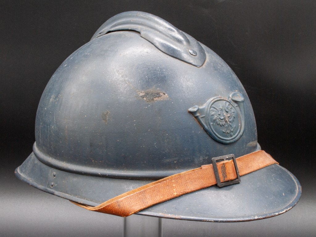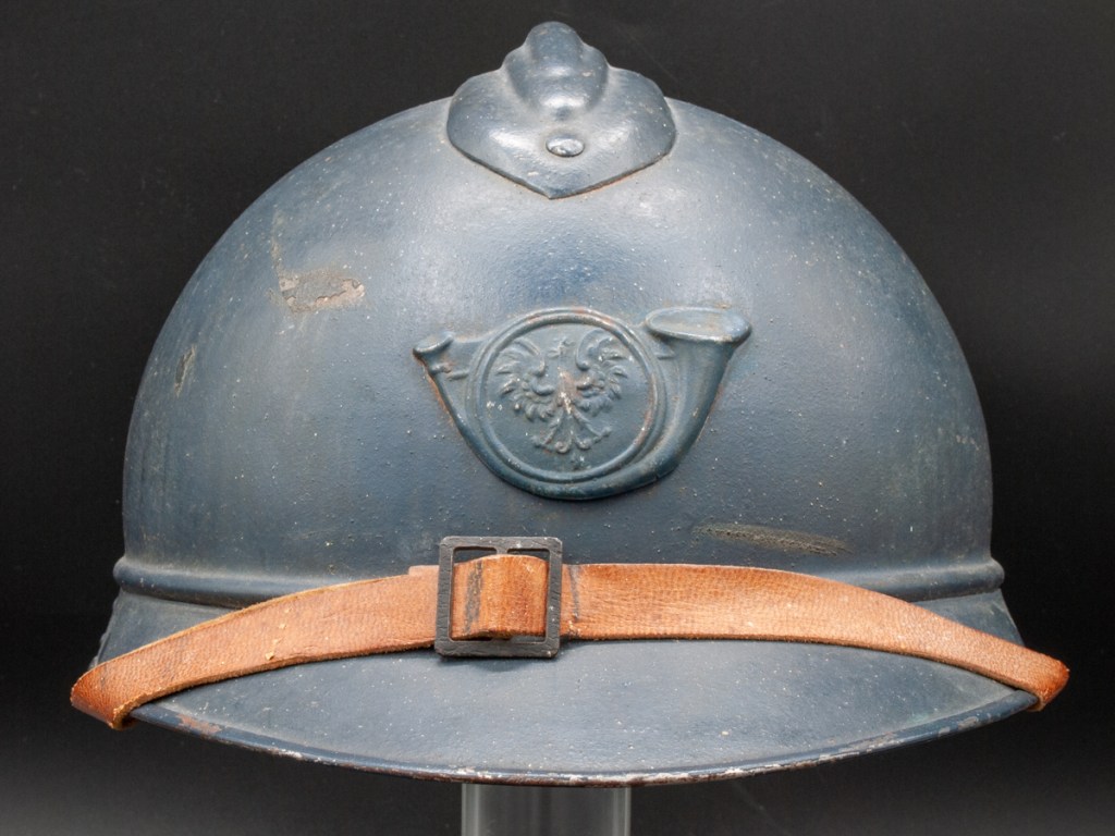 The helmet and all components, excepting the badge, are perfectly original. Furthermore, the helmet type – a dark blue painted M15 manufactured by the Compagnie Coloniale company with second-pattern liner – is a type known to have been used for the helmets issued to Polish troops. The presumed reproduction badge is the more common chasseur type badge. On the interior dome is an anchor stamp with the initials “CC” for Compagnie Coloniale. The helmet is stamped size B for medium size.