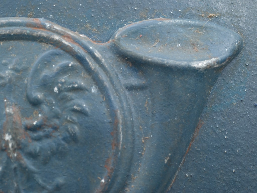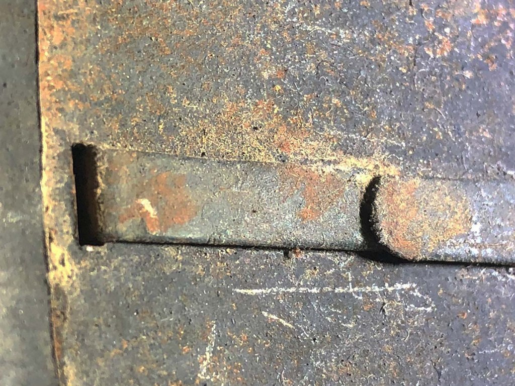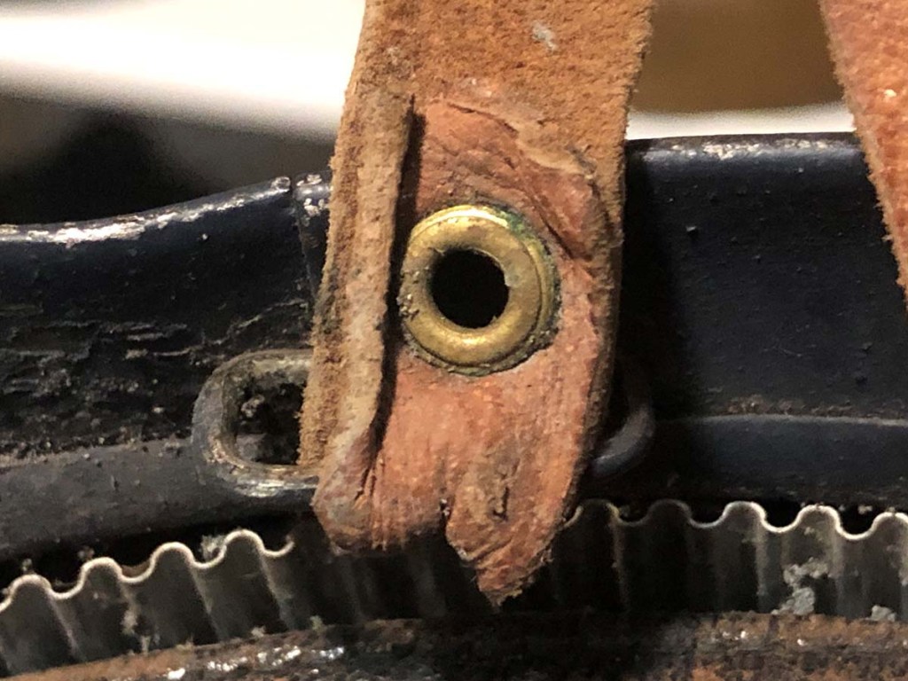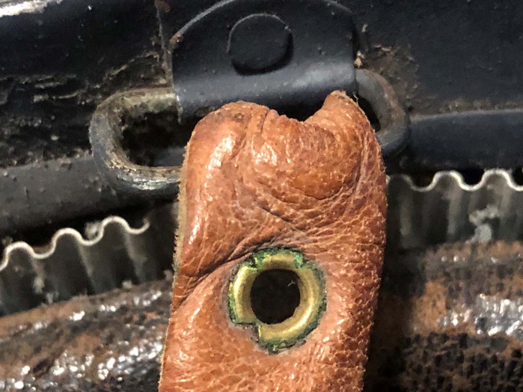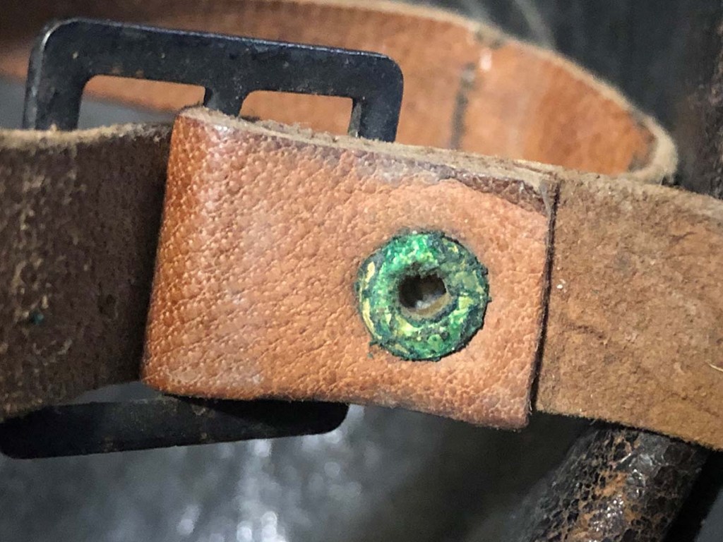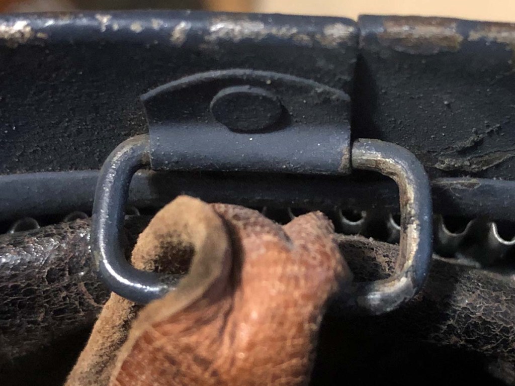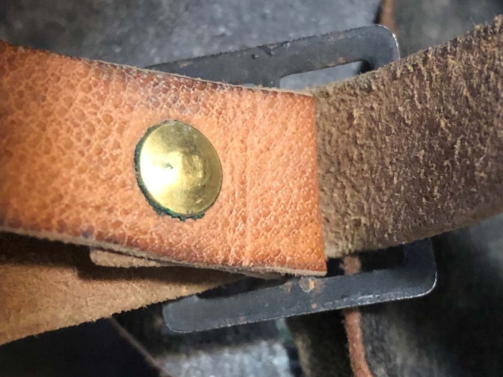 The helmet and all components, excepting the badge, are perfectly original. Furthermore, the helmet type – a dark blue painted M15 manufactured by the Compagnie Coloniale company with second-pattern liner – is a type known to have been used for the helmets issued to Polish troops. The presumed reproduction badge is the more common chasseur type badge. On the interior dome is an anchor stamp with the initials “CC” for Compagnie Coloniale. The helmet is stamped size B for medium size.