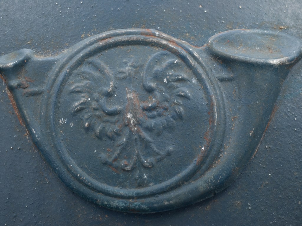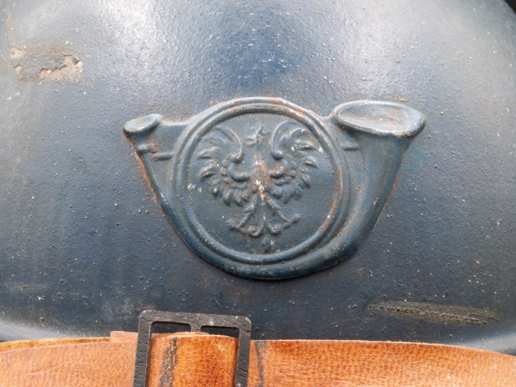 General Information: During the First World War the French equipped Polish volunteers with French equipment including Model 1915 Adrian style helmets. These were fitted with pressed metal badges following the pattern of French chasseurs units, but with a Polish eagle in the center of the disk rather than “RF.” A less common badge was larger and oval shaped with a Polish eagle.