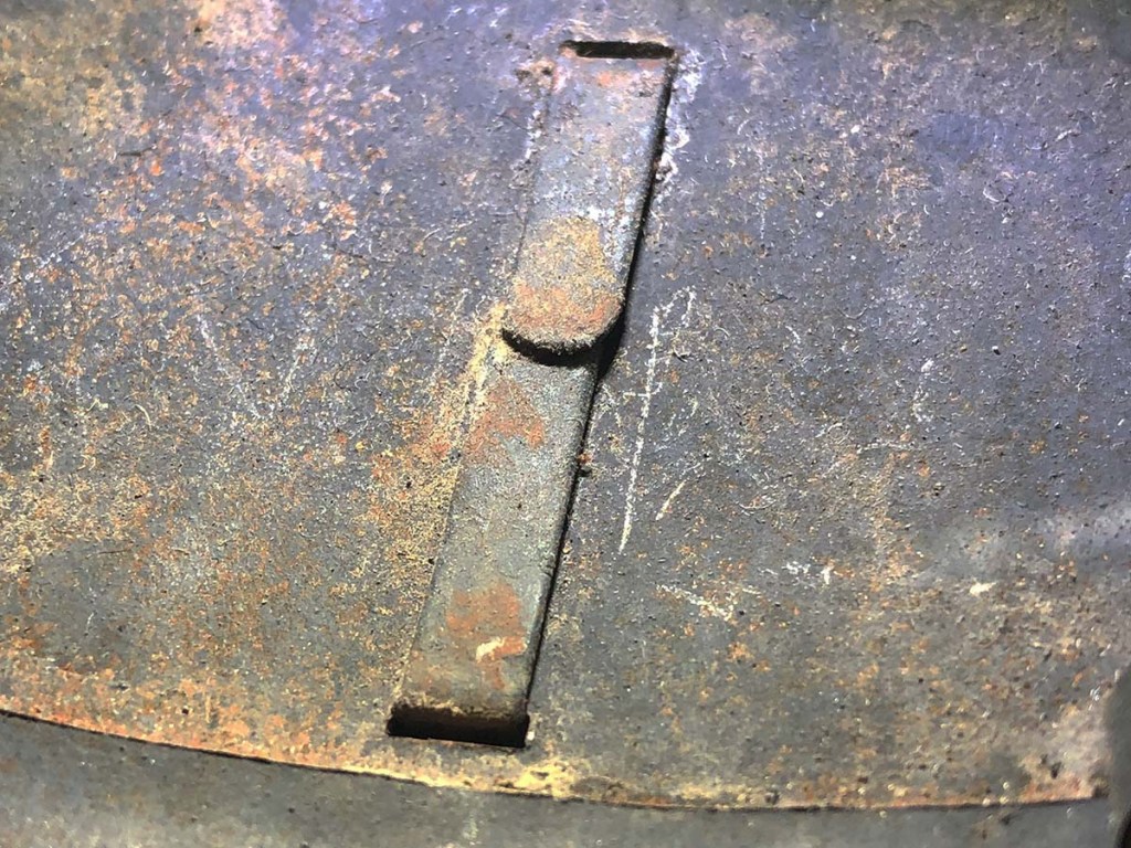Displayed Example: I bought this at the Show of Shows in Louisville, Kentucky in 2015 from a prominent UK-based dealer. Of course, we have to be skeptical about this type of extremely rare helmet because fakes abound. I showed the helmet to collector friends at the show and almost all thought it was good. A Polish collector who was writing a book on the subject of Polish military helmets said he thought it “might be” original. I sent photos of the piece to a top French authority on Adrian helmets who is also an aspiring book author. His judgement based on photographs: also “maybe.” So, the helmet sat on my shelf for several years, but there was always a question of its authenticity. Recently, I mailed the helmet to my French collector friend for analysis. In-hand, he judged the helmet to be a high-quality reproduction. The revealing feature was the slight color variation around the edge of the badge.