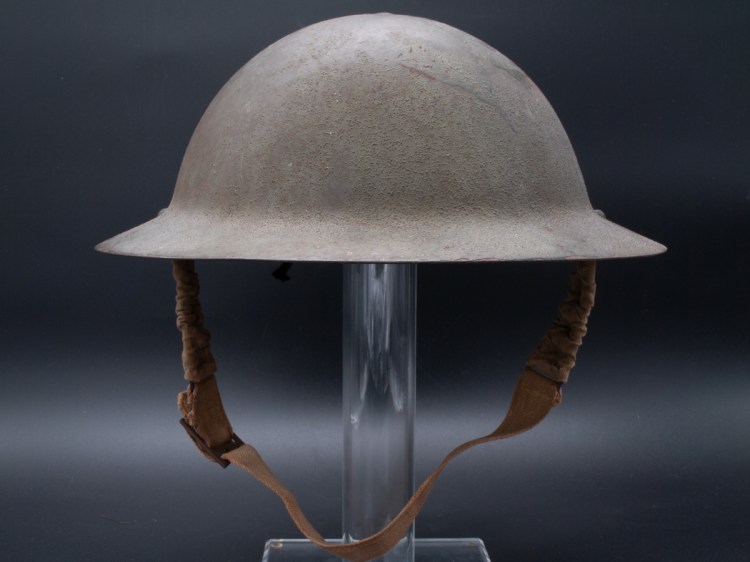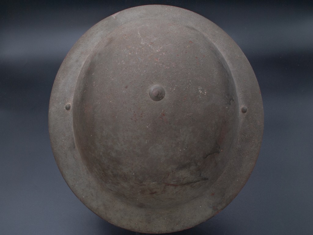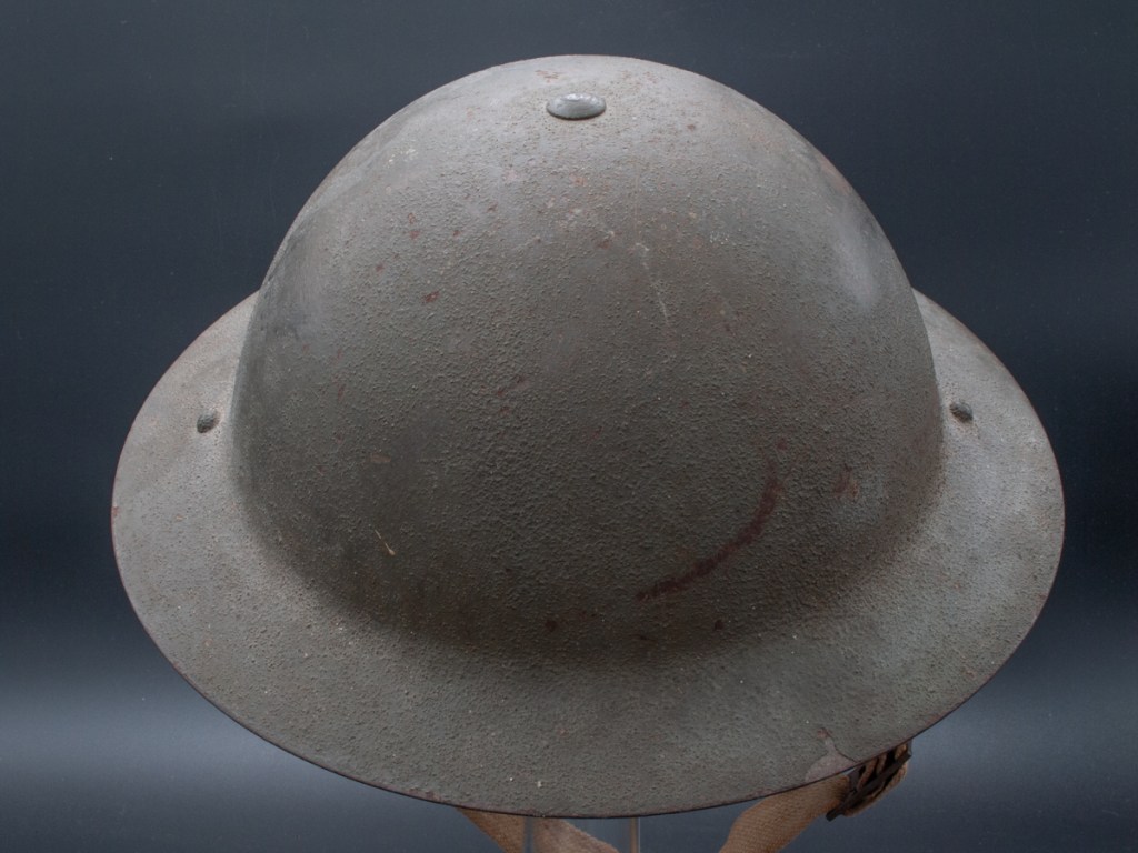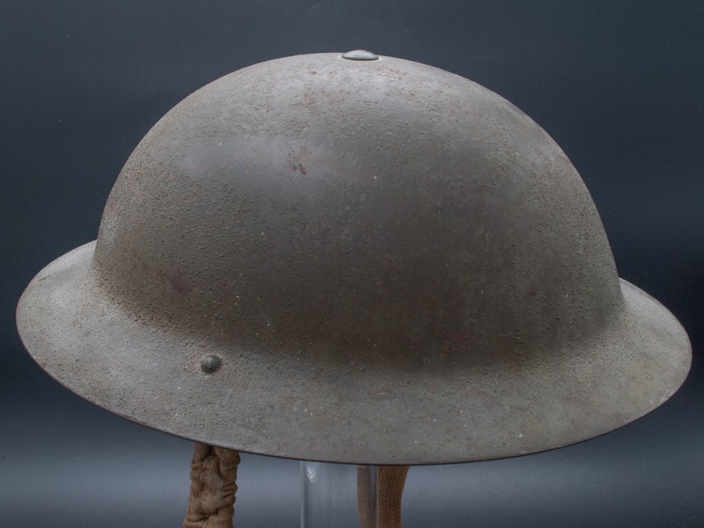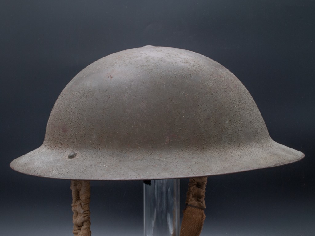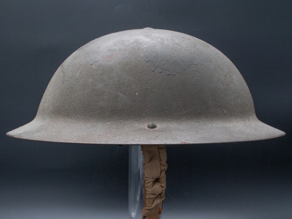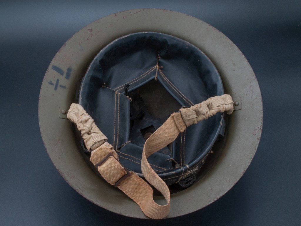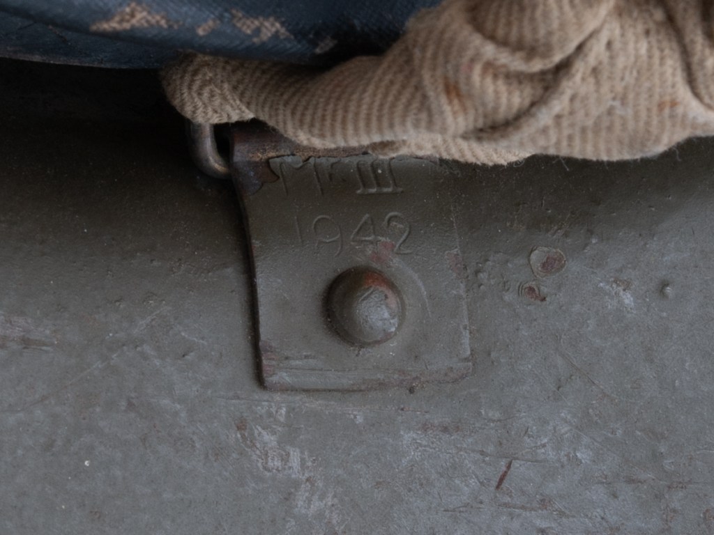 Displayed Example: This helmet has a prominent stencil indicating the liner size which is 7 ¼”. The chinstrap lugs are both marked “MKIII 1942.” On the interior dome there is a broad arrow military inspection stamp. The original owner wrote his name in pencil on the rim. The name appears to be “H. PRIO.” I purchased this one for a modest price on eBay around 2009.