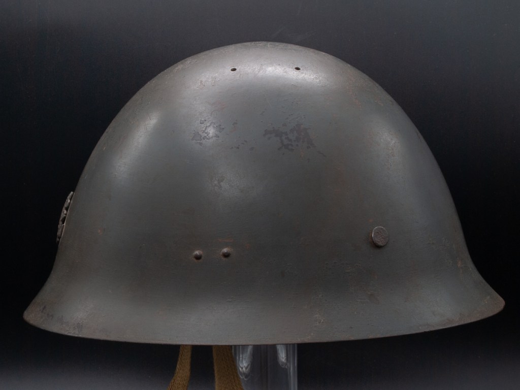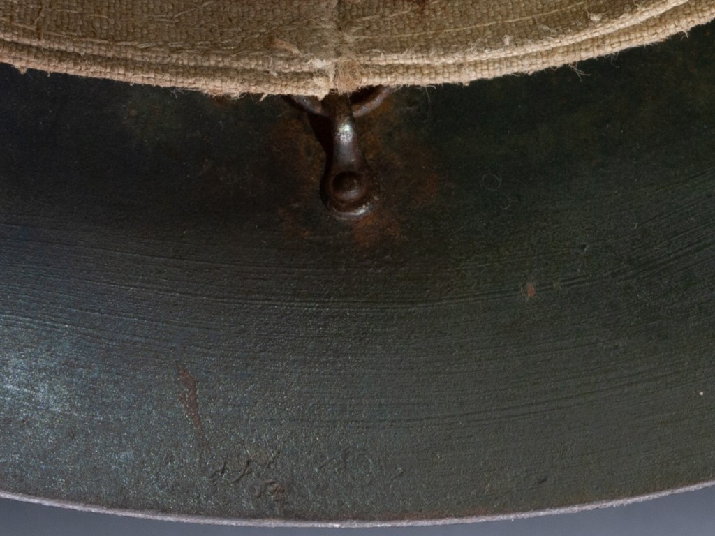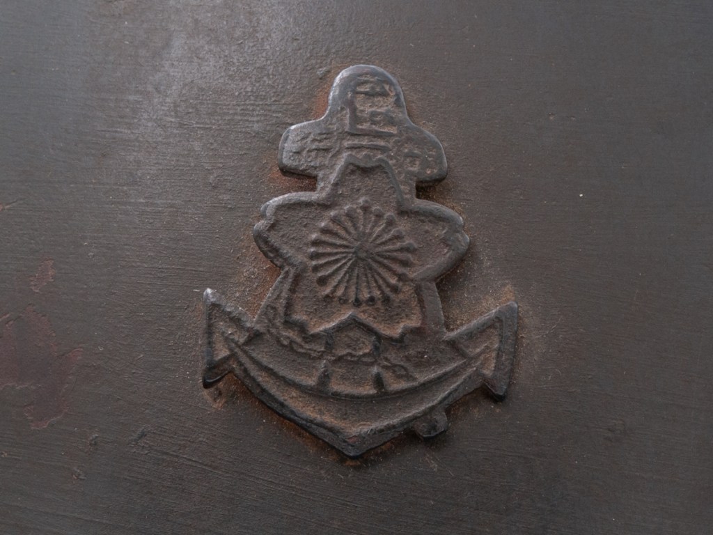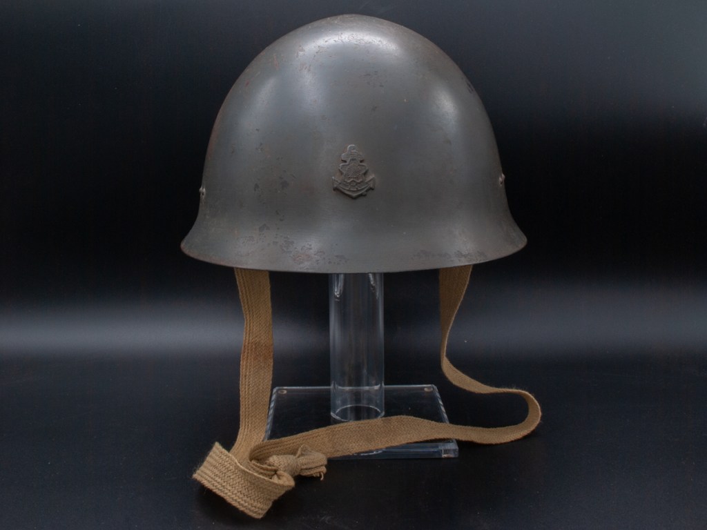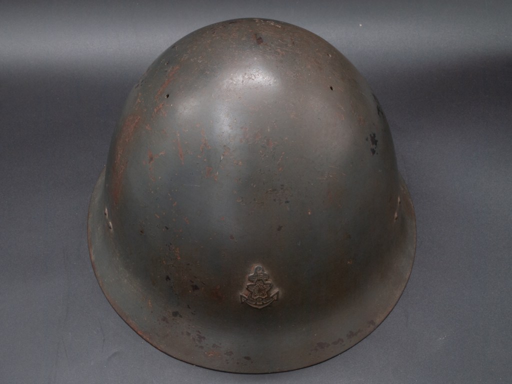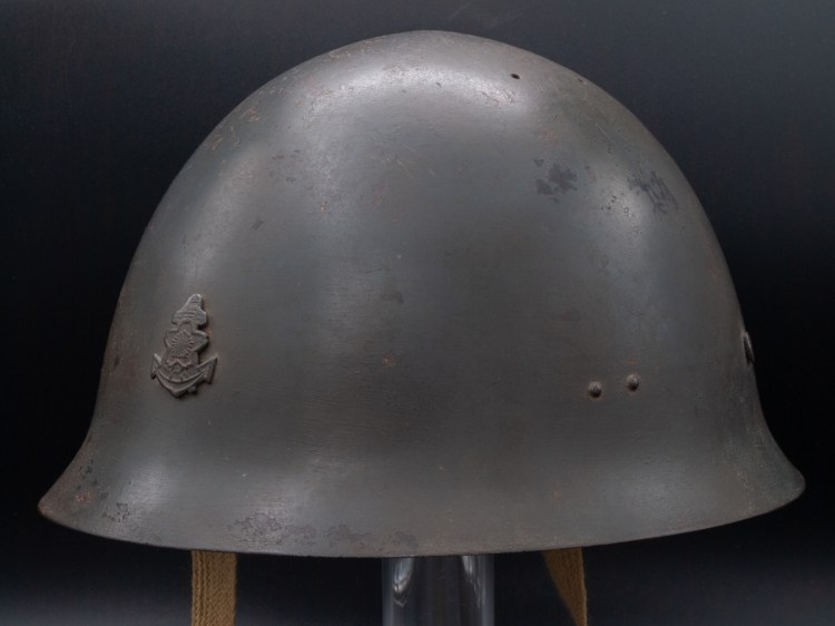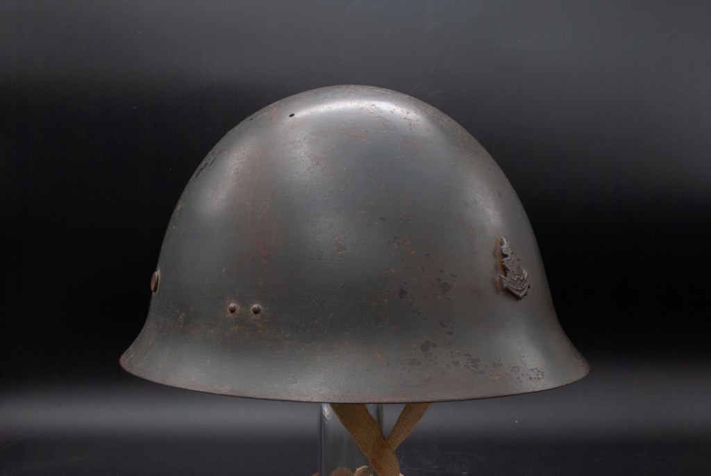 General Information: The Imperial Japanese Navy (IJN) had procurement lines that were different from those used by the Imperial Japanese Army (IJA). Both armed service branches used the Type 90 steel helmets, but there are differences in how their respective helmets were configured. The most prominent difference is that the IJN helmets had metal badges representing an anchor with a stylized cherry blossom. Some of the late-war helmet had painted yellow anchor emblems in lieu of a metal badge. The army helmets, in contrast, had five-point stars. In addition, many of the IJN helmets were painted “shipboard grey” although most were painted brown like the IJA helmets. Some were also painted green. The IJN helmets typically had white painted characters in the dome which indicated the location of the wearer’s service station, which could be the name of a ship, or an assignment within a ship, like engine room or artillery. It should be pointed out that not all of these helmets were used on ships. Frequently they were used by land-based naval troops such as those assigned to guard duty, detached to aviation units, or Special Naval Landing Forces (SNLF). Land-based IJN troops serving in combat roles would have mainly used brown versus shipboard grey helmets. Like the army helmets, the navy helmets were often worn with cloth covers. The IJN covers had oval badges made of cloth with yellow anchors. IJN helmets were often worn with camouflage nets. This configuration would typically have been used by naval troops assigned to combat roles, like the SNLF.