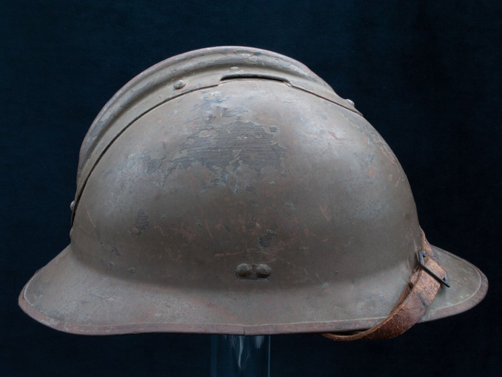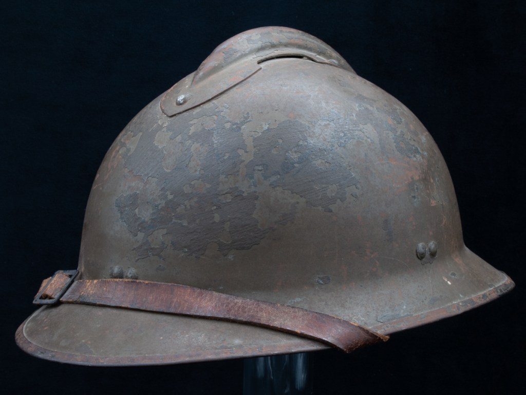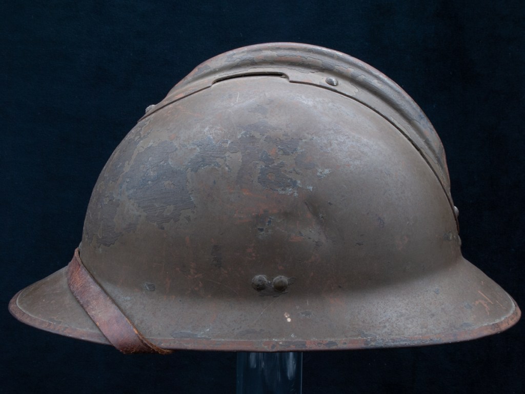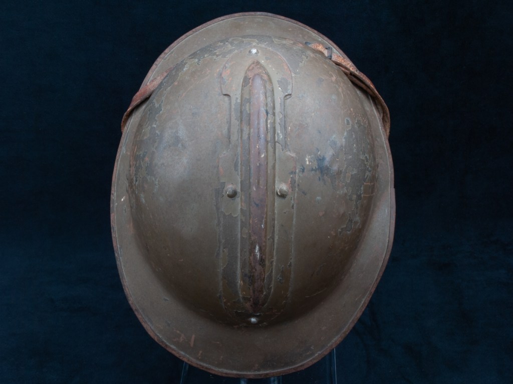 General Information: The French produced an export version of the Model 1926 helmet that was used by Republican forces during the Spanish Civil War. The was nearly identical in appearance to the domestic version but for the lack of holes in the front for a badge. The export M26s were made of mild, magnetic steel, so the were not as strong as the helmets used by the French armed forces. These helmets are typically found with Spanish three-pad liners of the German M16 style. Some were refitted with Spanish Nationalist eagles post-Civil War.