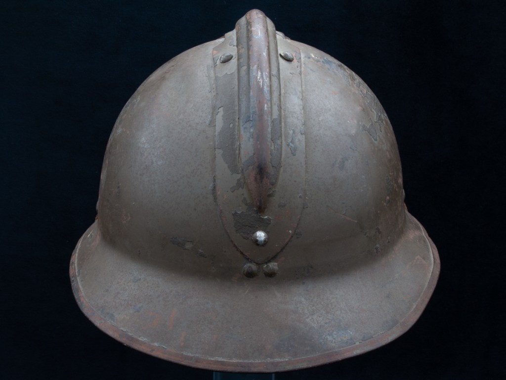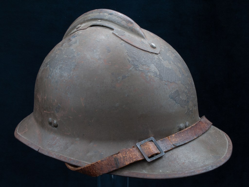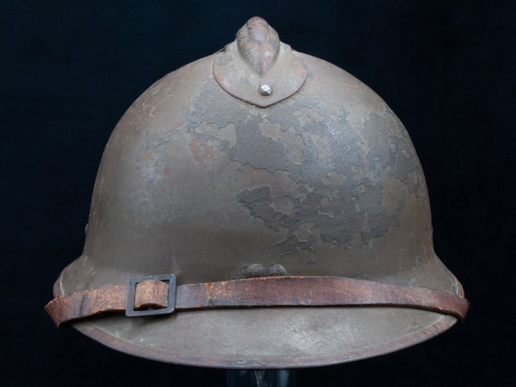 Displayed Example: This a classic example of the type. It is made of magnetic steel. The original factory paint is mostly intact. A second period-applied coat of paint has largely flaked off. There are no manufacturer’s stamps in the dome as would be normal for domestically used French M26s. (Lack of manufacturer stamps seems to be a feature of export helmets from this period.) The comb on top is made of steel rather than aluminum which would be typical of the M26s used by the French. This specimen has its original French-made liner which is less common for surviving M26s. Usually they have Spanish replacement liners.
