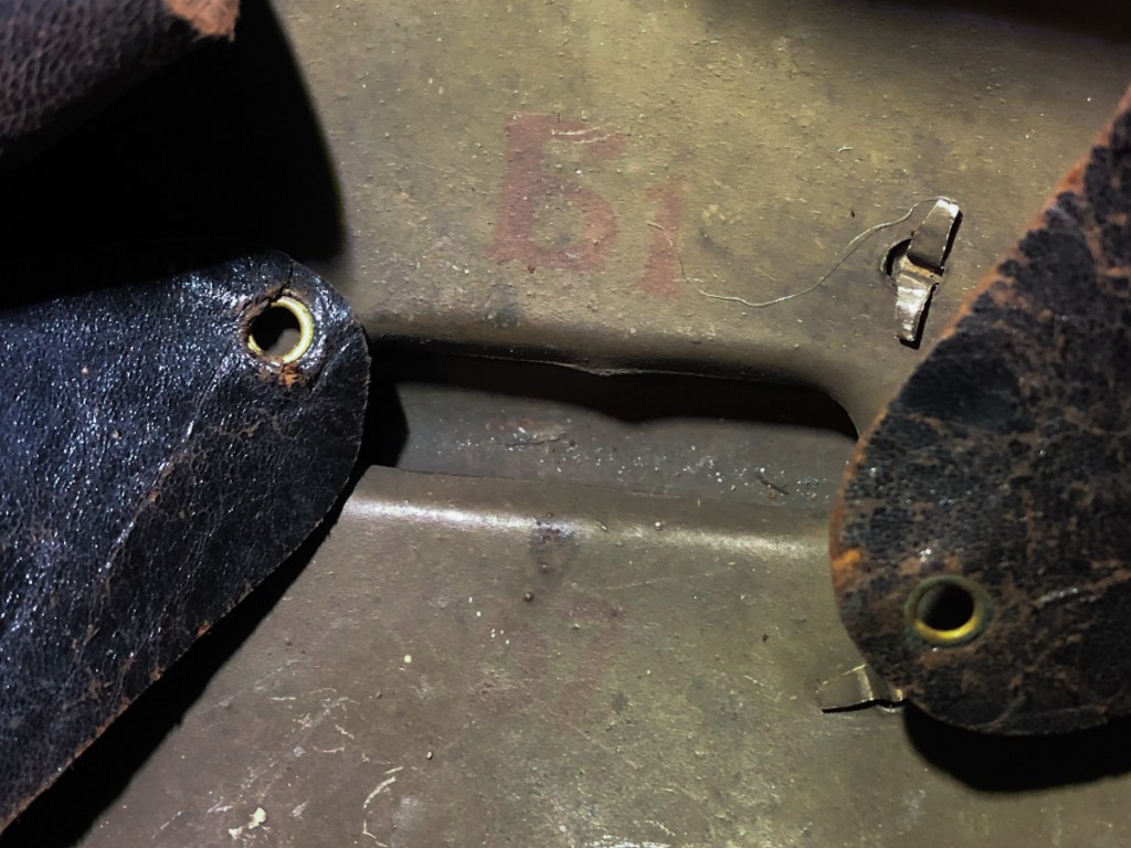 The helmet has no manufacturer stamps in the dome, but there are two size stamps in red ink: Б 1 and 57. The “Б” is a Cyrillic “B.” The M23s issued to French armed forces were produced in three sizes: B, C, and D. There was no size A as with the older M15s. Each of the three sizes of shells could accommodate three different sizes of liner as follows: Size B = 54, 55 and 56 cm, Size C = 57, 58, and 59 cm, Size D = 60, 61, and 62 cm. This replaced the scheme for the M15s which was as follows: Size A = 54, 55, and 56cm, Size B = 57, 58, and 59cm, Size C = 60, 61 and 62cm.[1] The French helmets sometimes have redundant numberings for the sub-sizes. For example, a B1 corresponds to a 57cm, a B2 corresponds to a 58cm, etc. This Yugoslavian export version of the M23 with a size B shell and a size 57 liner, follows the sizing protocol used on the M15s rather than that used on the M23s issued in France. Interesting? I thought so.