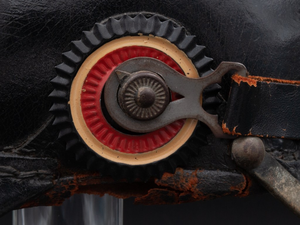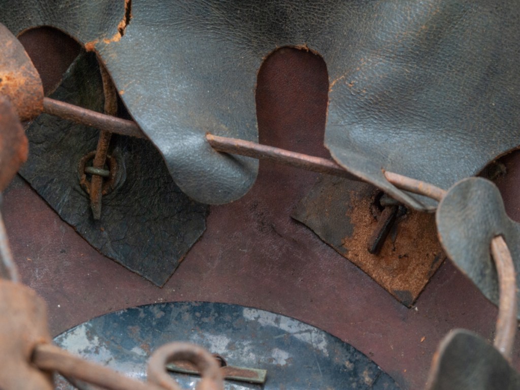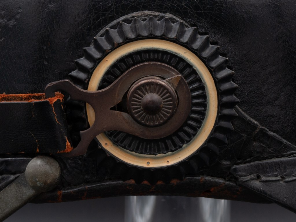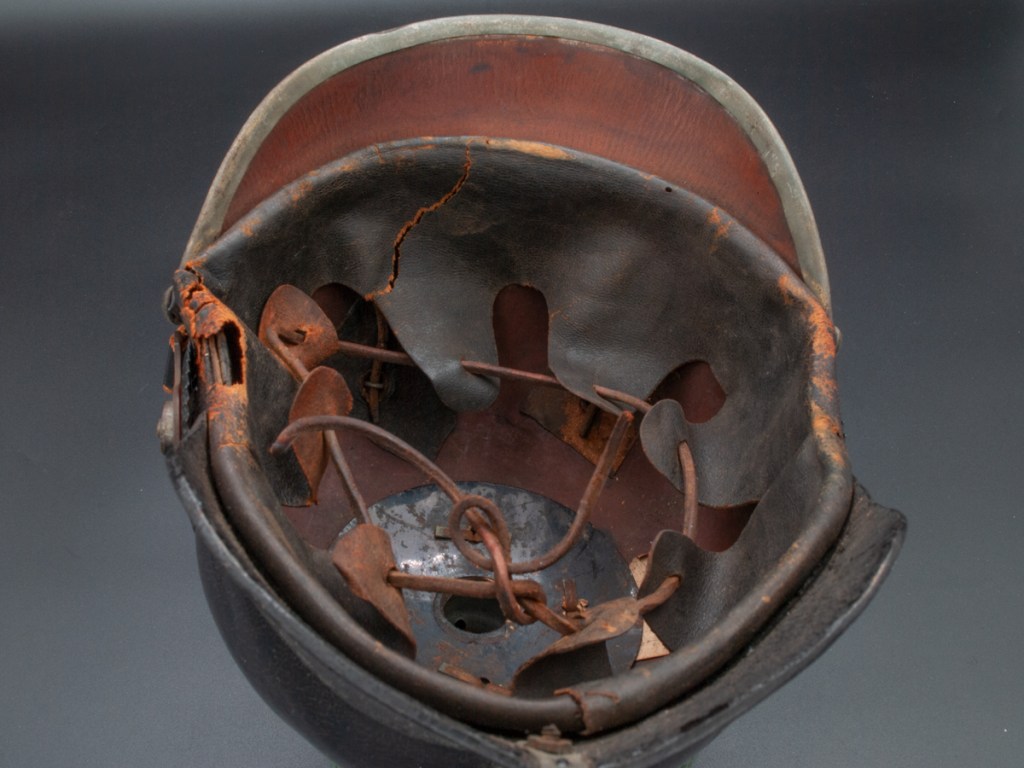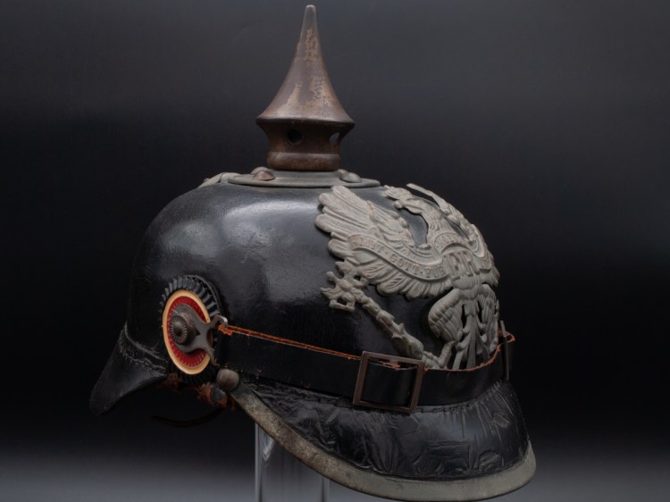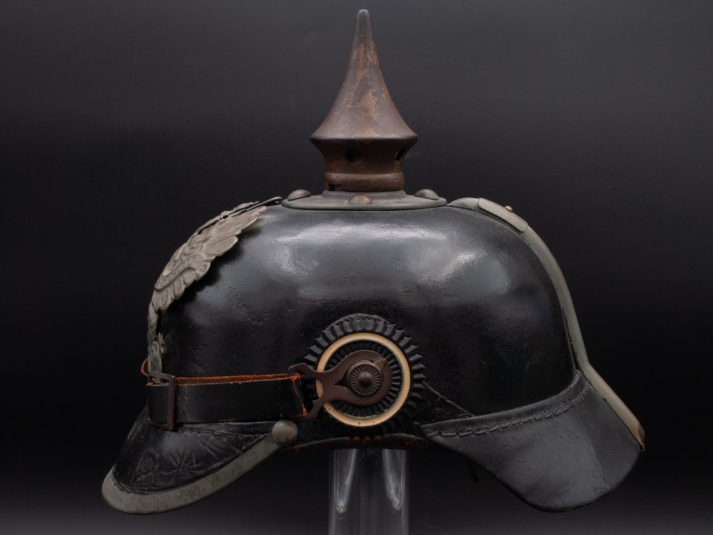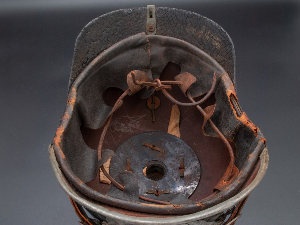 I purchase this helmet recently from an old collection. The previous owner bought the helmet sometime in the 1960s. It is a Prussian enlisted man’s Model 1915 grey trim pickelhaube. The helmet is complete and by all appearances, and as far as I can detect, is 100% original. The thing that drew me to this piece is the that it has all its original components down to the leather liner string and the small leather wedges that hold the front plate to the body. Although not a rare type, it is unusual to find M15 pickelhaubes that are complete and not altered over the decades. There are no markings that I can discern. The liner and chinstrap are brittle and fragile. The chinstrap was broken when I purchased this piece. It now has a subtle, nearly invisible repair, just behind the slide buckle on the right side of the helmet.