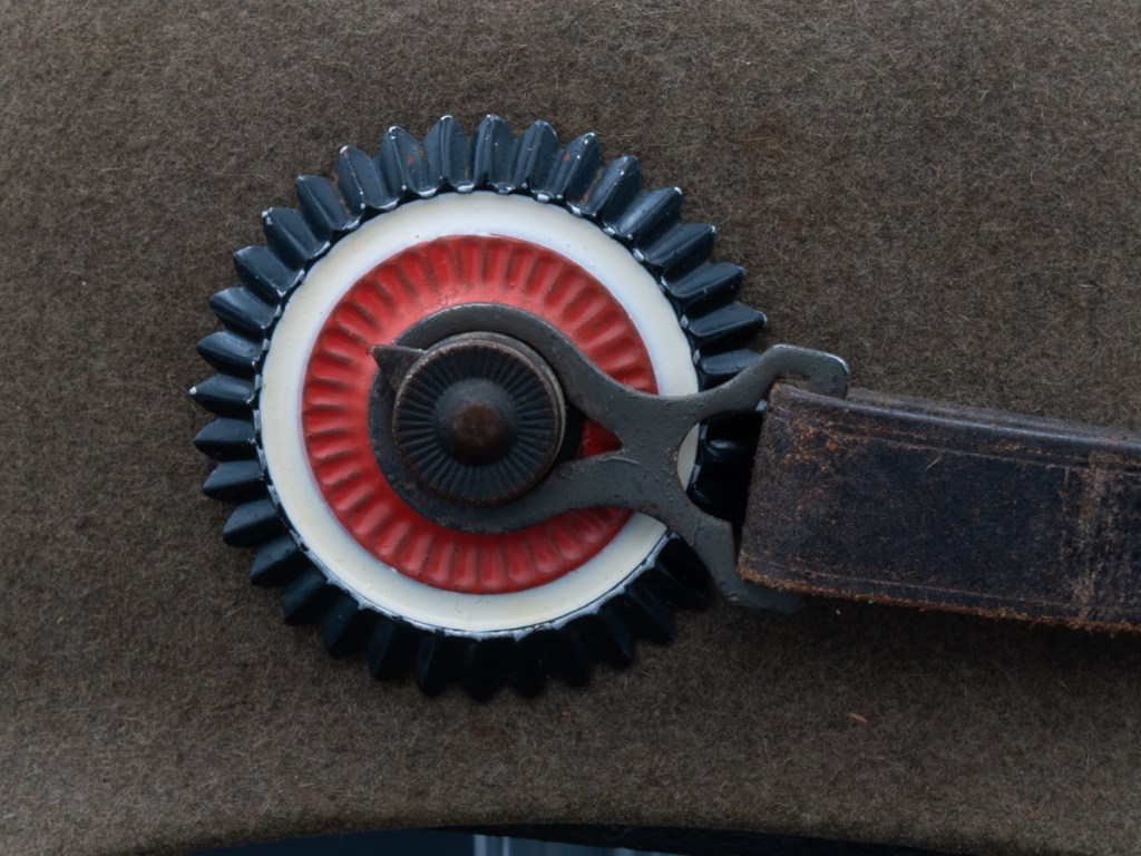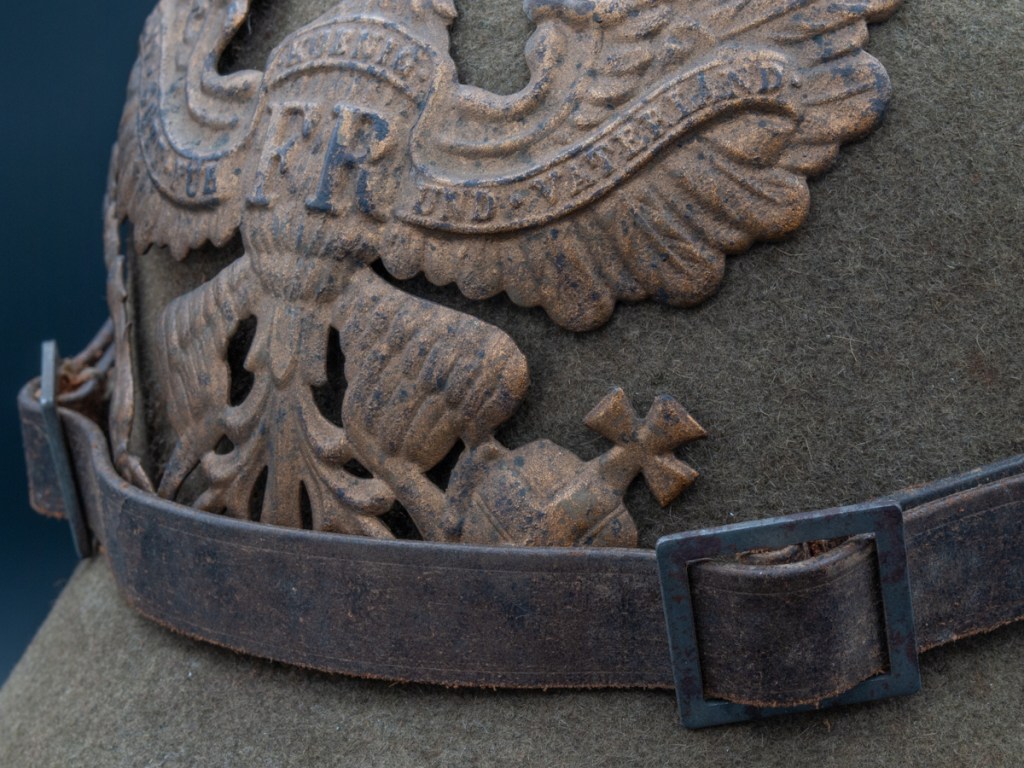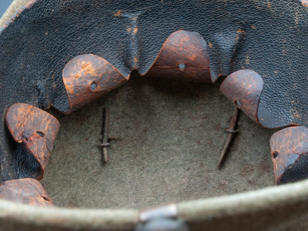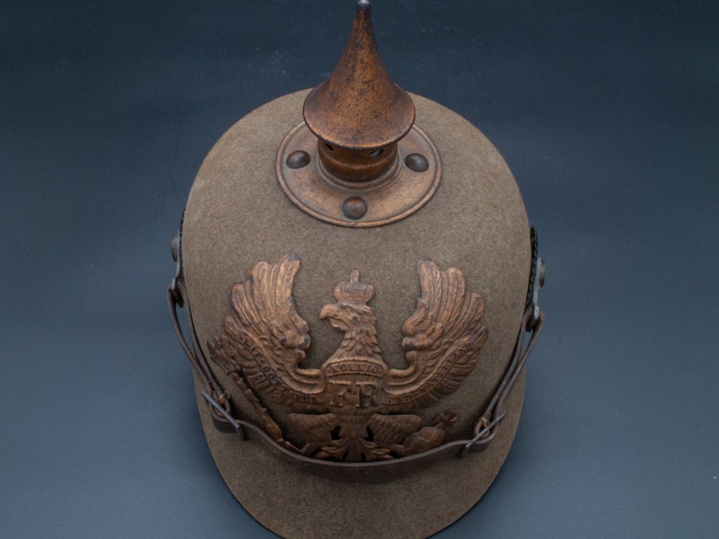 The chinstrap hardware is original and the chinstrap itself is a reproduction fashioned from vintage leather. The Prussian kokarde is original and the national colors kokarde is a reproduction. The helmet has a unit stamp on the rear visor, which is an unusual feature for ersatz pickelhaubes. The liner is loose, but still attached.