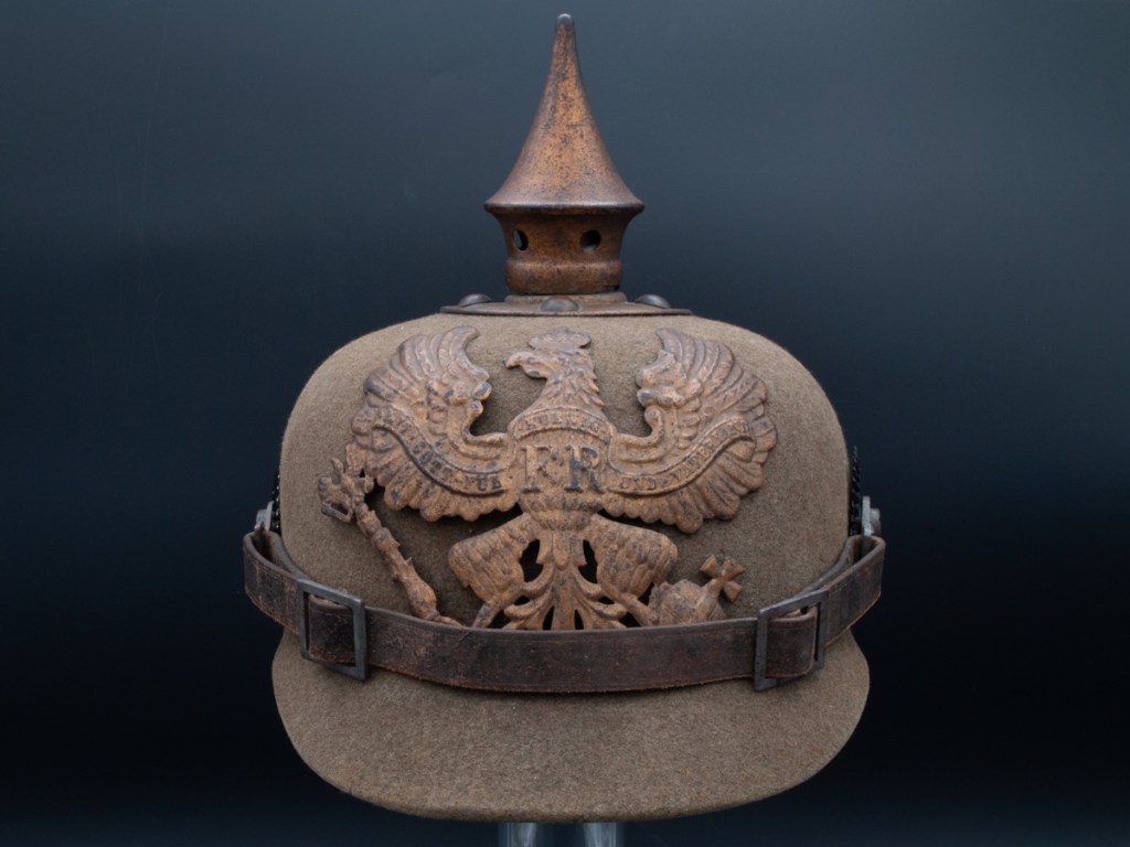 It a Model 1915 ersatz enlisted man’s Prussian pickelhaube. An unusual aspect of this helmet is that the spike and front plate were painted brass color. This was done a long time ago and by appearances it is a period modification. The helmet has been discussed on pickelhaubes.com. There are two theories that seem reasonable to me. One is that this was something done to enhance the helmet for the post-armistice souvenir trade that flourished after the end of the First World War. The other theory is that this was done at the unit level to make all the helmets within the unit uniform in appearance. There are other examples of pickelhaubes with brass painted hardware, so this was a thing.