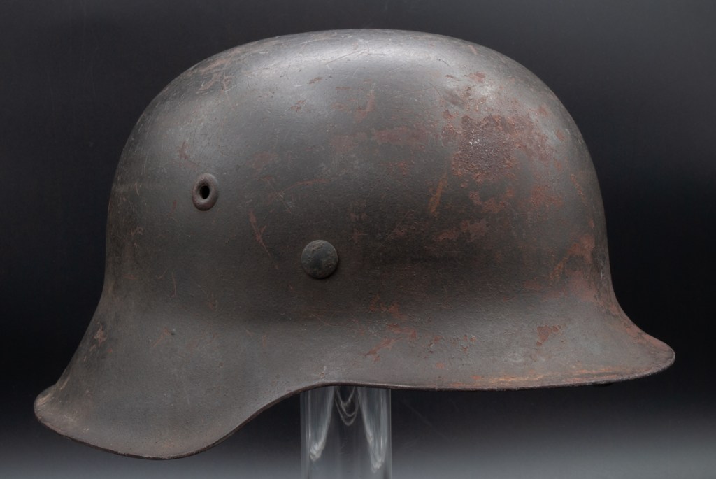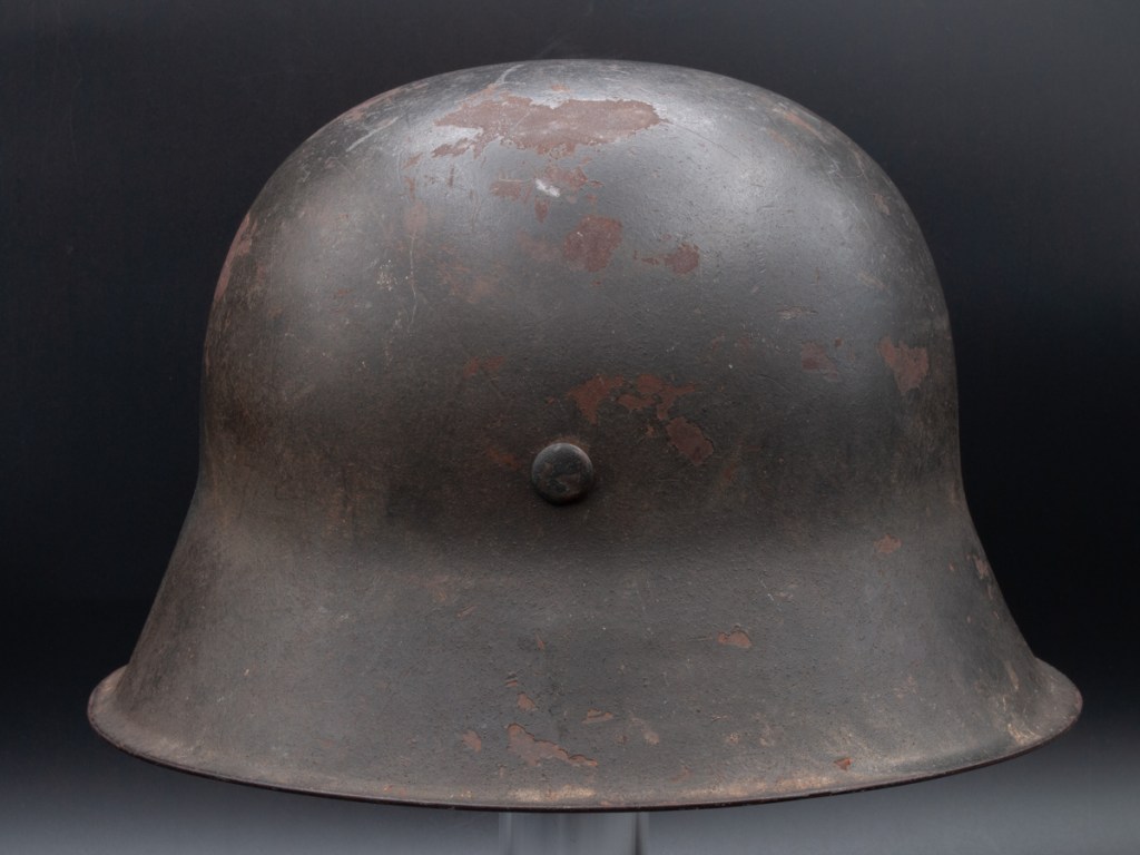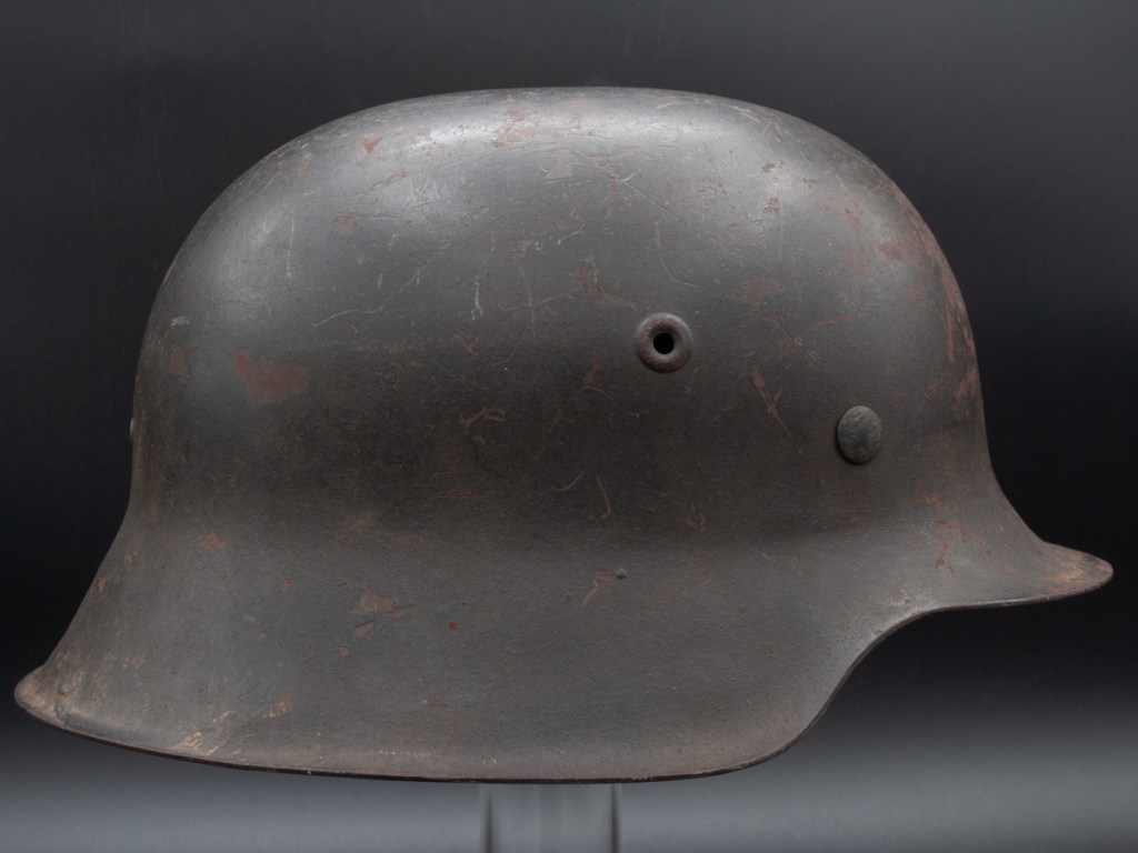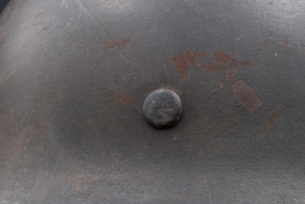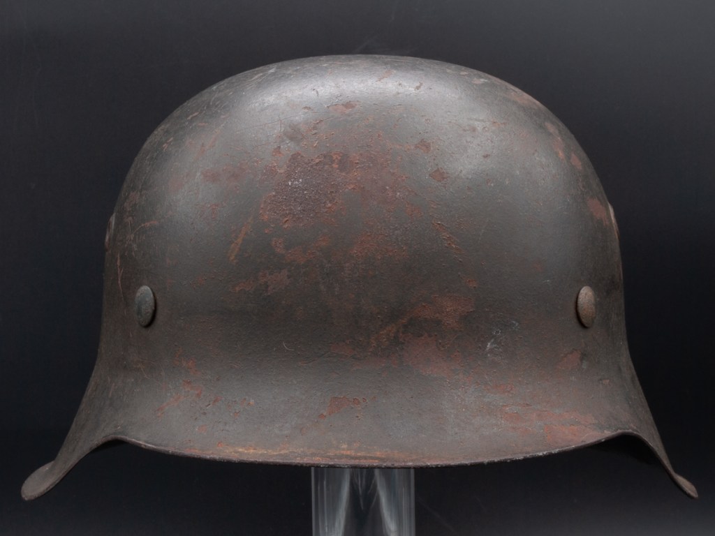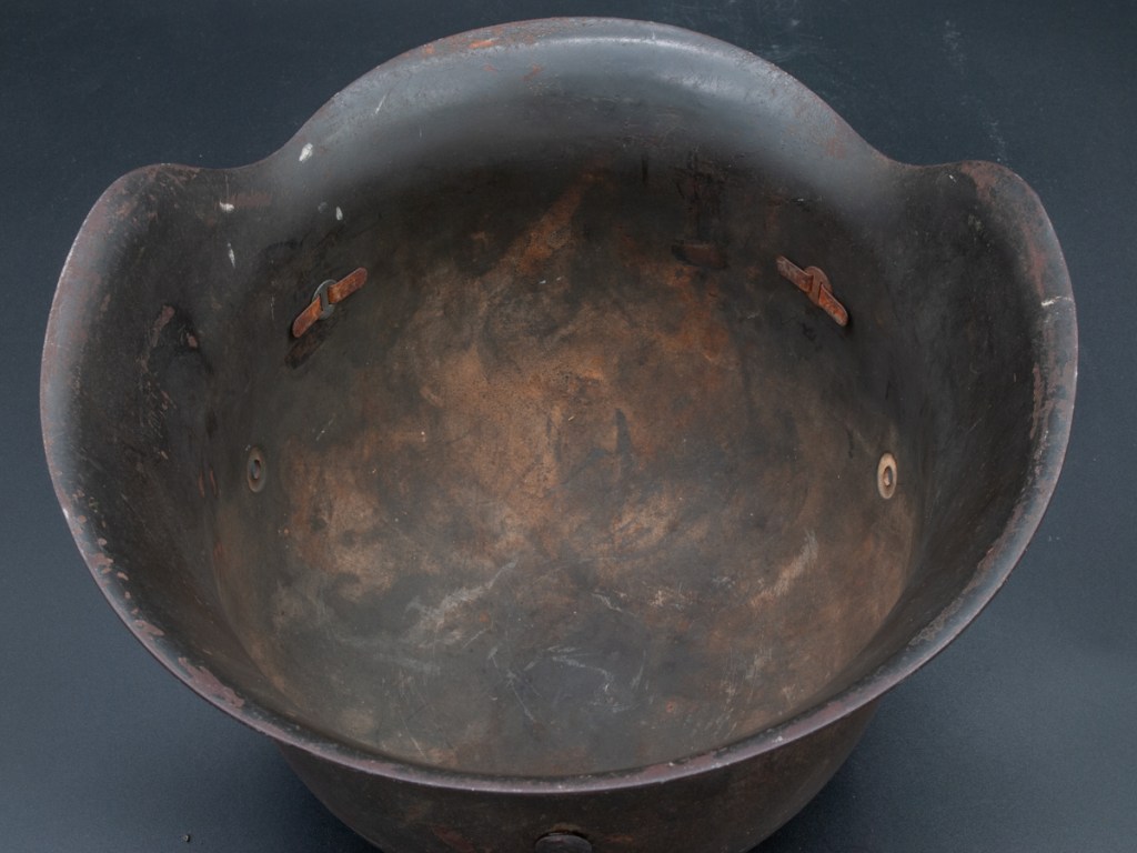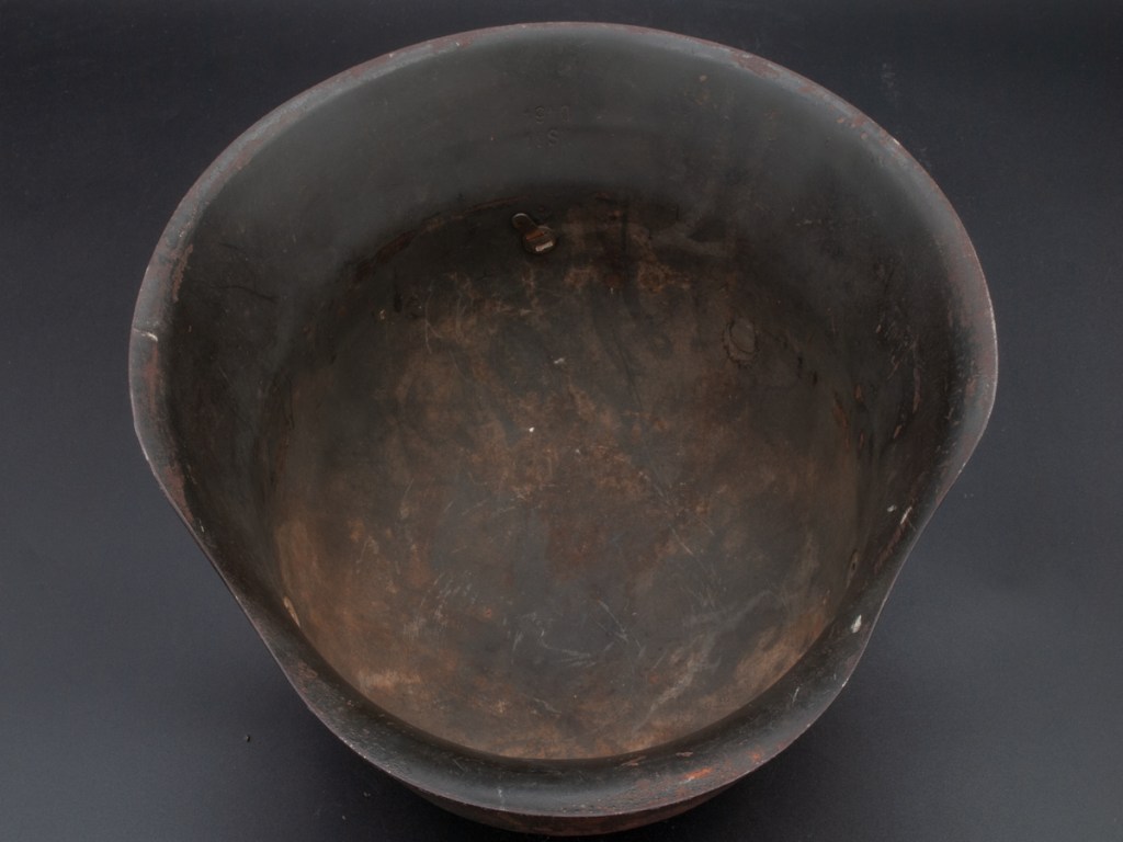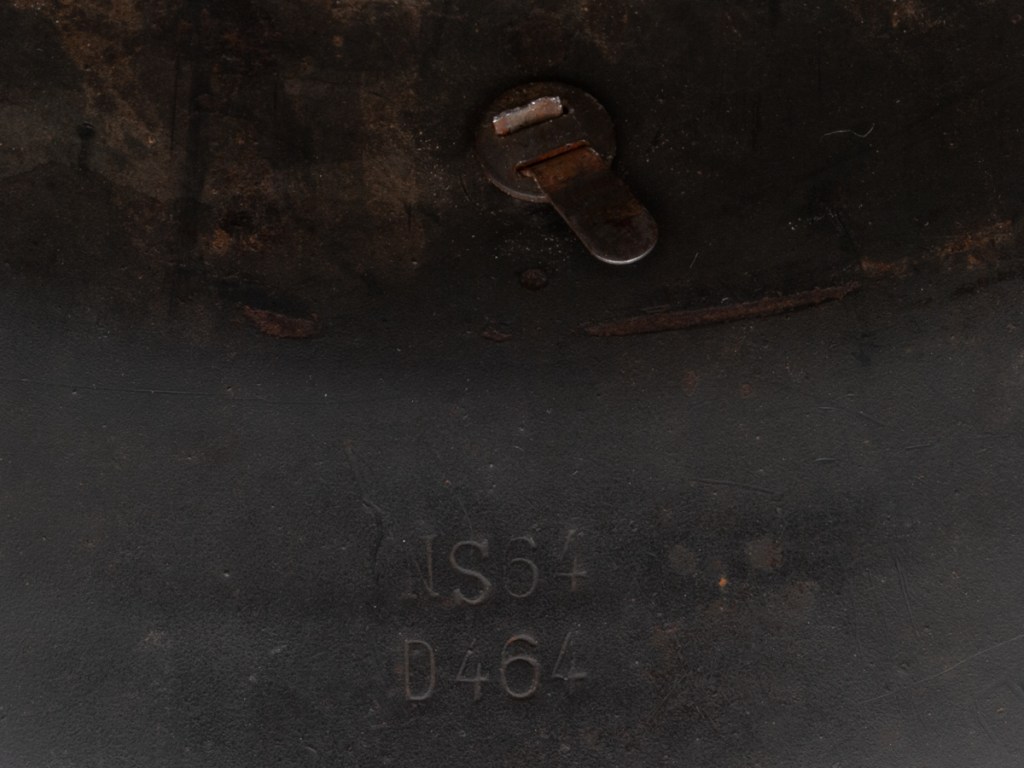 This M42 helmet surfaced recently in a flea market in North Carolina. It is a size 64 and is stamped “NS” for the Vereinigte Deutsche Nicklewerke factory in Schwerte, Ruhr. The lot number is D464. According to Brian Ice’s book[1], this places the production of this helmet sometime after August 1943 after the decal drop. The helmet lacks liner and chinstrap, but it has three original split pins and washers. The split pin in the rear has lost one arm. What I like about this piece is that it regains a good percentage of its original slate grey factor paint and has an appealing overall patina. It has great shelf appeal!