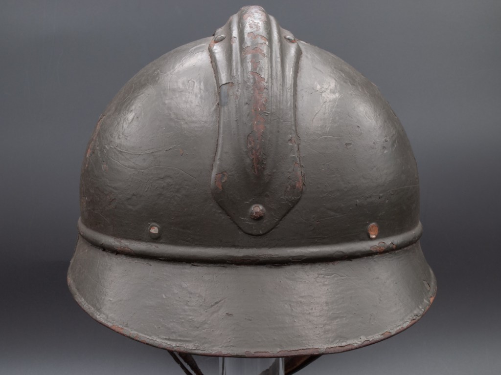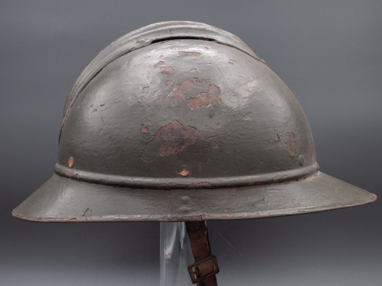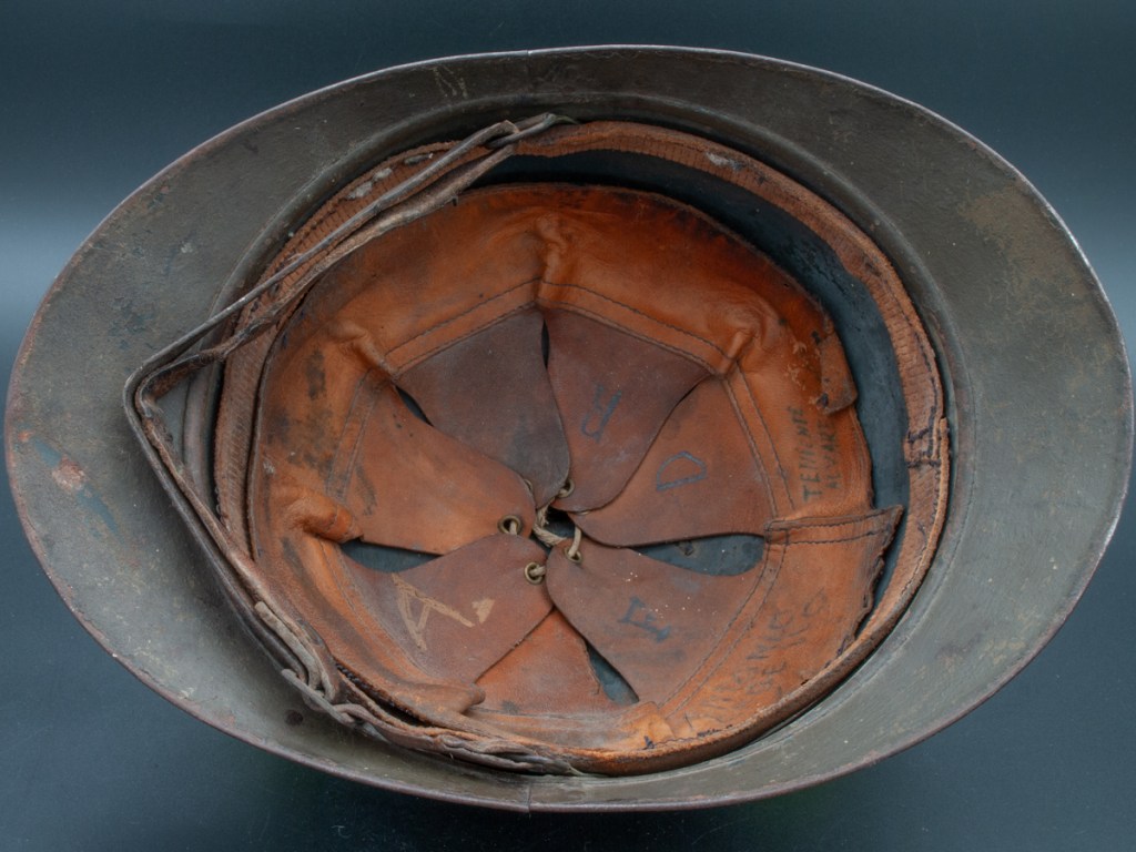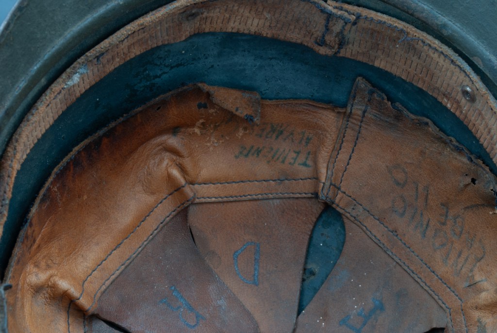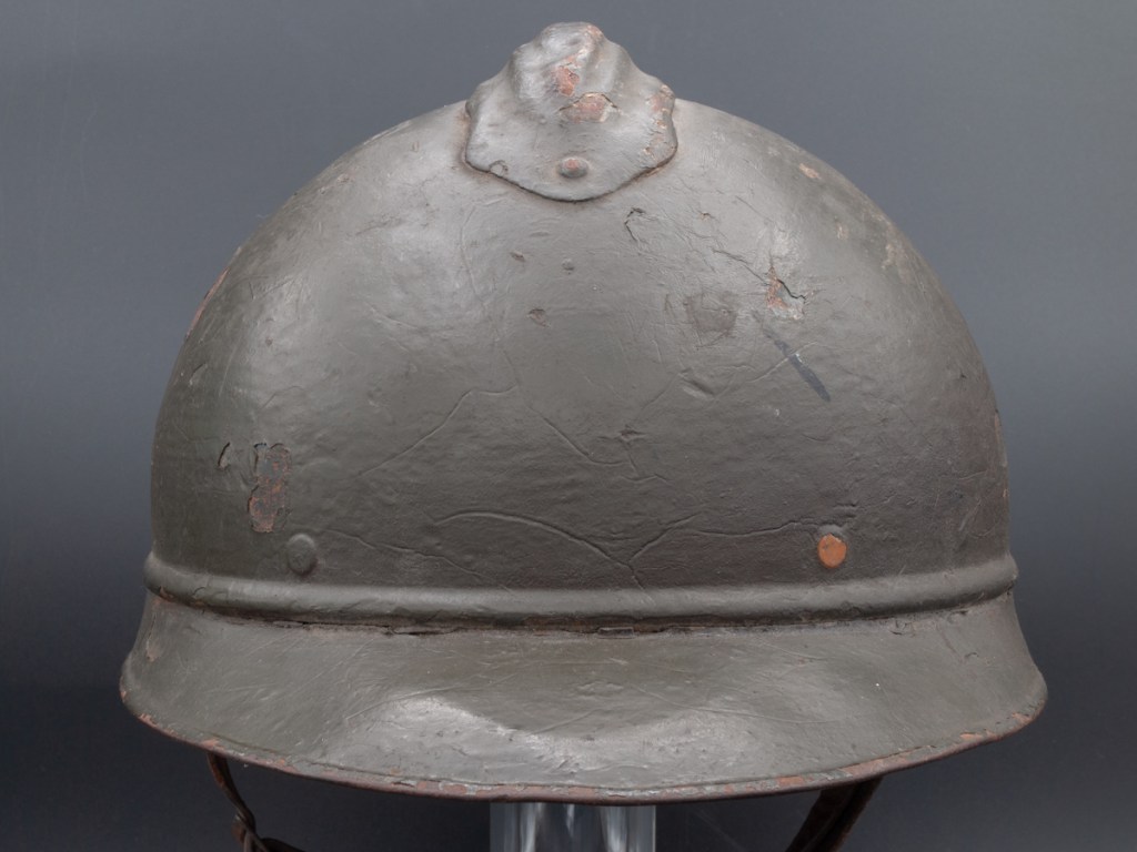General Information: Both the Republicans and Nationalists used a large number of French Model 1915 helmets. Model 1915 helmets used by the Republicans would have most likely been sourced from France while those used by Nationalists we may presume would have generally come from Italy and were surplus French export helmets from the First World War. The Spanish-used M15s are almost always found with Spanish-made replacement liners. Surviving examples typically are hand painted green or brown with a thick paint that tends to flake off over time. If badge holes were present in the original helmets, these holes were usually soldered over.