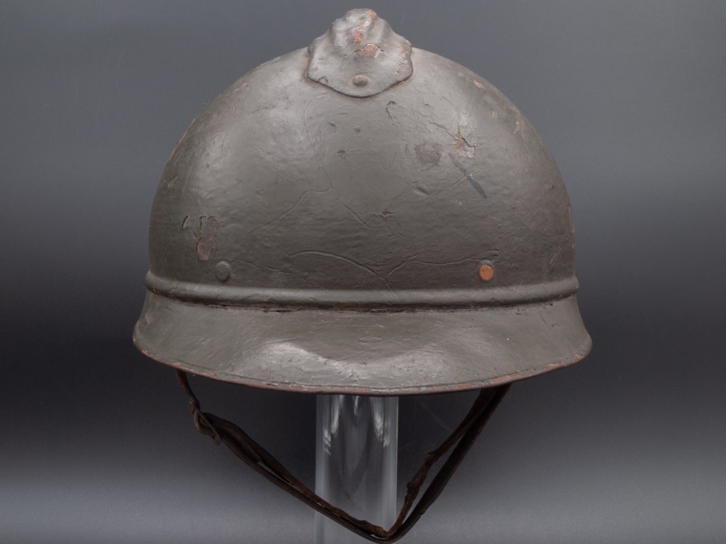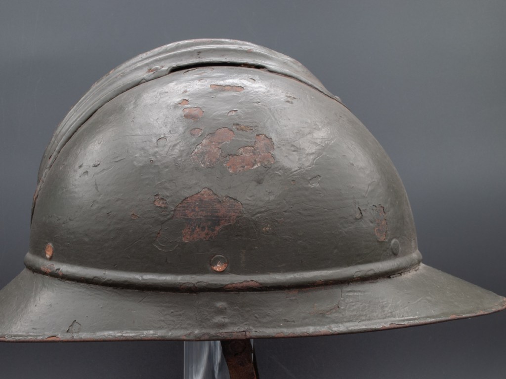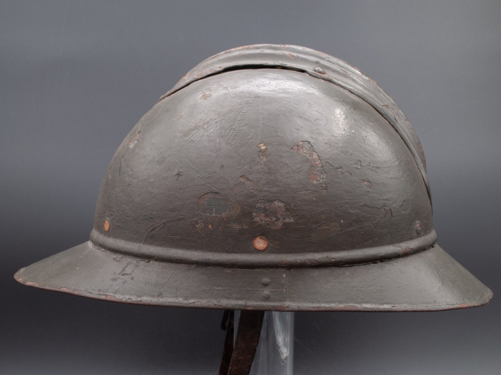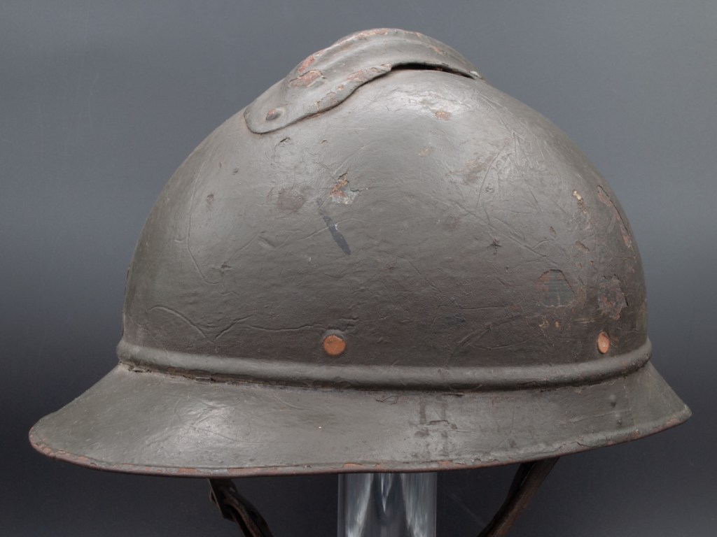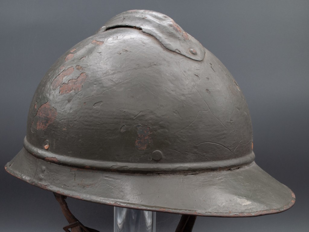 General Information: Both the Republicans and Nationalists used a large number of French Model 1915 helmets. Model 1915 helmets used by the Republicans would have most likely been sourced from France while those used by Nationalists we may presume would have generally come from Italy and were surplus French export helmets from the First World War. The Spanish-used M15s are almost always found with Spanish-made replacement liners. Surviving examples typically are hand painted green or brown with a thick paint that tends to flake off over time. If badge holes were present in the original helmets, these holes were usually soldered over.