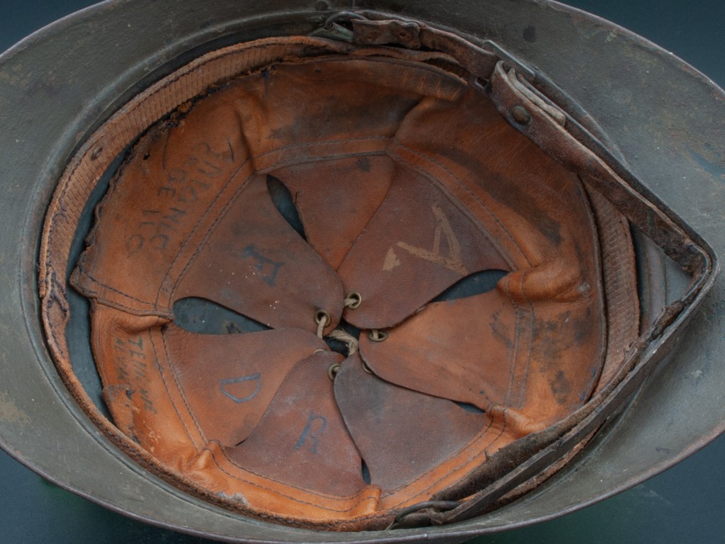 This example has a typical Spanish replacement liner and chinstrap. The replacement liner is attached via six steel brackets to the shell. These brackets, which are absent on the factory original M15s, are a quick visual indicator that a helmet is a relic of the Spanish Civil War.