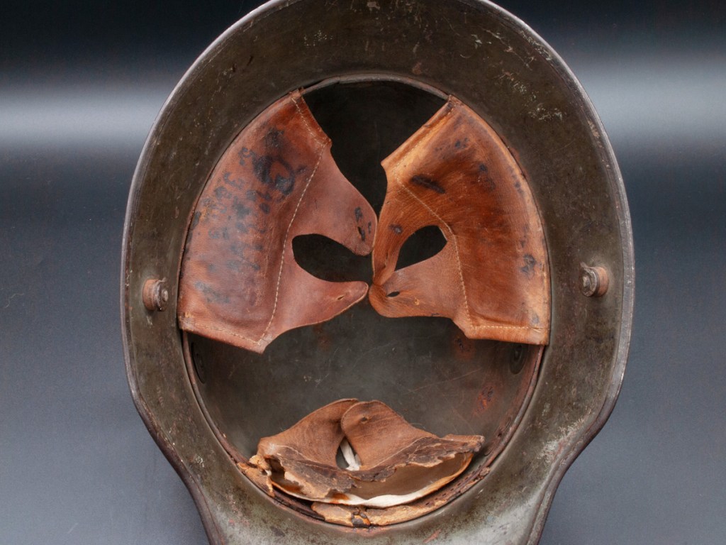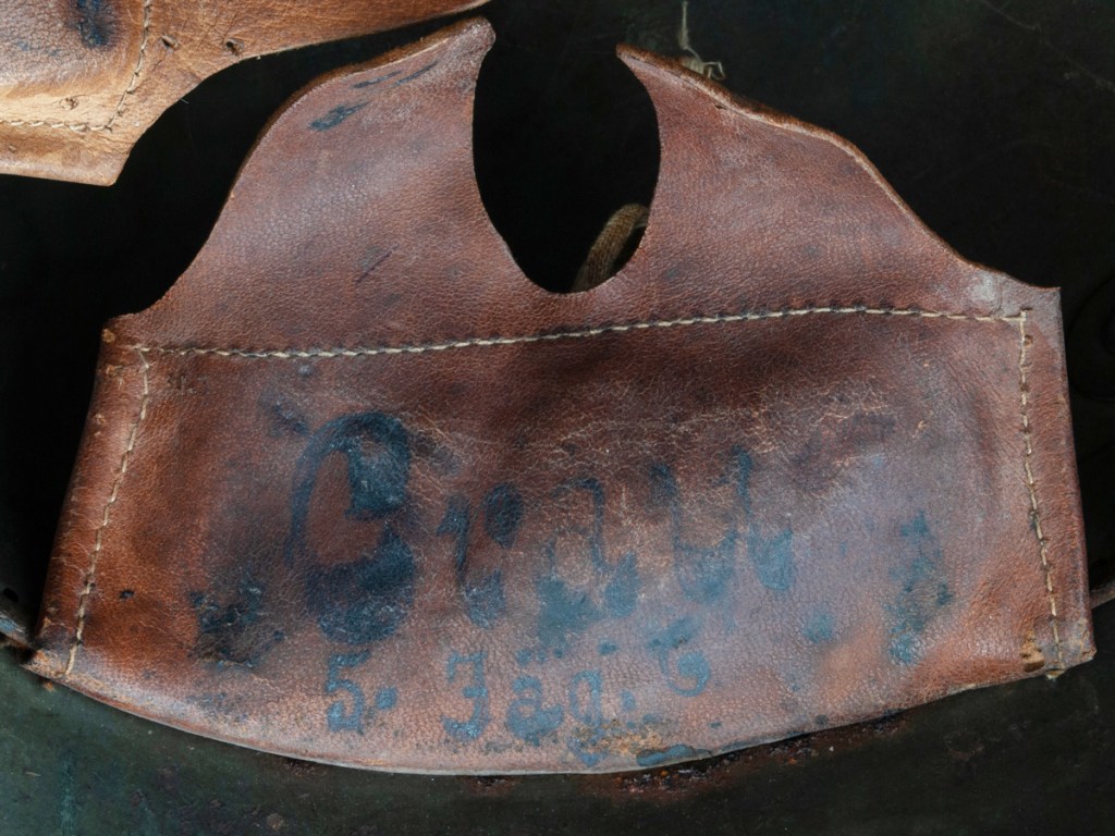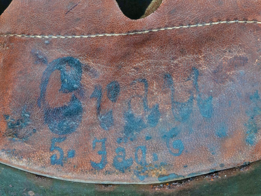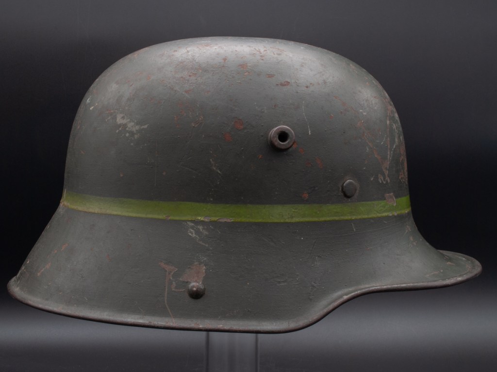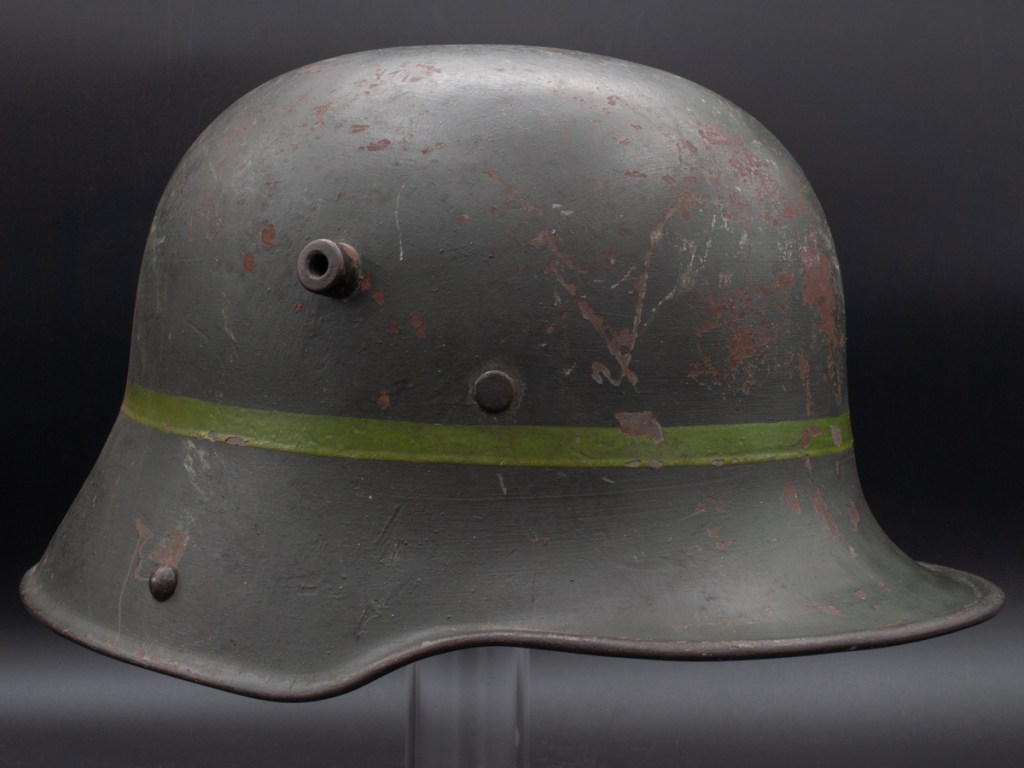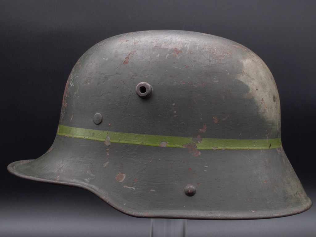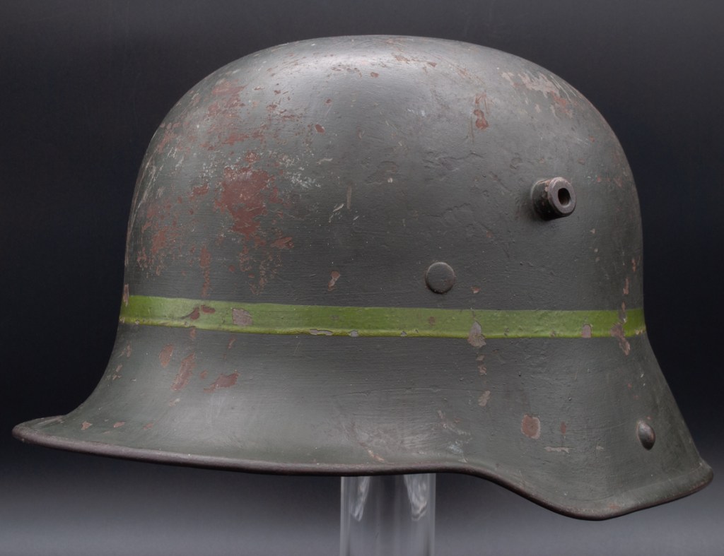 Displayed Example: I purchased this helmet in 2023 from a collector in Ontario, Canada, who in turn bought it from another collector. Unfortunately, the rest of its history has been lost. The Ontario seller had posted pictures of the helmet on a collector website asking what other collectors thought it might be.[5] Two forum members responded saying that the markings on the liner looked like those of a Freikorps unit. The first part of the markings is difficult to read, but it appears to be “Cvau 5. Jäg G.” In private communication with the forum moderator[6] he suggested the markings could correspond to Freiwilliges Jägerbataillon 5 which was a Freikorps unit. Subsequently, I found a reference to a Freikorps officer who served in a Jägerbataillon 5 that was part of the Freiwilliges-Regiment Berlin in 1919.[7] The prewar Imperial German Jäger units wore dark green uniforms. The dark green band on this helmet, therefore, could harken back to that tradition. Based on available information, my best guess is that this is a helmet that belonged to a Freikorps soldier serving in Jägerbataillon 5 of Freiwilliges-Regiment Berlin in the immediate postwar period.