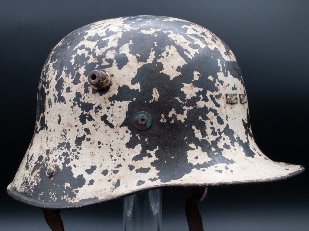 General Information: The army of the Irish Free State used the Model 1927 helmet from 1927 to 1939. After this period, the helmets were painted white and issued to the Civil Defense forces. The helmets were copies of the German Model 1916. The famous British firm, Vickers, manufactured 10,021 of the M27s. Vickers used low quality steel that provided little ballistic protection. Because of the weak material, surviving examples often have dents. Each helmet is individually numbered by a stamp on the rear visor. The “H” preceding the number signifies “helmet.” In the same location there is a “V. Ltd.” for Vickers Limited. The M27s came in two sizes: Large and Small. The shell size is indicated at the top of the stampings on the rear visor with a “+” indicating large and a “-“ indicating small. Collectors often refer to the M27 as the Irish “Vickers” helmet.